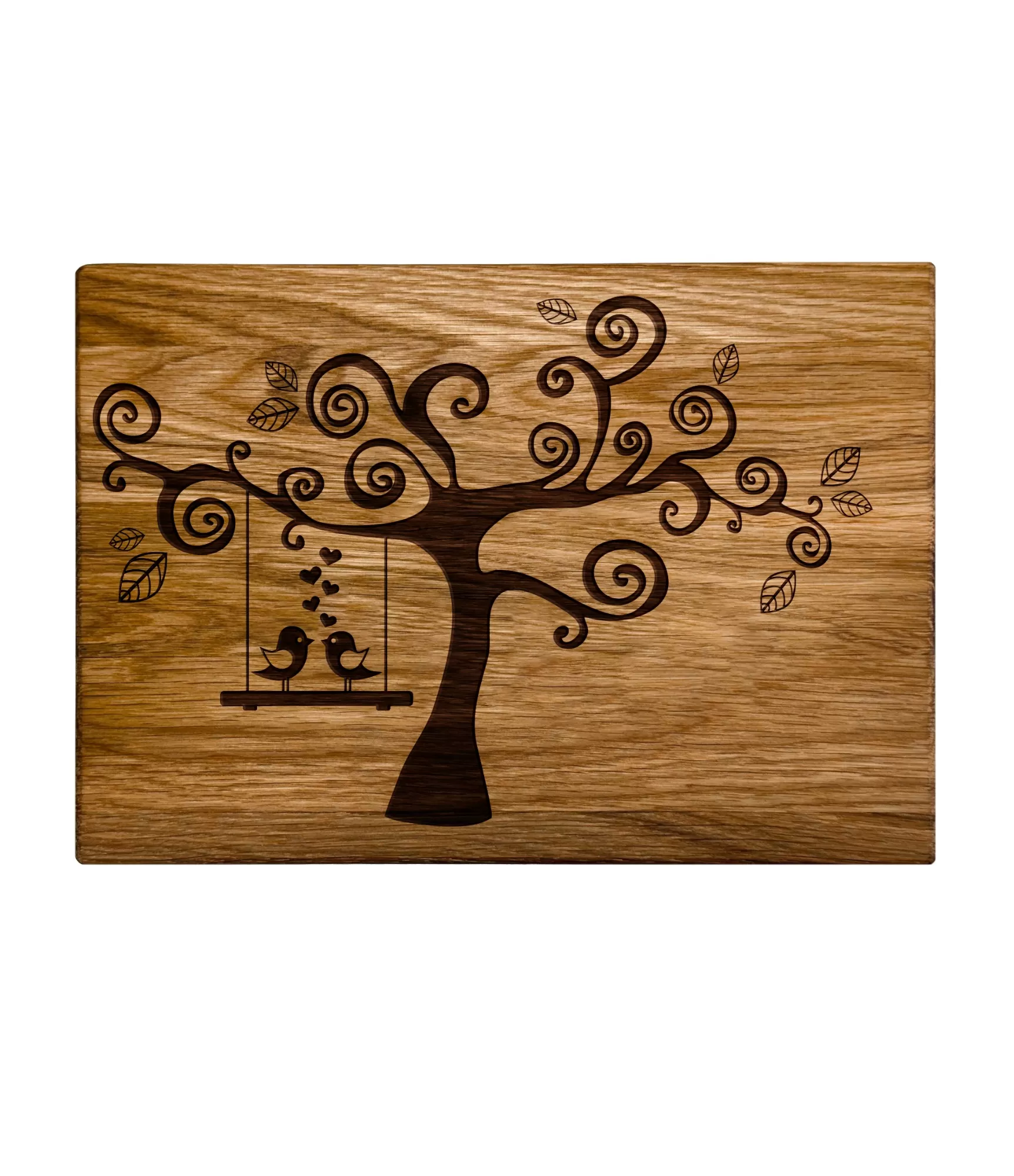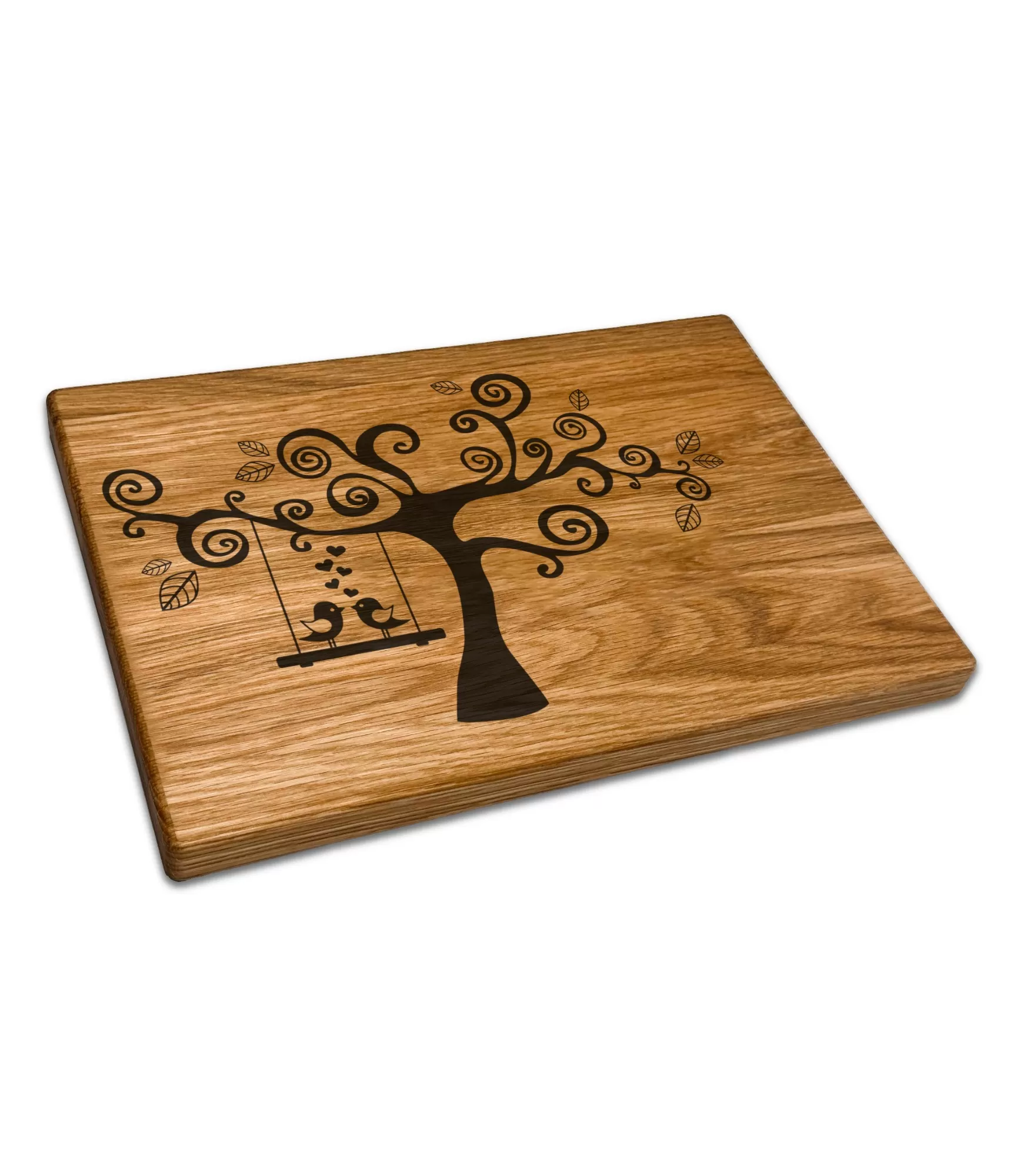 Ąžuolinė pjaustymo lentelė "Meilės medis CB-26P3" išsiskiria elegantišku medžio ir paukščių motyvu, kuris perteikia artumą ir šilumą. Ant sūpynių sėdintys paukščiai ir subtilios širdelės kuria jaukią ir žaismingą nuotaiką, todėl gaminys tampa ne tik praktiškas, bet ir vizualiai patrauklus. Tai stilingas virtuvės akcentas, kuris papildo interjerą ir suteikia jam gyvybės. Lentelę galima naudoti iš vienos pusės gaminti maistą, o iš kitos pusės patiekti užkandžius ar serviruoti stalą.