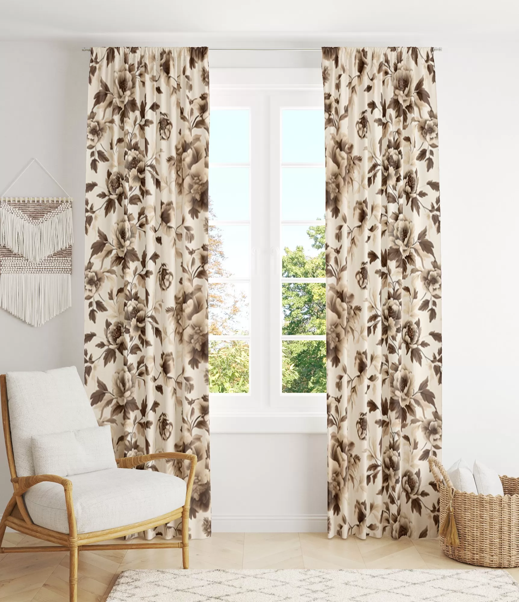 Rudos spalvos bijūnų raštas puikiai atsiskleidžia šviesiame fone. Natūralių spalvų gama leis užuolaidoms akcentuoti bet kurį klasikinį interjerą. Toks sprendimas puikiai tinka svetainei, miegamajam ar valgomojo erdvėms, kur klasikinio stiliaus akcentai pabrėžia namų eleganciją.