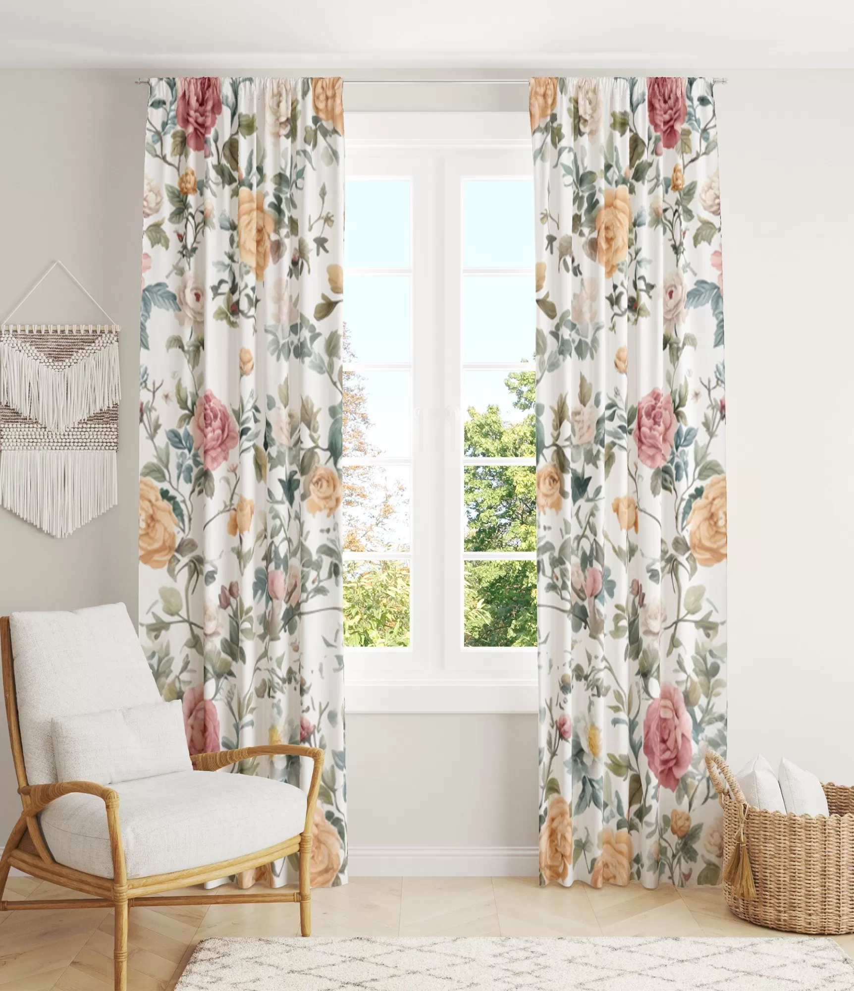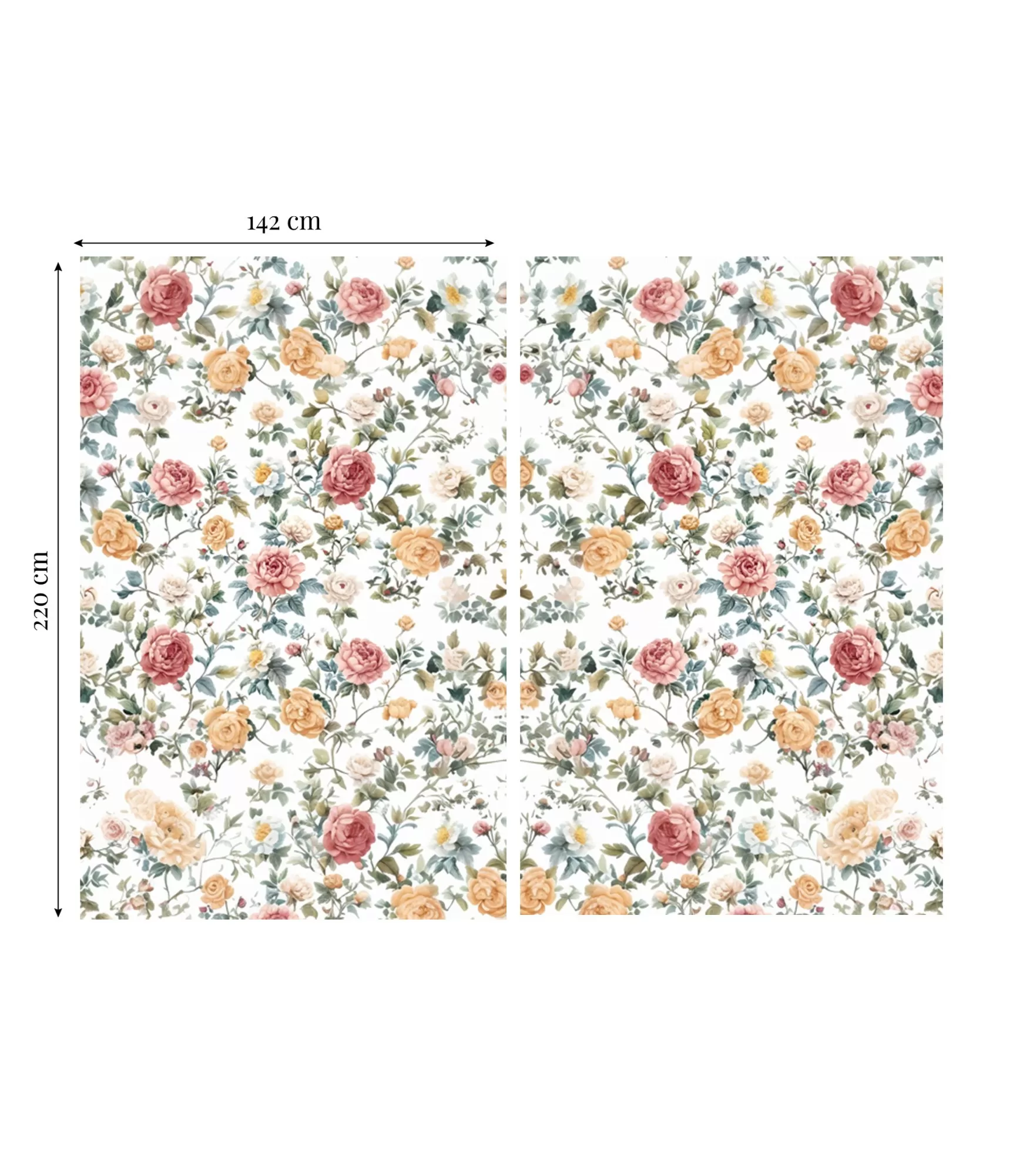 Šios dieninės užuolaidos – tai puikus pasirinkimas tiems, kurie mėgsta klasikinį stilių ir nori į savo namus įnešti švelnios elegancijos. Užuolaidų raštas su klasikiniais bijūninių rožių motyvais – persikų, rožinės ir raudonos spalvų deriniu – suteikia šilumos ir jaukumo bet kuriai erdvei. Šis margas gėlių raštas puikiai papildys klasikinio stiliaus virtuvę arba svetainę, kuriose vyrauja mediniai baldai ir natūralios medžiagos, arba taps išskirtiniu akcentu tradicinio interjero sodyboje.