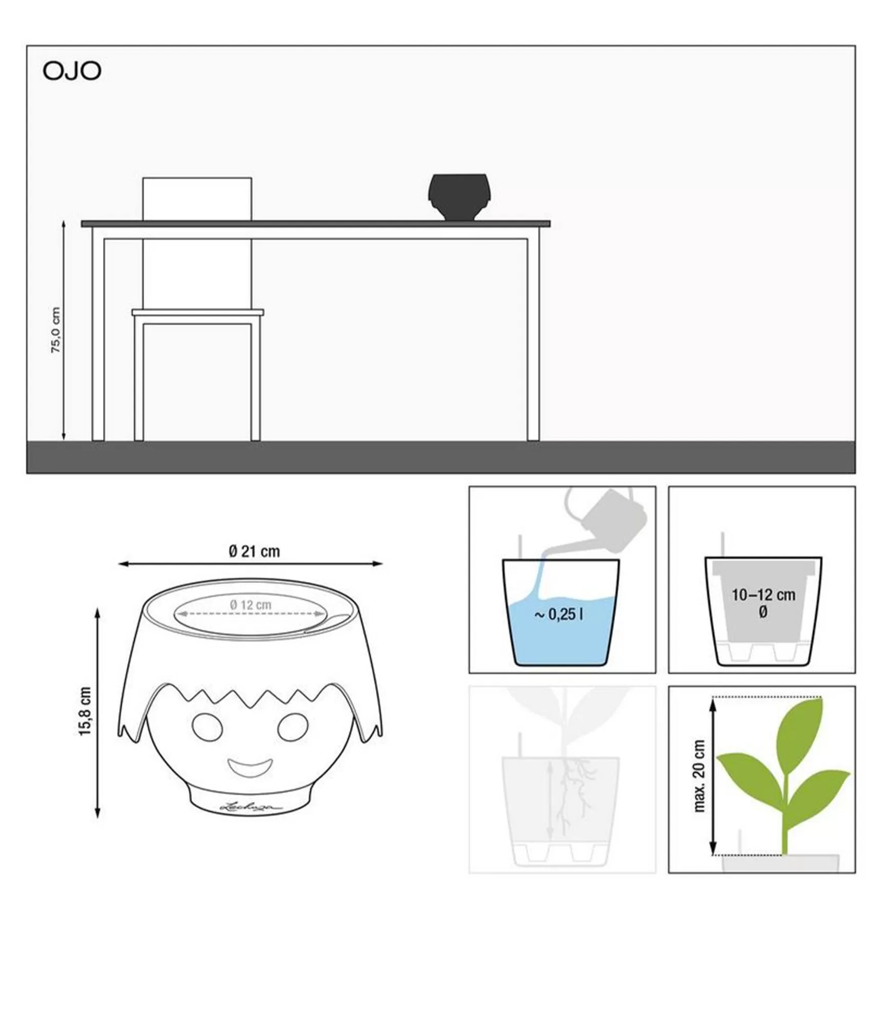 Dagties tipo strypelio drėkinimo sistemos dėka į šį sodinuką mažus augalus galima įdėti į vazoną tiesiog kartu su vazonėliu, kuriame jis buvo auginamas, taip išvengiant sudėtingų persodinimų! Įkištas į auginimo vazonėlio dugną, dagties tipo strypelis tolygiai tiekia drėgmę šaknims. Didelės, apvalios OJO akys primena „PLAYMOBIL“ žaislams būdingą išvaizdą. Jos parodo, kiek vandens liko rezervuare ir leidžia vaikams išmokti sekti jų augalų drėgmės lygį. Jei interaktyvios akys yra mėlynos, tai rodo, kad vandens rezervuaras yra pilnas.