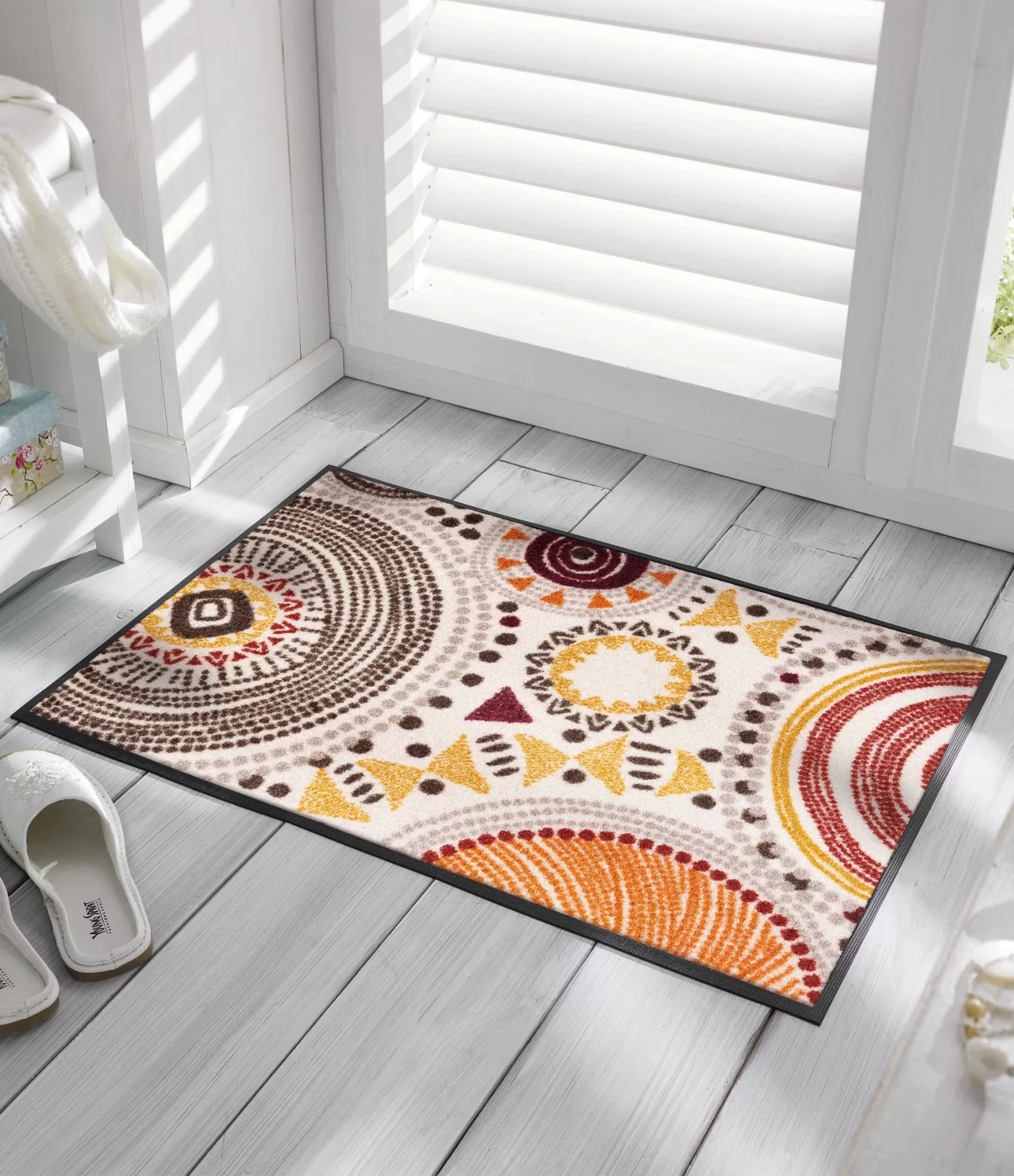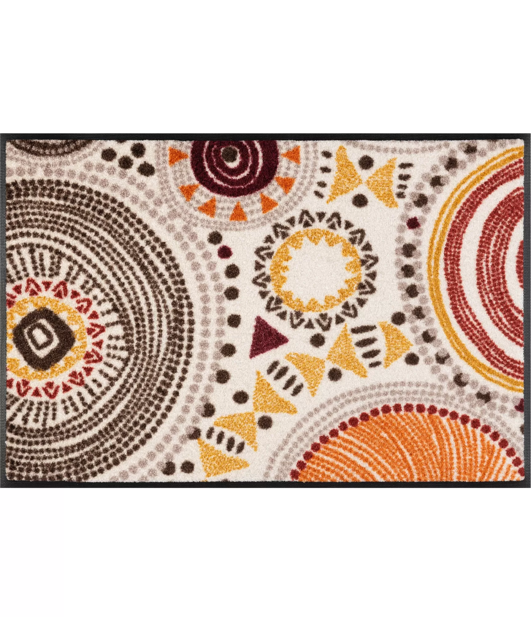 Durų kilimėlis „Boho Style“ išsiskiria žaismingu, dekoratyviu raštu, kuris iš karto patraukia akį ir suteikia erdvei gyvybingumo. Paviršiuje dominuoja apskritimų, taškelių ir geometrinių elementų kompozicija, primenanti bohemišką stilių ir rankų darbo ornamentiką. Šiltų atspalvių – rudos, oranžinės, garstyčių ir bordo – derinys sukuria jaukumo pojūtį, todėl šis modelis puikiai tinka namams, kuriuose vertinamas išskirtinis charakteris ir individualumas.