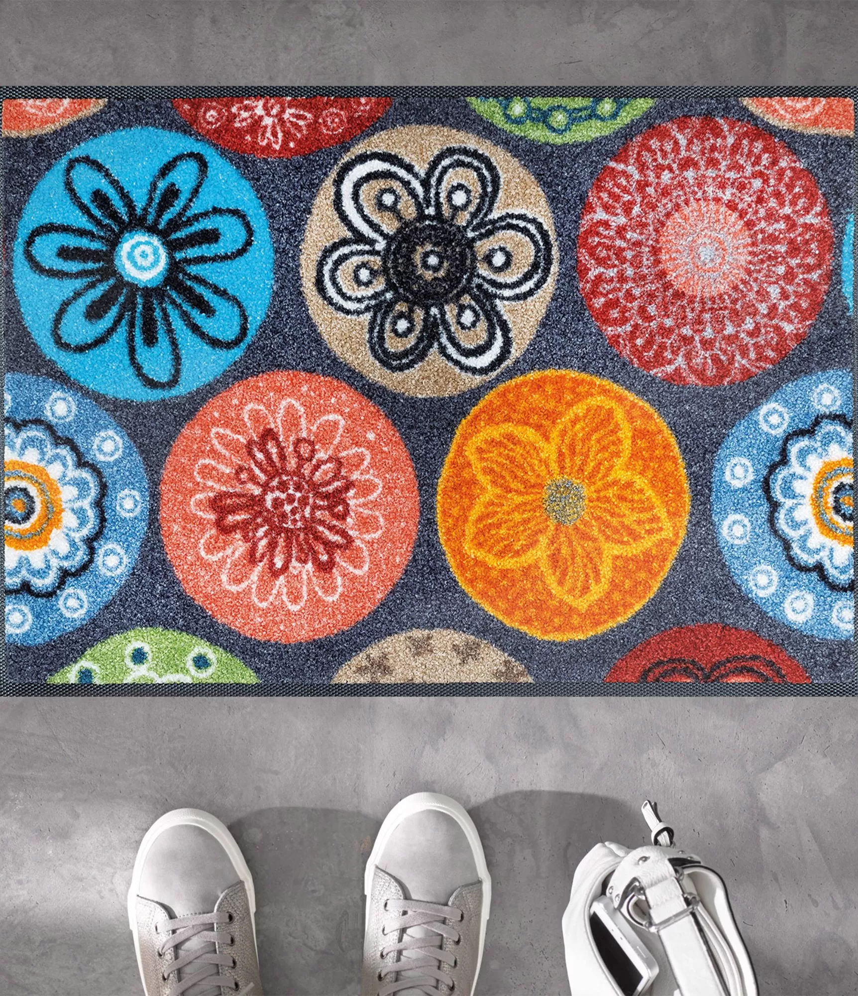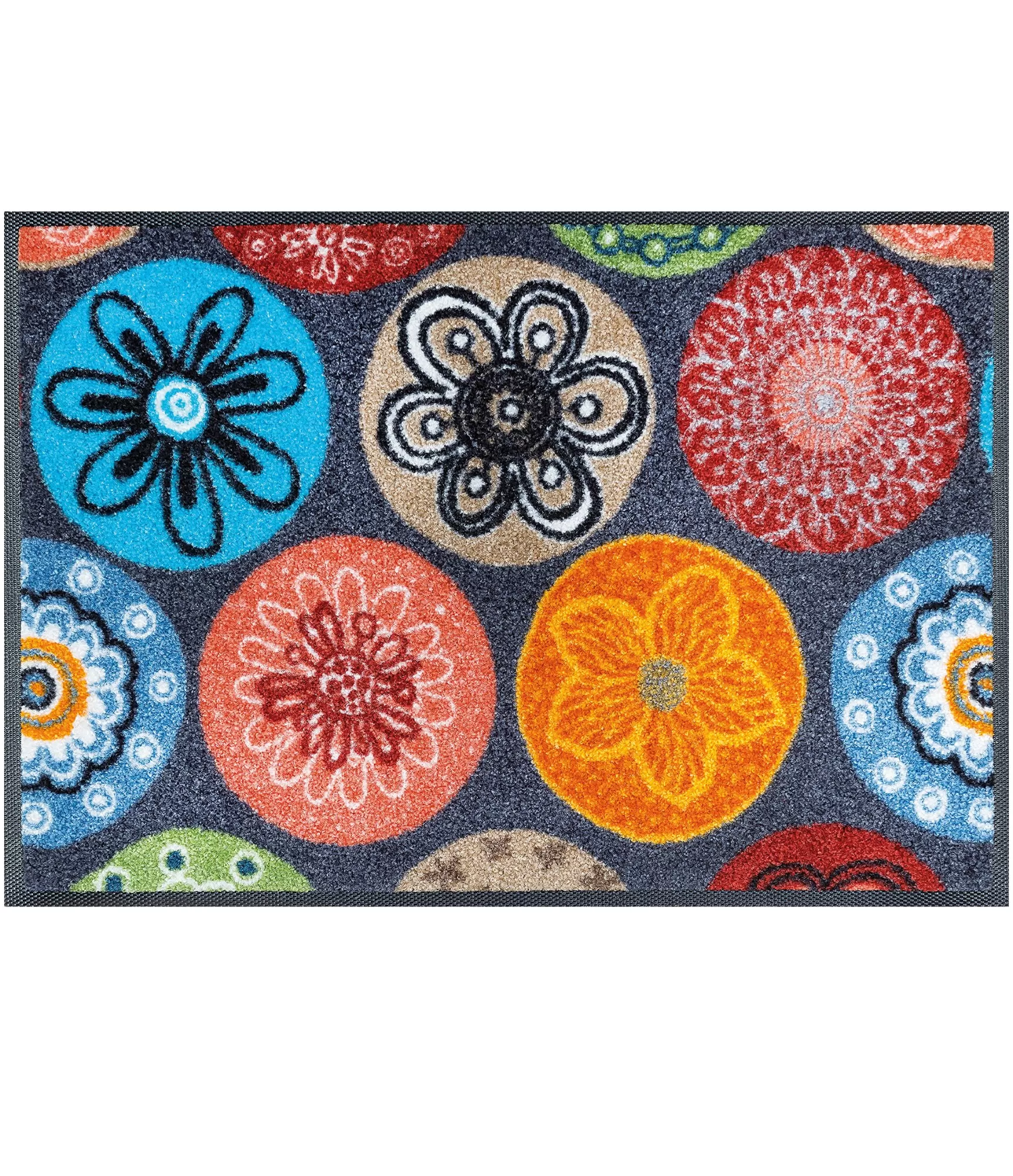 Plaunamas durų kilimėlis Coralis iš karto patraukia dėmesį savo ryškiu ir gyvybingu dizainu. Spalvingi apskritimų motyvai su subtiliais ornamentais kuria žaismingą, bet kartu ir estetiškai subalansuotą vaizdą. Šis kilimėlis puikiai tiks norintiems įnešti daugiau spalvų į savo namų aplinką ir sukurti išskirtinį pirmąjį įspūdį vos įžengus pro duris.