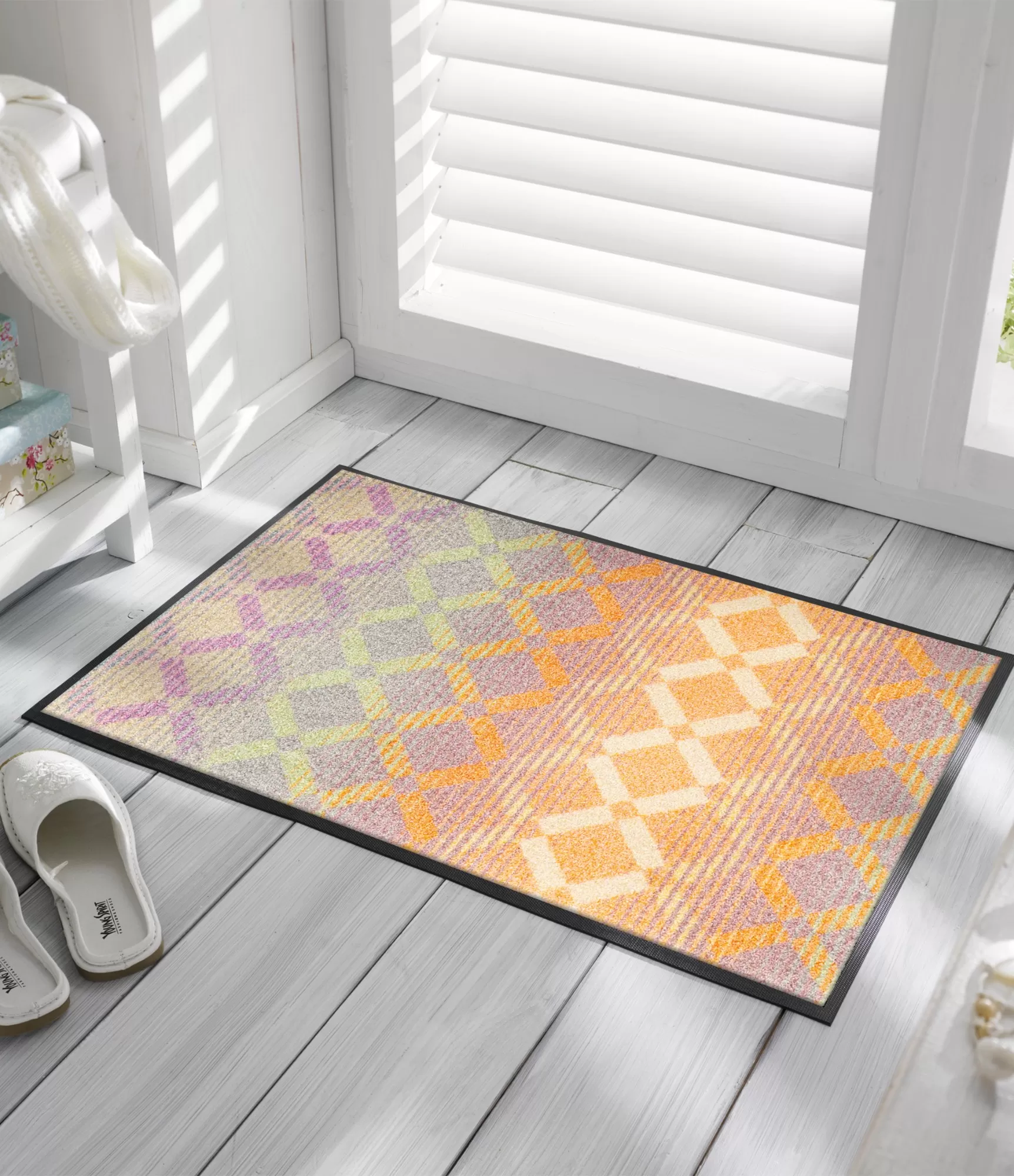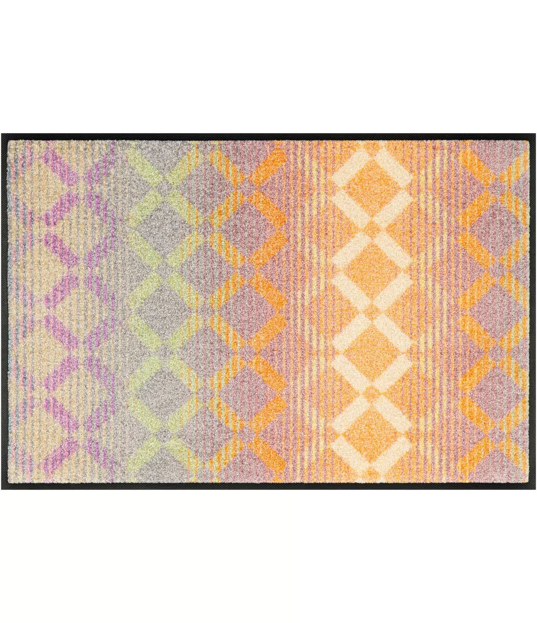 Durų kilimėlis „Diamond Melody“ išsiskiria žaismingu geometriniu dizainu, kuriame susipina rombų formos ir švelniai pereinančios spalvos. Pasteliniai oranžiniai, gelsvi, pilkšvi ir violetiniai tonai sukuria lengvą, šiltą ir jaukią nuotaiką. Raštas atrodo dinamiškas, tačiau neperkrautas, todėl kilimėlis tampa subtiliu, bet pastebimu interjero akcentu.