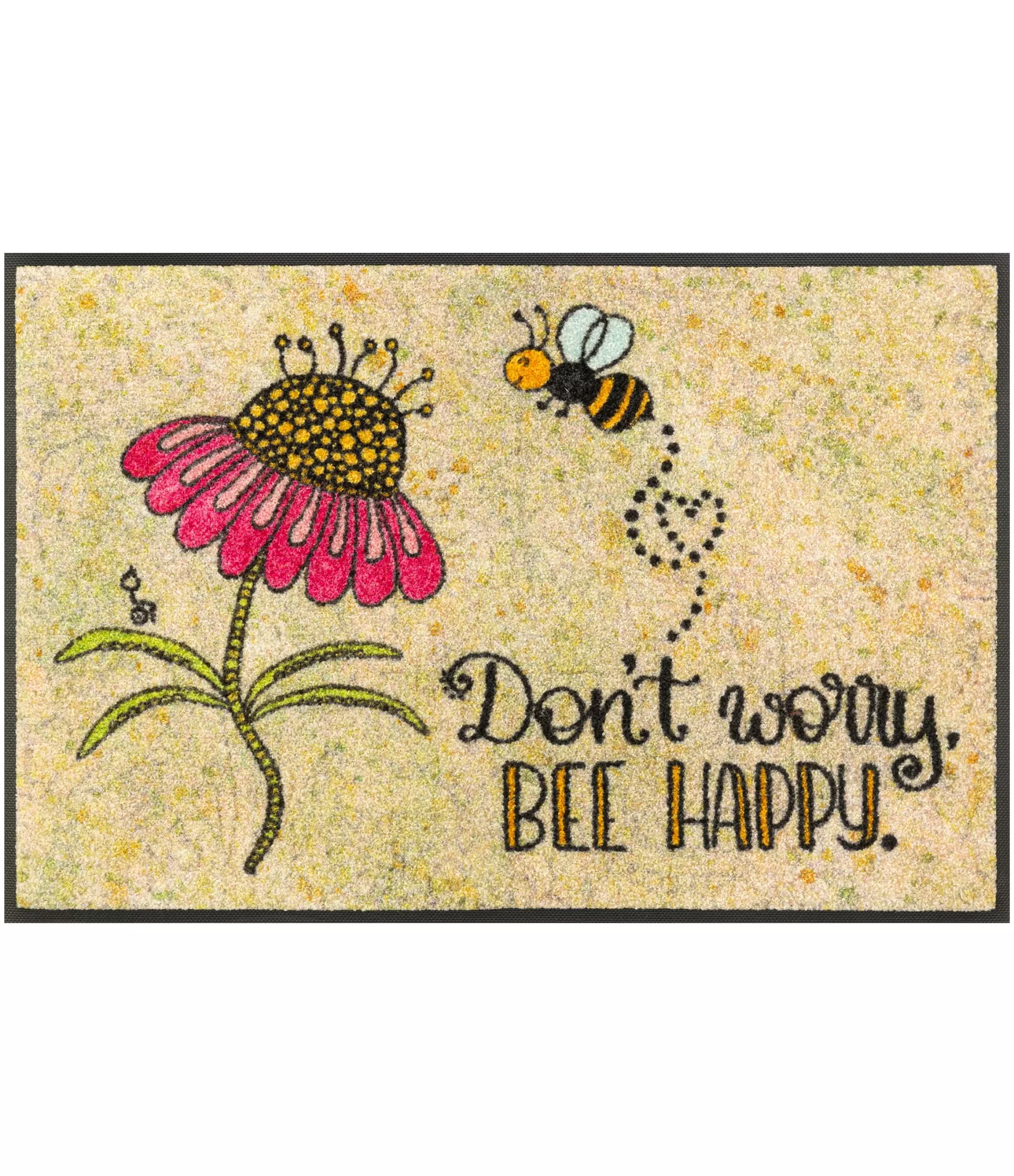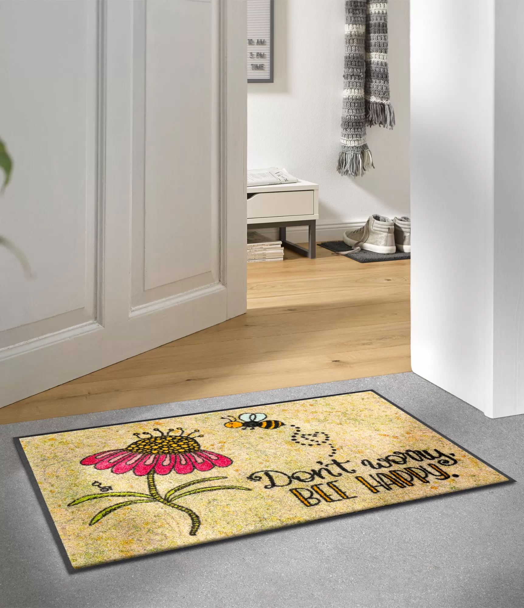 Durų kilimėlis „Don’t worry Be Happy“ iš karto sukuria gerą nuotaiką vos įžengus į namus. Šviesiame fone pavaizduota stilizuota gėlė ir linksma bitė, o užrašas su pozityvia žinute suteikia lengvumo ir šilumos pojūtį. Subtilūs geltoni, rožiniai ir juodi akcentai kuria harmoningą, gyvybingą kompoziciją, kuri puikiai tiks tiek moderniems, tiek jaukiems namams.