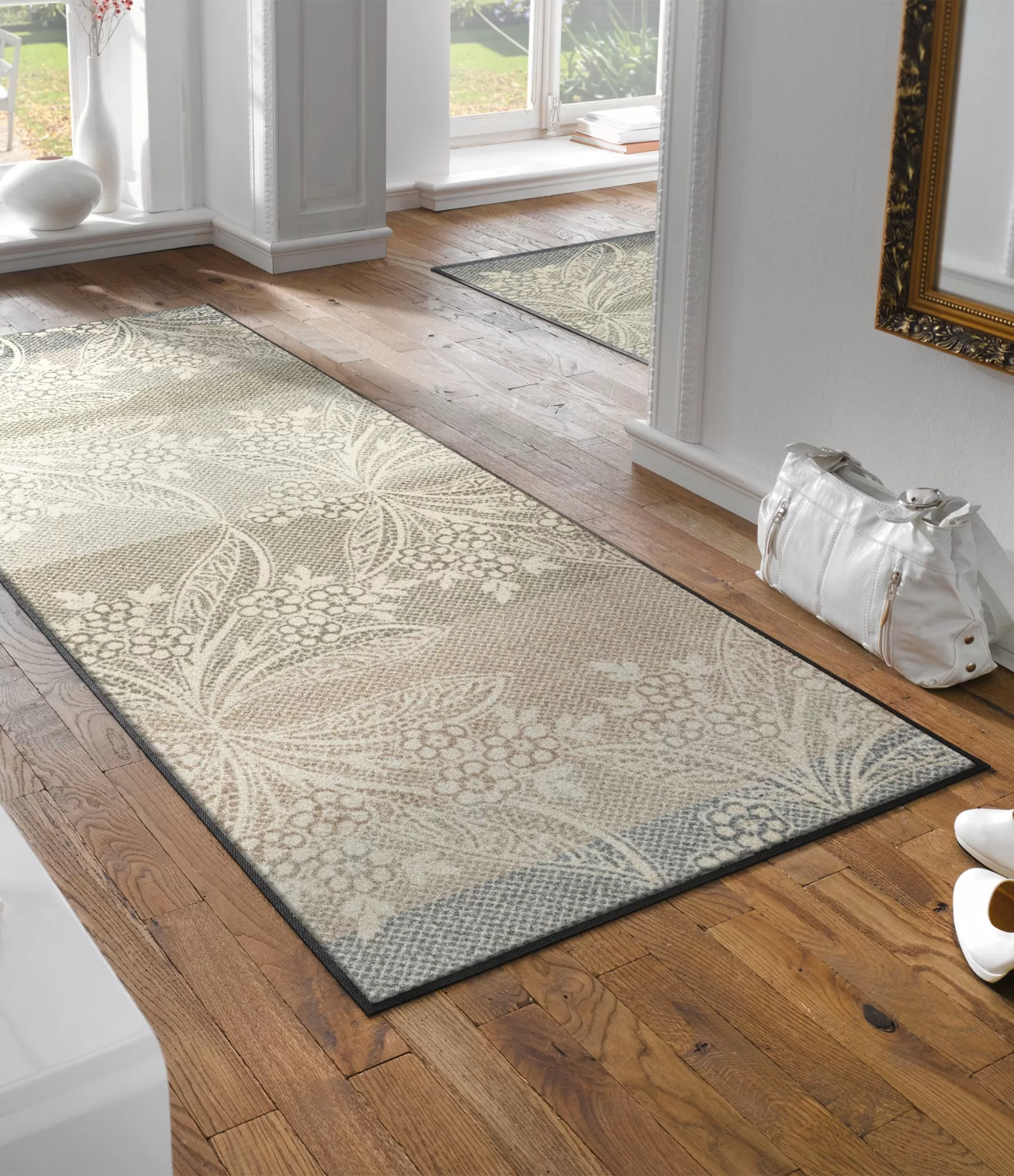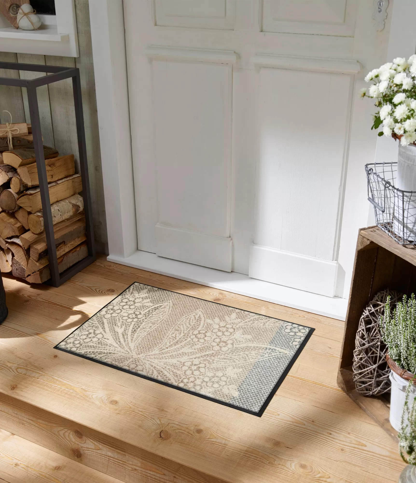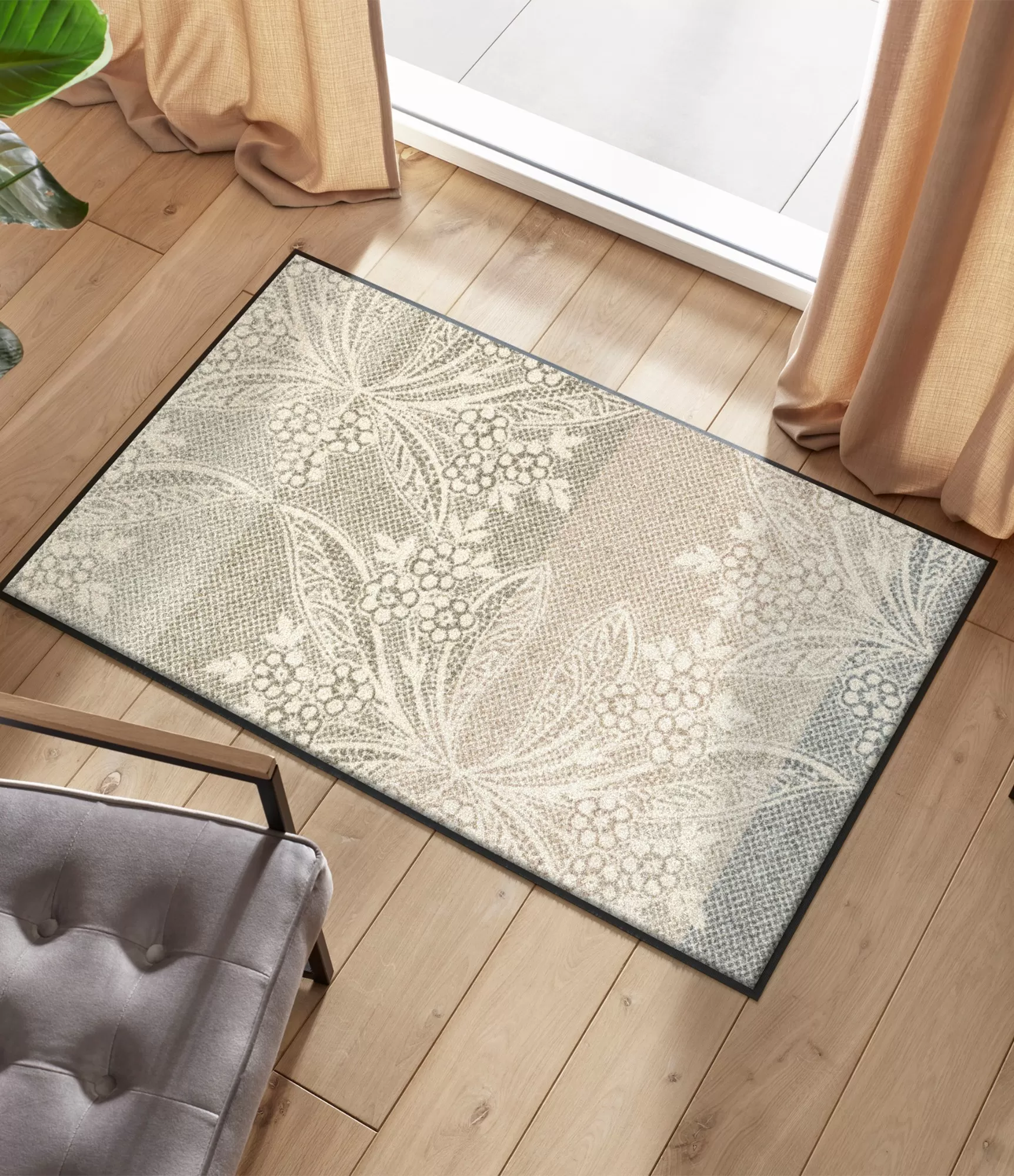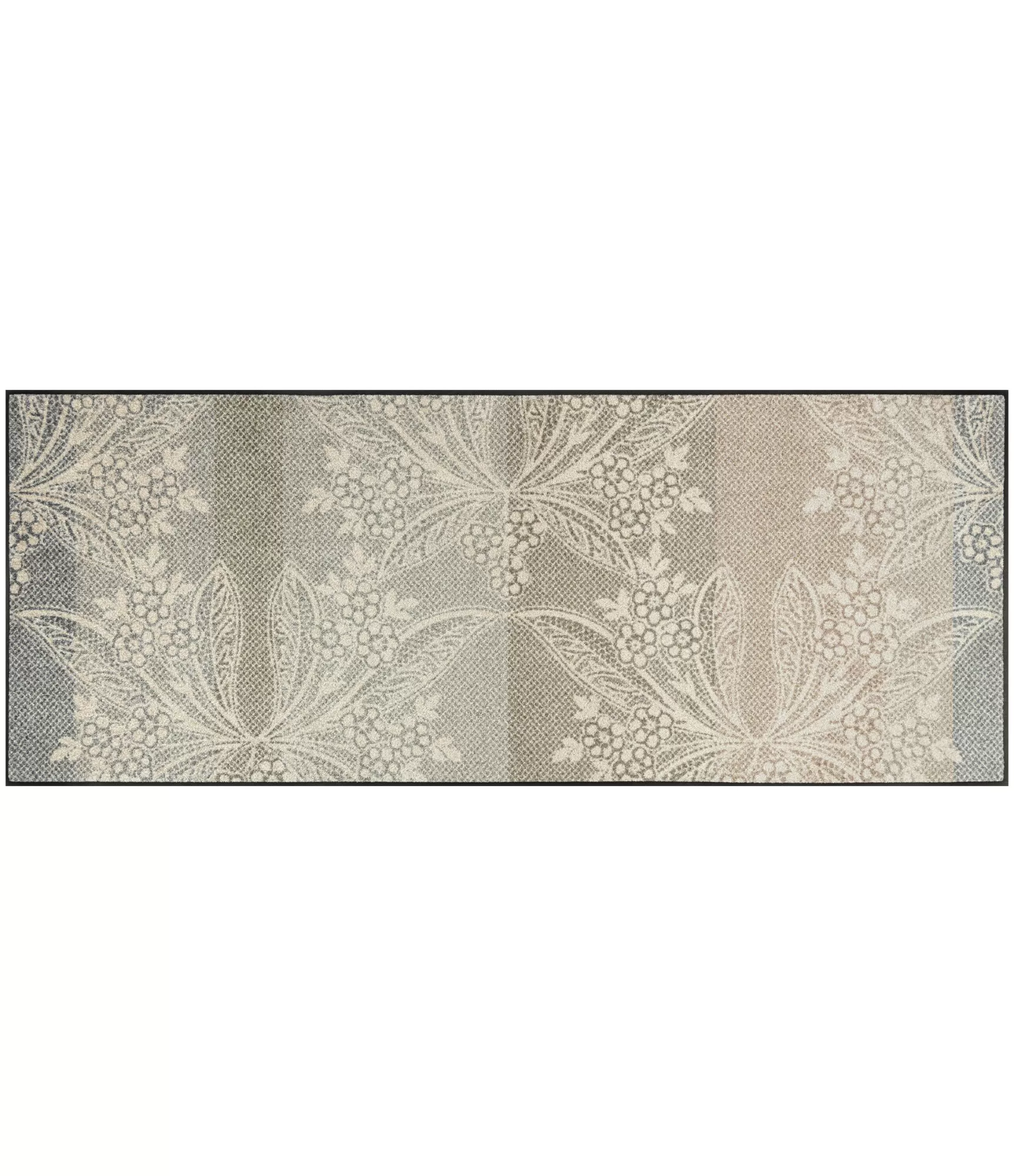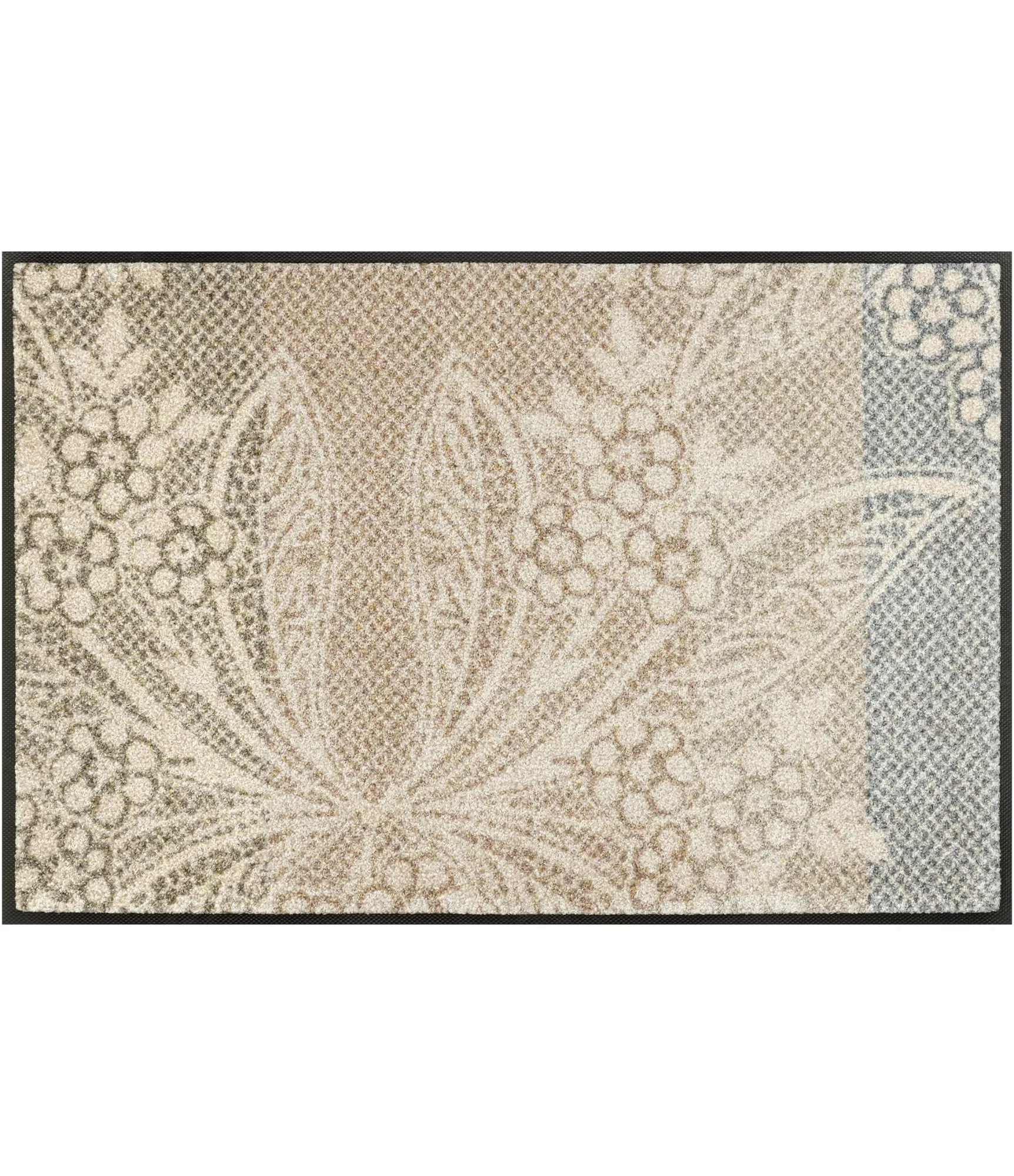 Durų kilimėlis „Floral Lace“ išsiskiria švelniu, dekoratyviu dizainu, primenančiu lengvą nėrinių raštą. Gėlių ir augalų motyvai subtiliai įsilieja į šviesų, natūralių atspalvių foną, sukurdami harmoningą ir ramią visumą. Tai puikus pasirinkimas tiems, kurie vertina estetiką be ryškių kontrastų – kilimėlis atrodo lengvai, bet kartu išlaiko elegantišką charakterį.