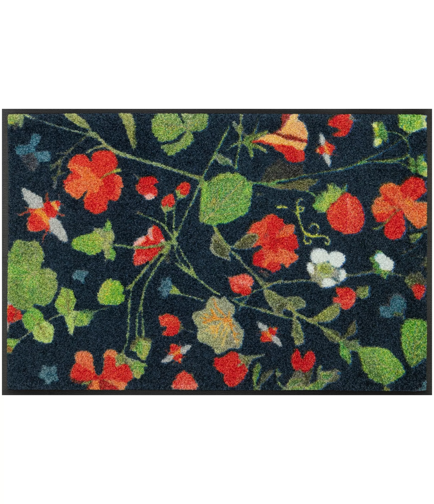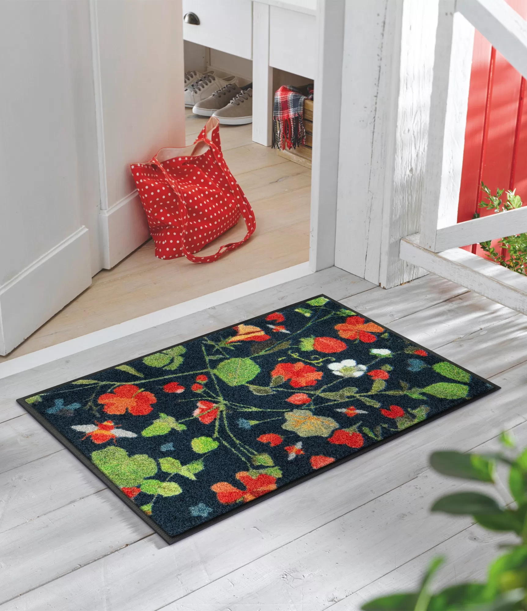 "Garden Bee" durų kilimėlis iš karto sukuria gyvybingą pirmą įspūdį dėl savo spalvingo, augalais ir smulkiais gamtos elementais dekoruoto dizaino. Tamsiame fone išsiskiria sodrios raudonos, žalios ir šviesios spalvos, kurios suteikia šiam sprendimui išraiškingumo, tačiau išlaiko estetinę pusiausvyrą. Šis dizainas primena vasarišką sodą, todėl įėjimo erdvė tampa šiltesnė ir jaukesnė.