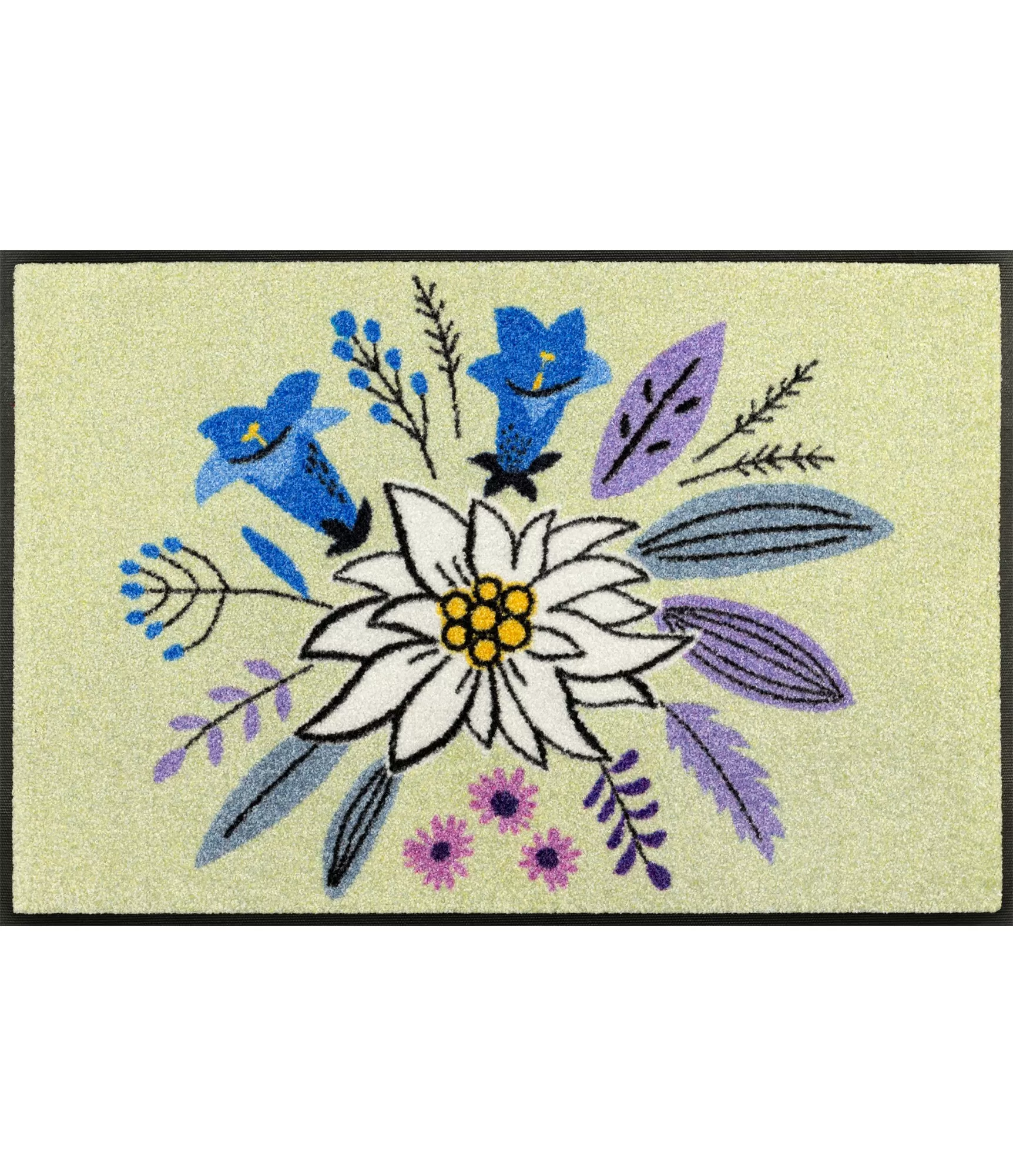 Stilingas durų kilimėlis "Gipfelgarten" išsiskiria šviesiu, gaiviu dizainu, kuriame dominuoja stilizuota gėlė ir subtilūs augaliniai elementai. Šis sprendimas pasižymi švelniu šviesiu fonu, kurį papildo mėlyni, violetiniai ir žalsvi akcentai, sukuriantys lengvumo ir natūralumo pojūtį. Toks spalvų derinys vizualiai praplečia erdvę ir suteikia jai švaros bei gaivos įspūdį, todėl puikiai tinka tiek moderniam, tiek jaukesniam namų interjerui.
