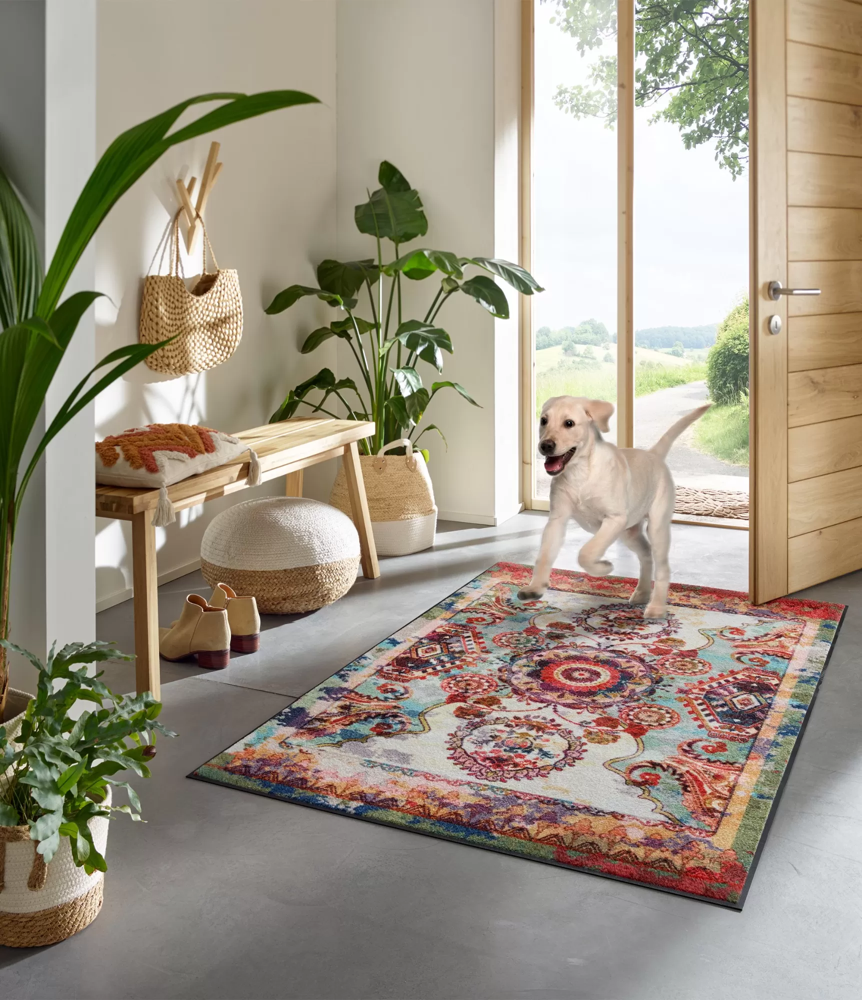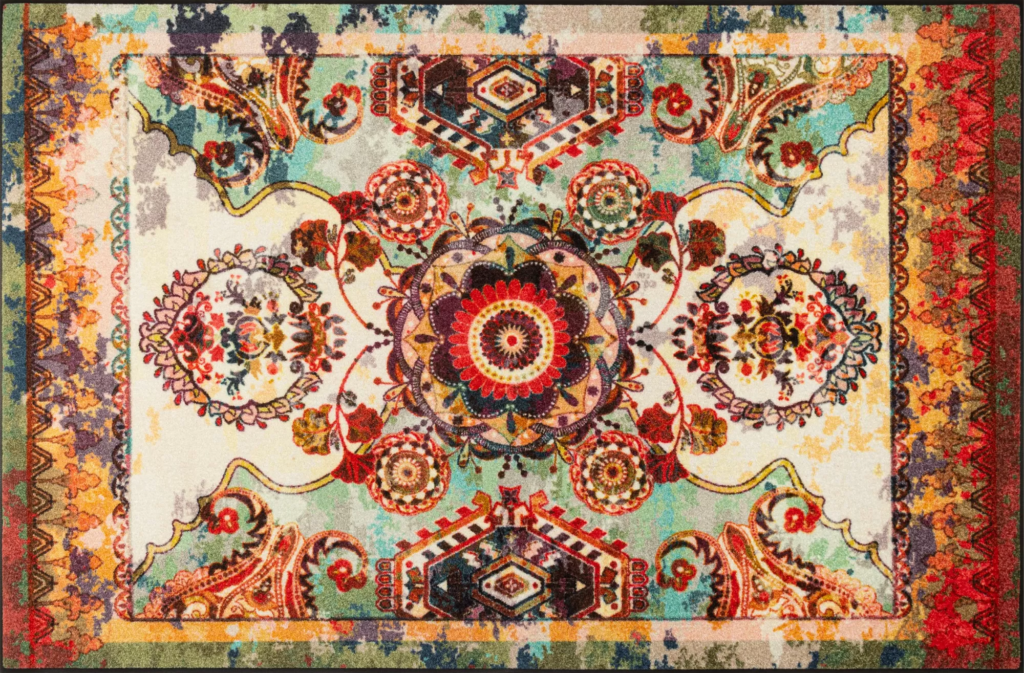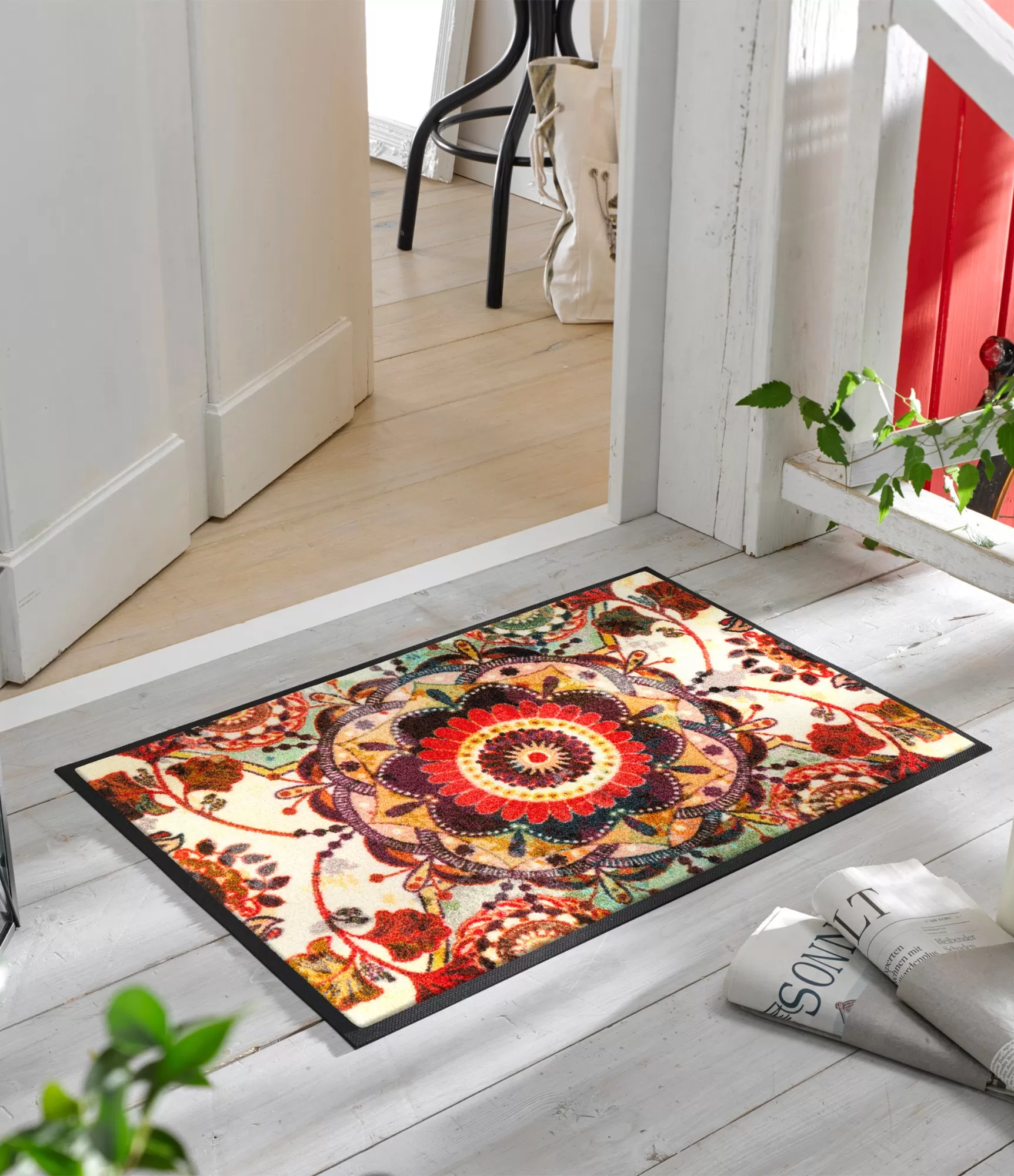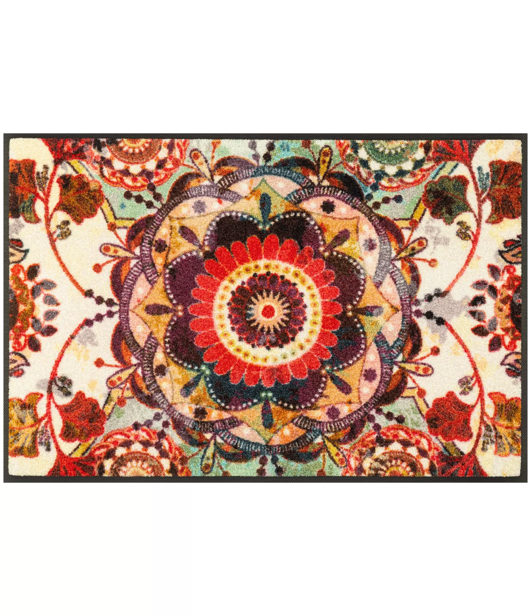 Durų kilimėlis "Grandioso" išsiskiria prabangiu ir itin detaliu mandalos tipo raštu, kuris suteikia erdvei elegancijos ir išskirtinumo. Šis dizainas pasižymi sodrių spalvų deriniu – čia susipina raudoni, aukso, žali ir tamsesni tonai, kurie kuria šiltą, gyvą ir vizualiai turtingą kompoziciją. Tokia ornamentika traukia akį ir tampa ryškiu interjero akcentu, galinčiu pagyvinti net ir paprastesnę aplinką.