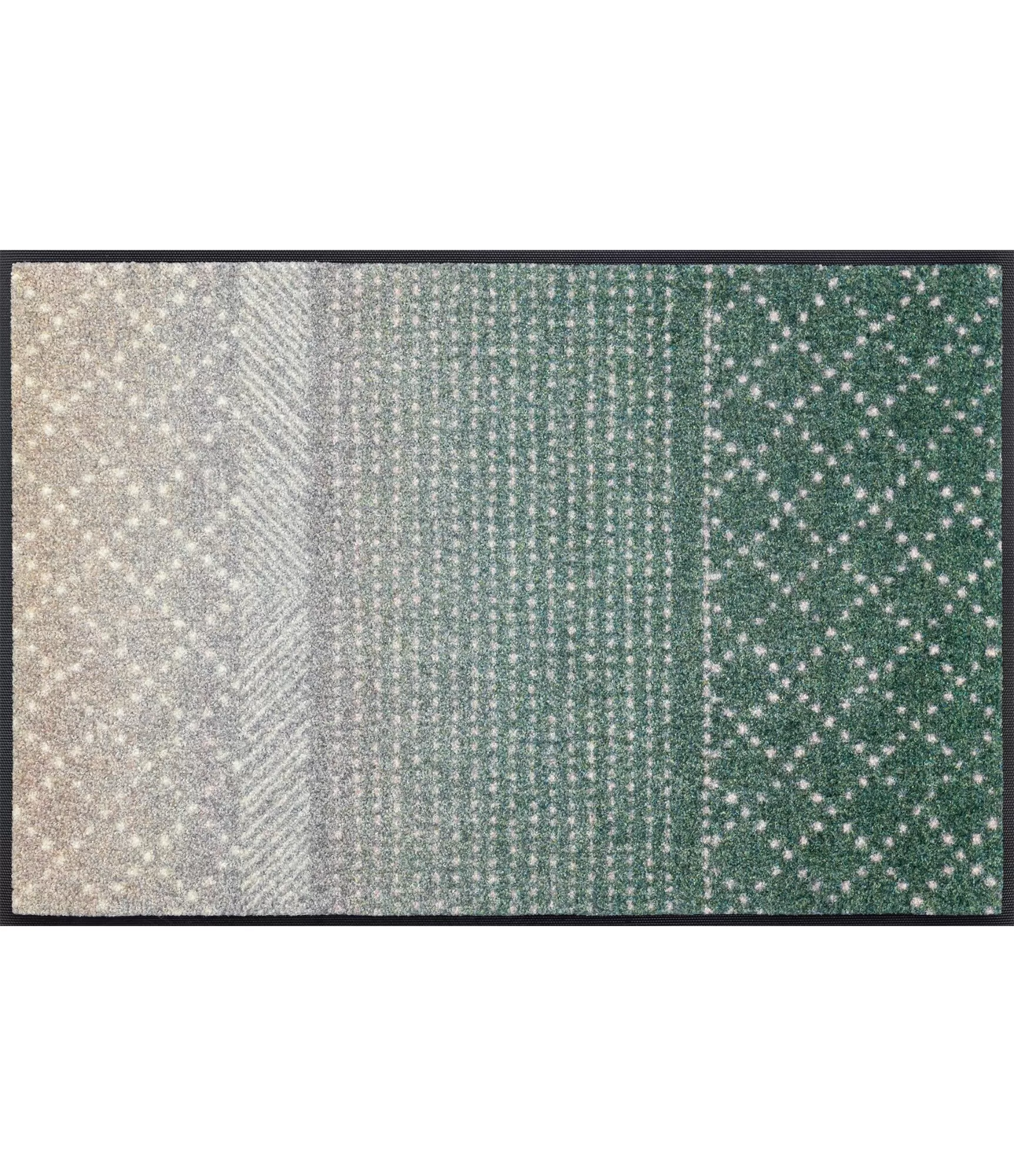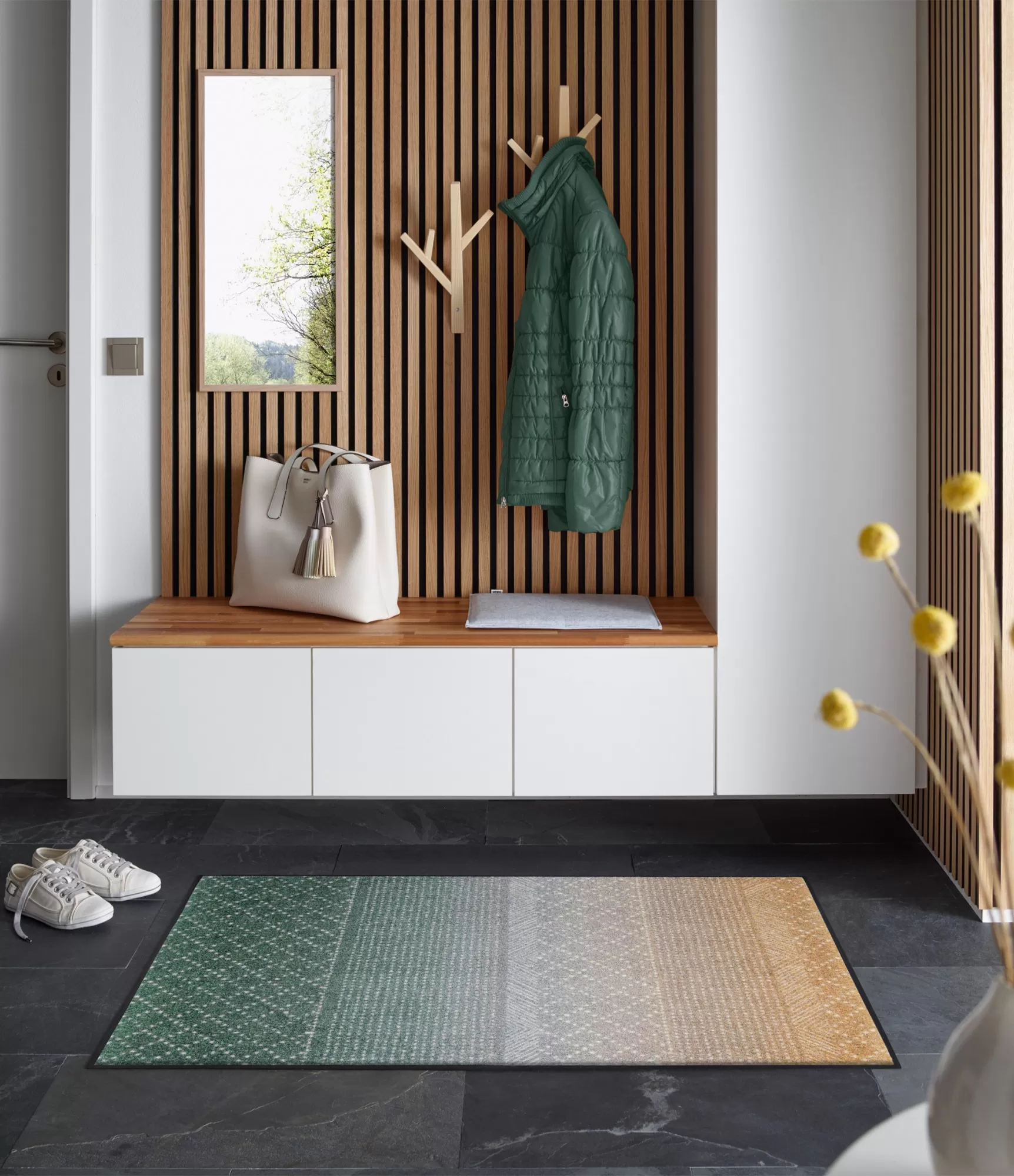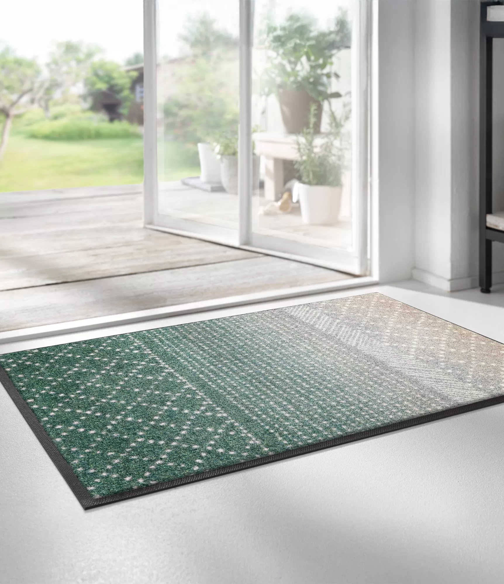 Išskirtinis durų kilimėlis „Green Desert“ išsiskiria subtiliu, bet gyvu raštu, kuriame dera švelnūs smėlio tonai ir gaivi žalia spalva. Šis derinys sukuria lengvumo pojūtį ir į interjerą įneša natūralios ramybės, tačiau kartu išlieka praktiškas kasdieniam naudojimui. Raštas ne tik estetiškas, bet ir funkcionalus – jis padeda mažiau matyti nešvarumus, todėl kilimėlis ilgiau atrodo tvarkingas.