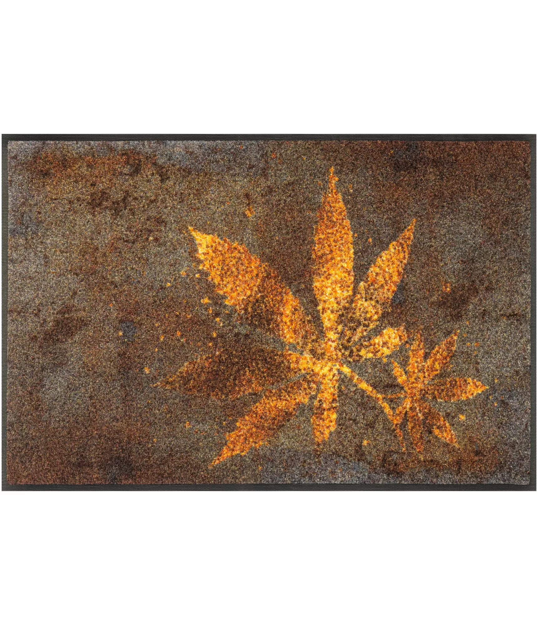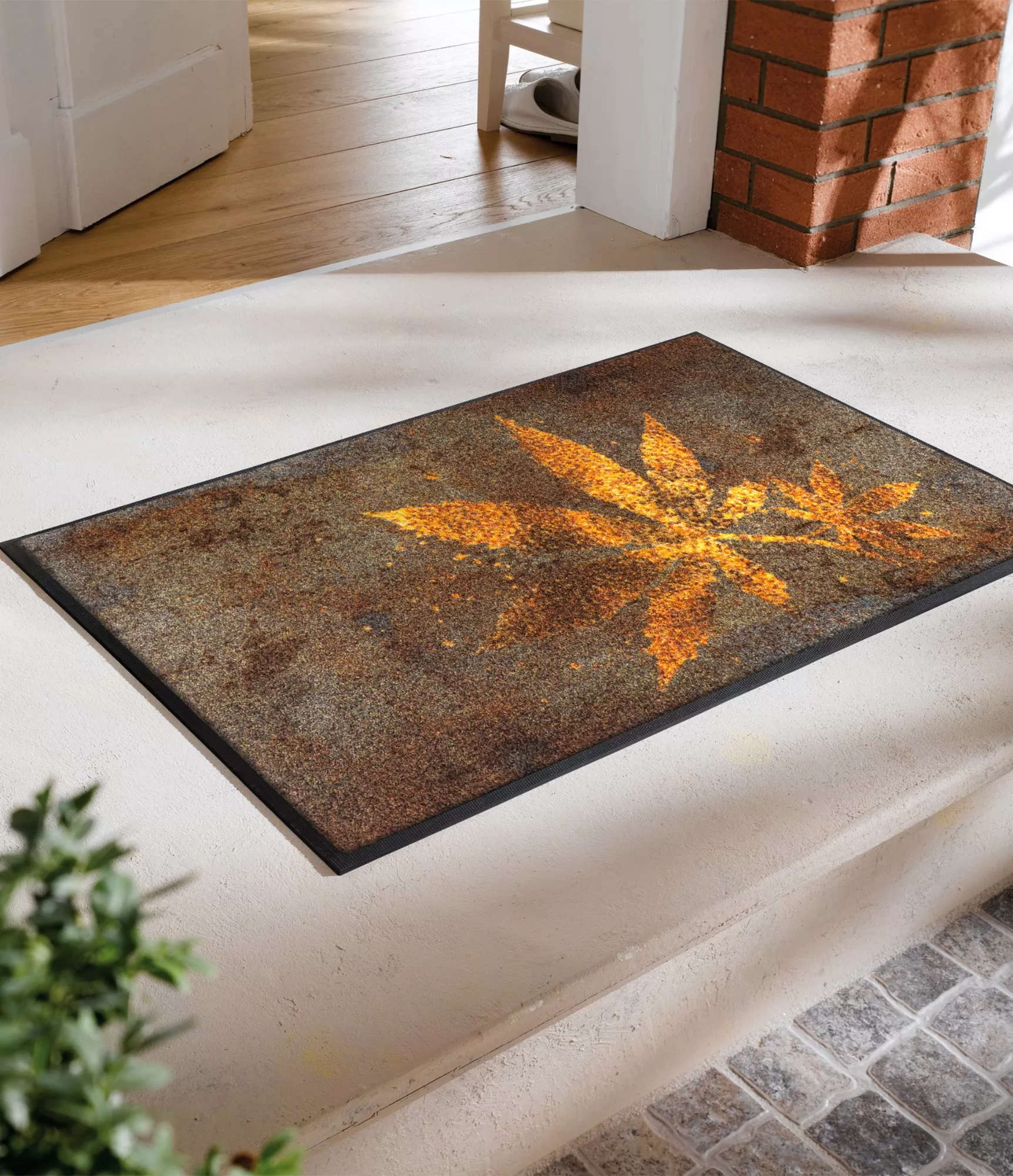 Plaunamas durų kilimėlis „Herb Blend“ išsiskiria jaukiu, gamtos įkvėptu dizainu. Šiltų rudų atspalvių fonas derinamas su ryškesniais augalų motyvais, kurie primena džiovintus lapus ar prieskonines žoleles. Kontrastingas, tačiau natūralus spalvų derinys sukuria šilumos ir jaukumo pojūtį, todėl kilimėlis tampa subtiliu interjero akcentu.