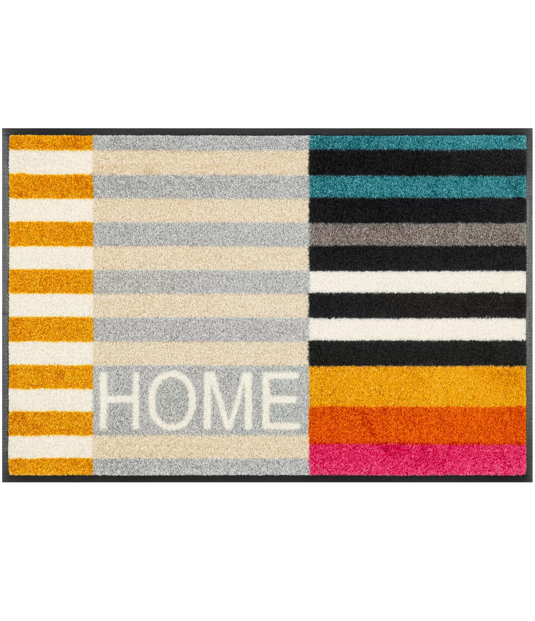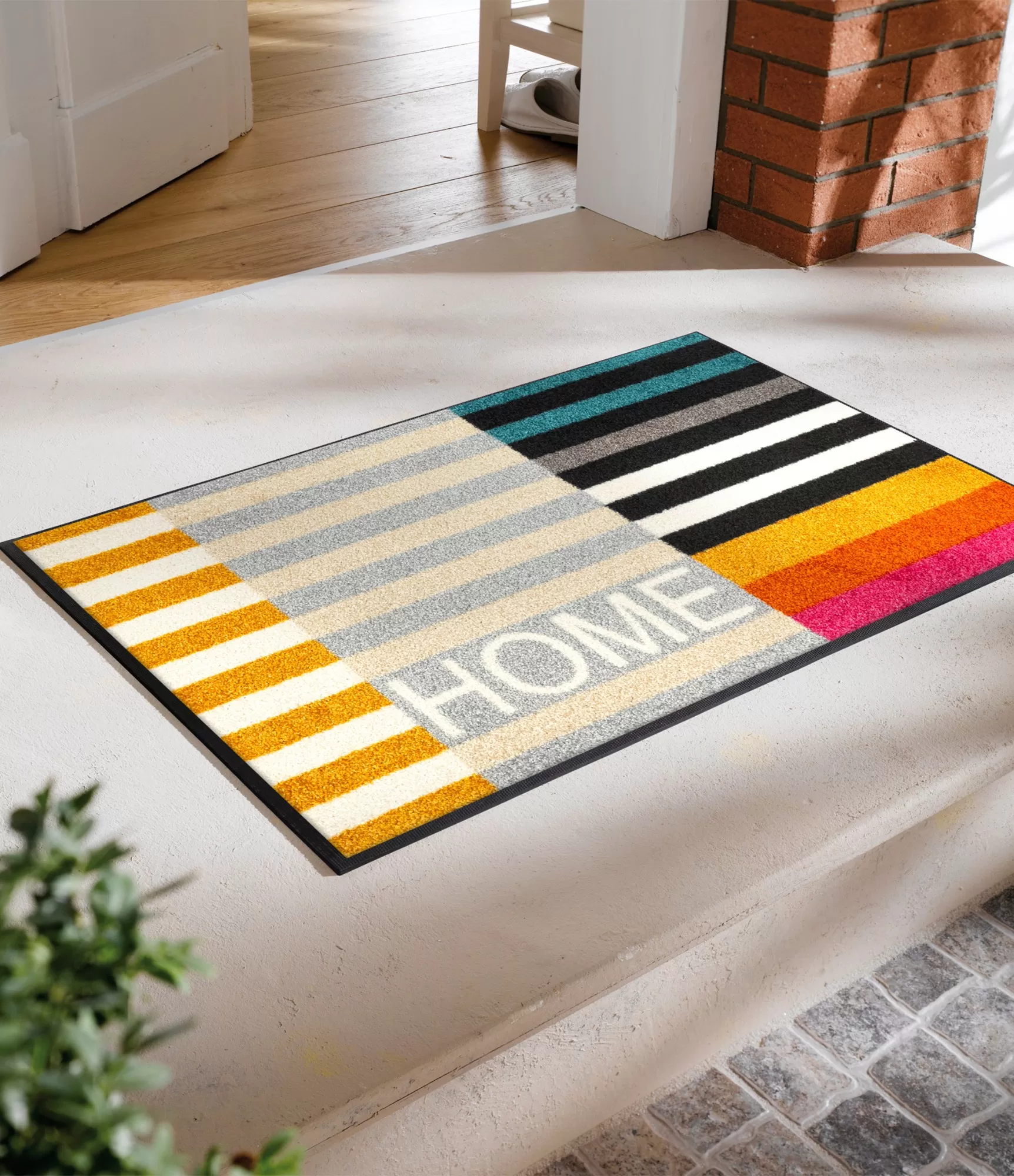 Durų kilimėlis „Home Retreat“ išsiskiria gyvybingu, ritmišku dizainu, kuriame susijungia skirtingų spalvų ir linijų žaismas. Horizontalios juostos kuria vizualinę struktūrą, o kontrastingi tonai – nuo šiltų garstyčių, oranžinių iki gaivių mėlynų ir neutralių pilkų – suteikia interjerui energijos ir išskirtinumo. Subtiliai įkomponuotas žodis „HOME“ dar labiau sustiprina jaukumo ir sugrįžimo jausmą.