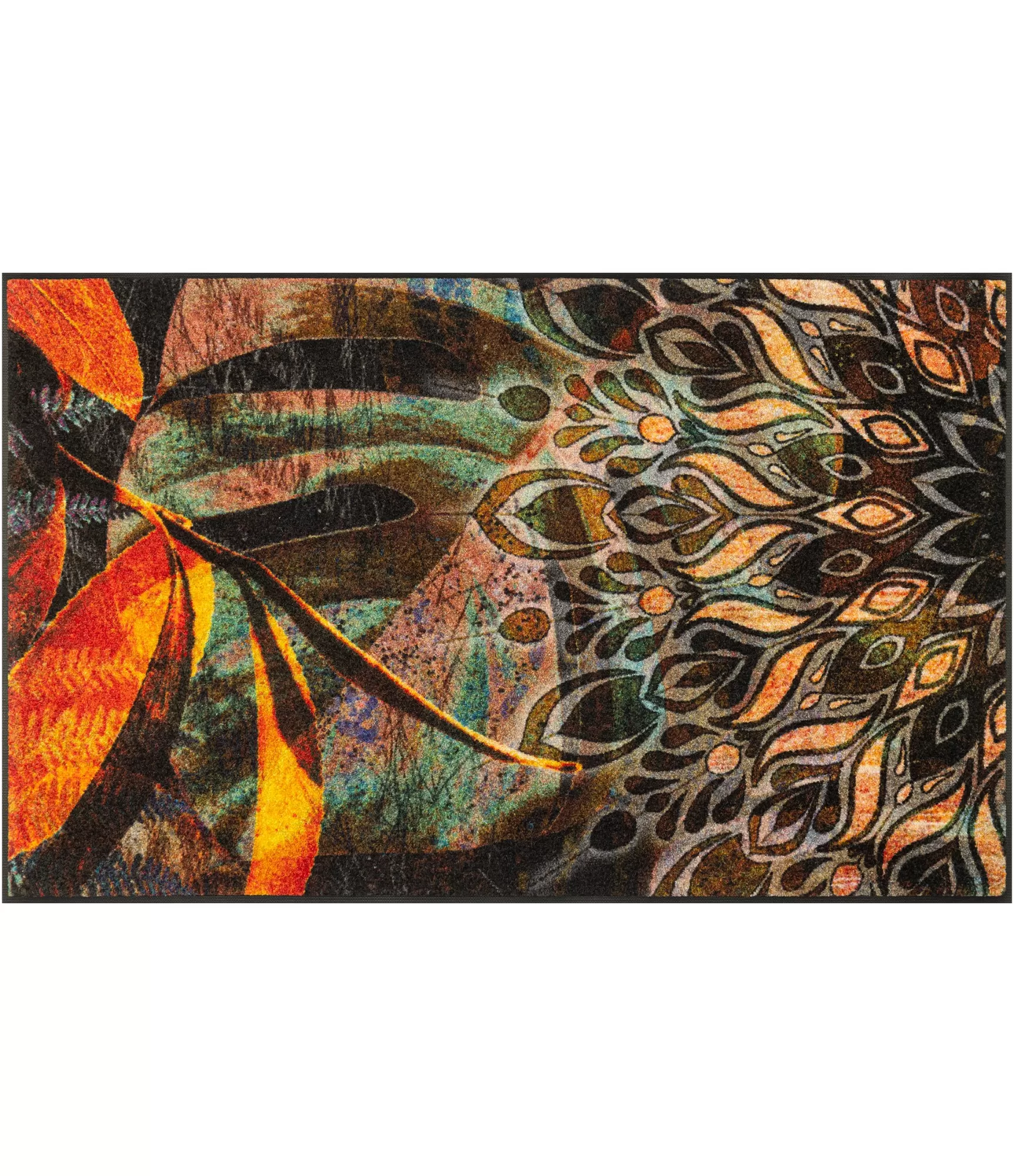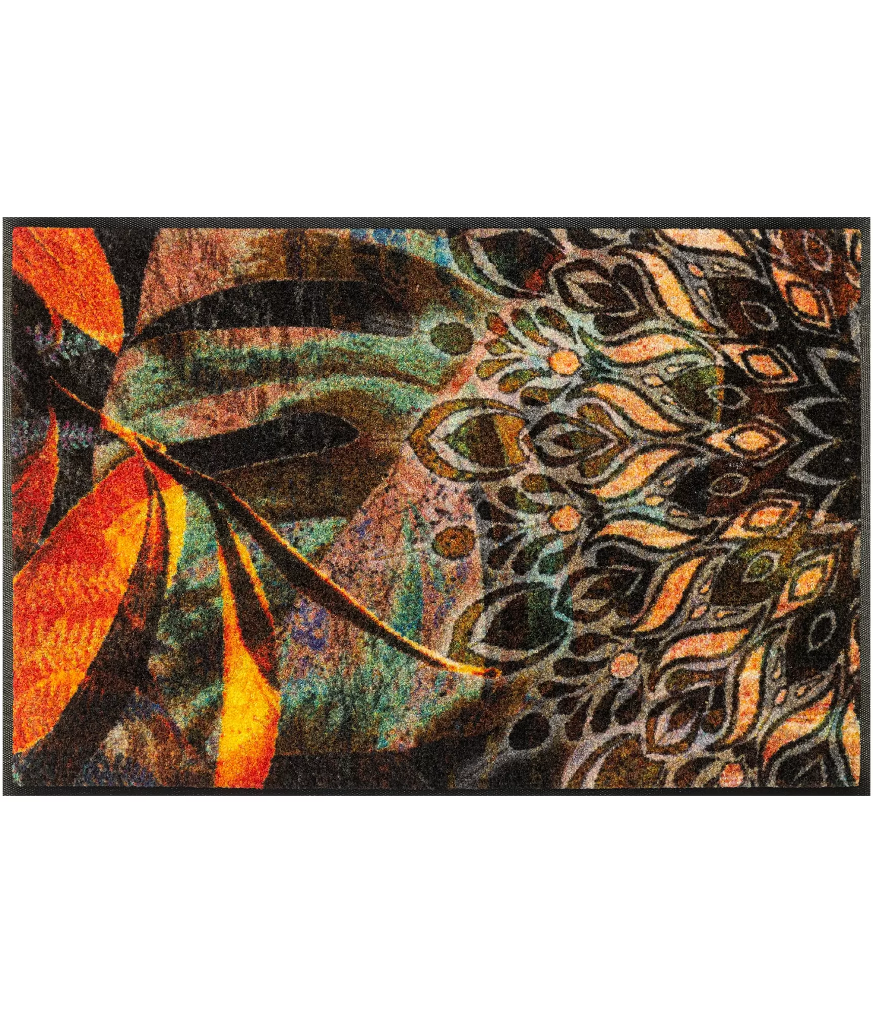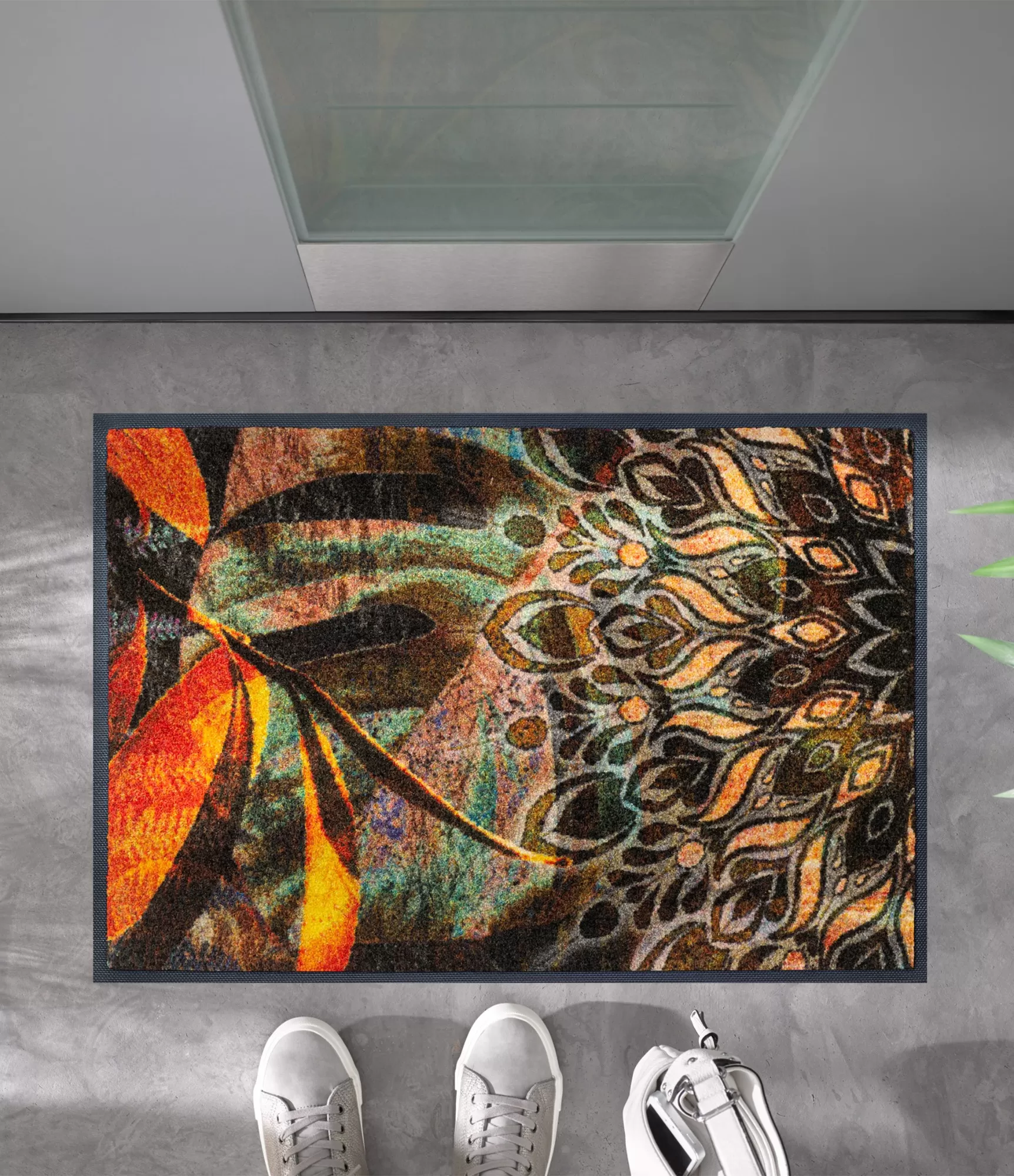 Madingas durų kilimėlis „Jungle Dance“ traukia akį savo sodriu, dinamišku raštu. Egzotiški lapų motyvai derinami su ornamentinėmis detalėmis ir giliais, kontrastingais atspalviais – nuo šiltų oranžinių iki sodrių žalių ir tamsių tonų. Šis dizainas sukuria energijos ir gyvybės pojūtį, todėl kilimėlis tampa ryškiu akcentu bet kurioje erdvėje.