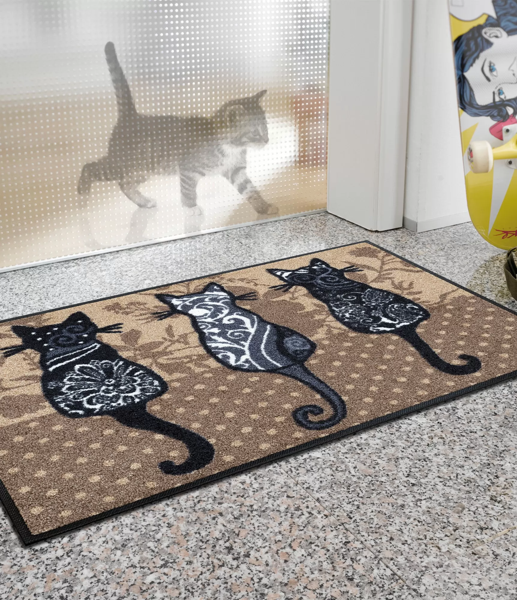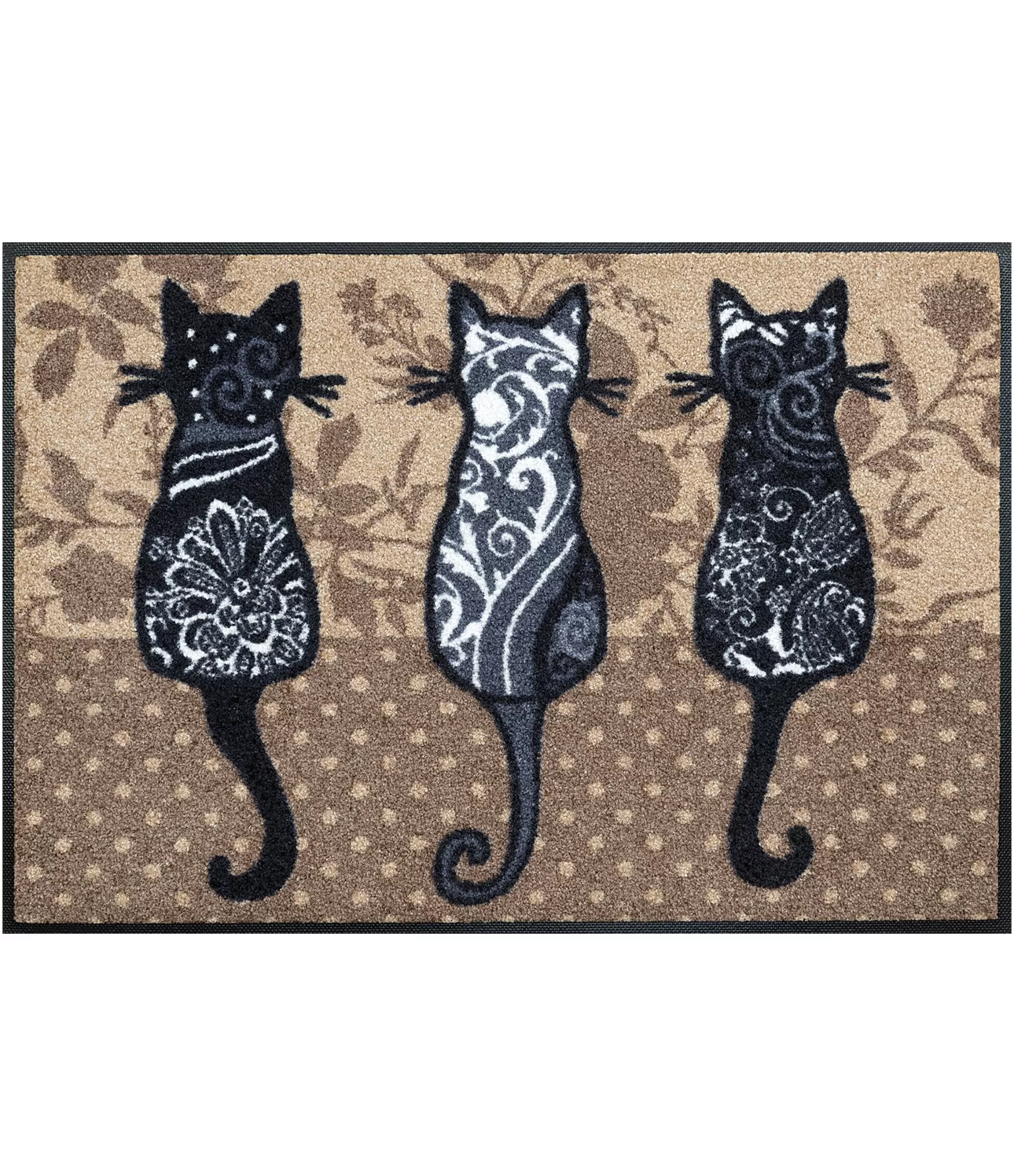 Durų kilimėlis "Katzenbande" iš karto išsiskiria savo žaismingu ir charakteringu dizainu, kuriame pavaizduotos trys dekoratyvios katės su subtiliais ornamentais. Šis sprendimas pasižymi šiltų, natūralių spalvų deriniu – smėlio, rudos ir juodos tonai sukuria jaukią, ramią atmosferą, kuri lengvai įsilieja į įvairius interjerus. Raštų detalės suteikia šiam dizainui išskirtinumo, todėl jis ne tik atlieka praktinę funkciją, bet ir tampa stilingu akcentu prie įėjimo.