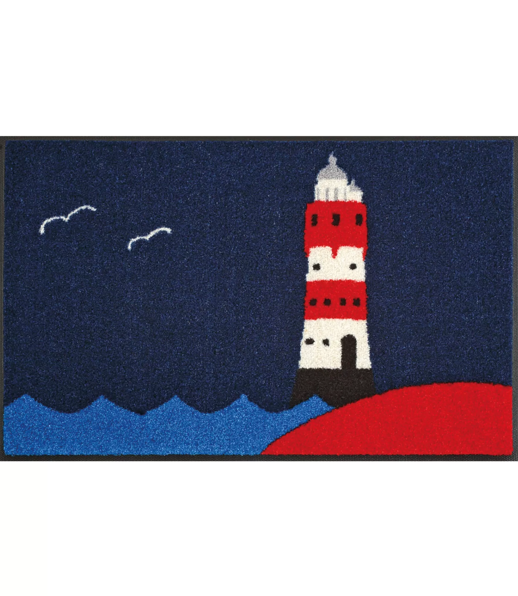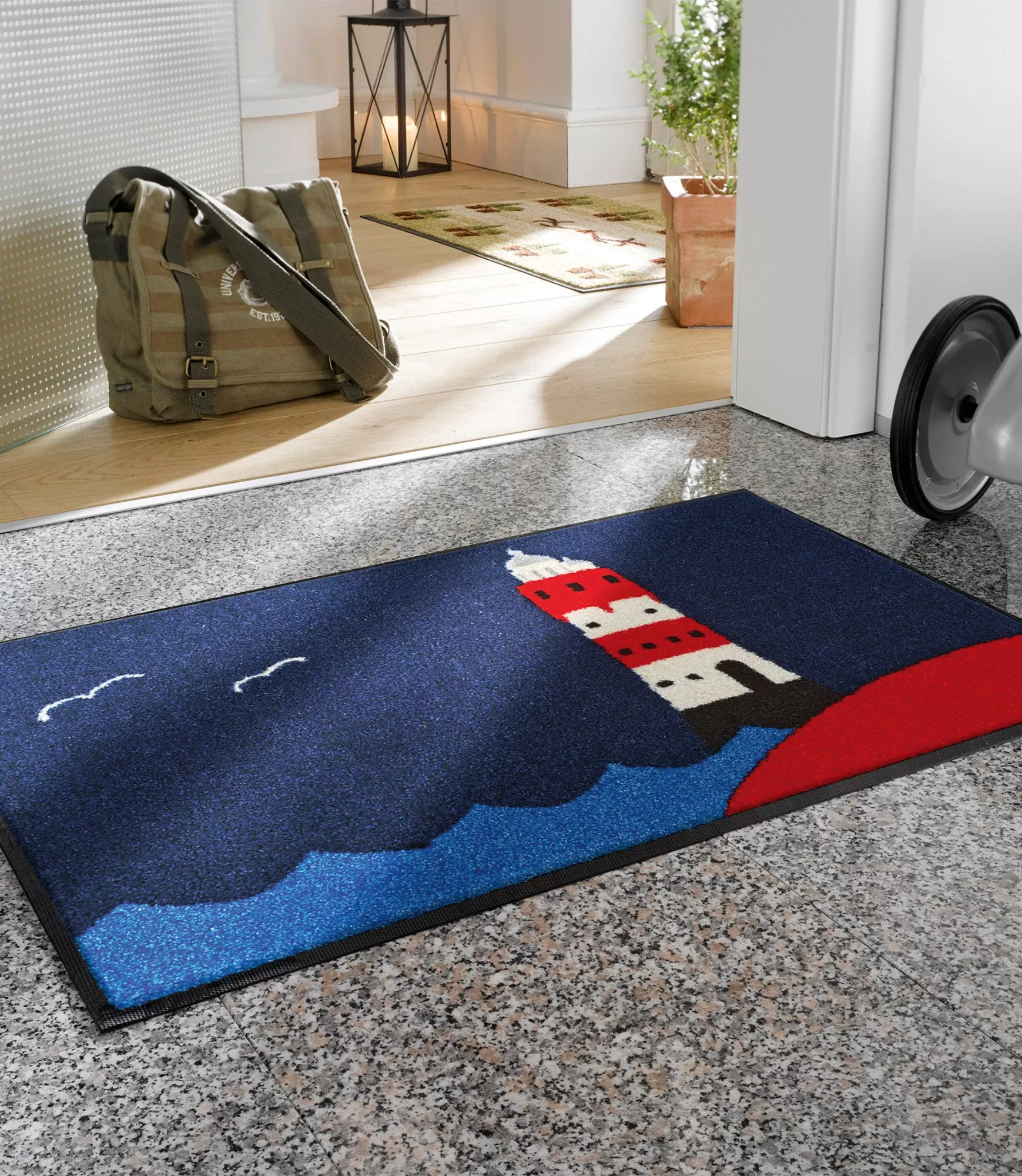 Durų kilimėlis „Lighthouse by the Sea“ perteikia klasikinę marinistinę nuotaiką – gilus mėlynas fonas, kontrastingas raudonai baltas švyturys ir lengvai stilizuotos bangos sukuria aiškų, švarų ir vizualiai raminantį vaizdą. Tai dizainas, kuris primena jūros horizontą, gaivų orą ir lėtą, harmoningą ritmą.