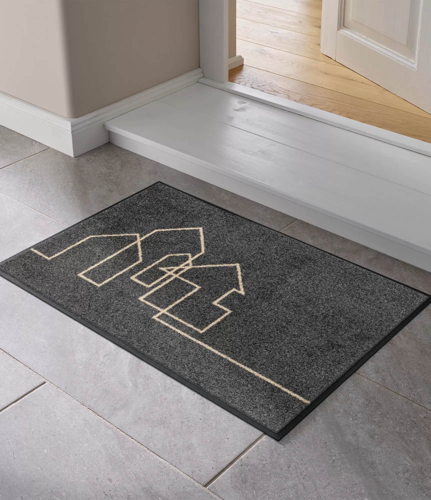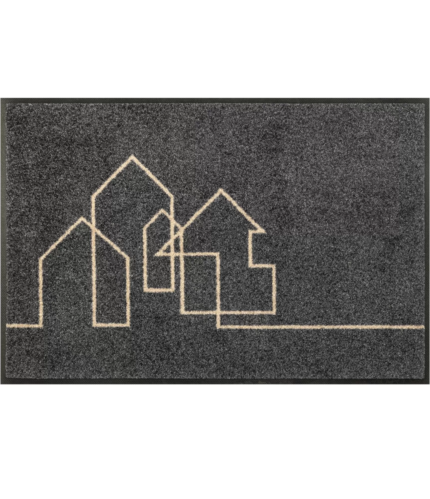 Plaunamas durų kilimėlis Linestreet išsiskiria minimalistiniu, moderniu dizainu, kuris puikiai dera šiuolaikiniuose interjeruose. Ant tamsesnio fono subtiliai pavaizduotos geometrinės namų formos sukuria tvarkos, estetikos ir harmonijos pojūtį. Tai dizainas, kuris nėra ryškus, tačiau suteikia erdvei charakterio ir išlaiko elegantišką paprastumą.