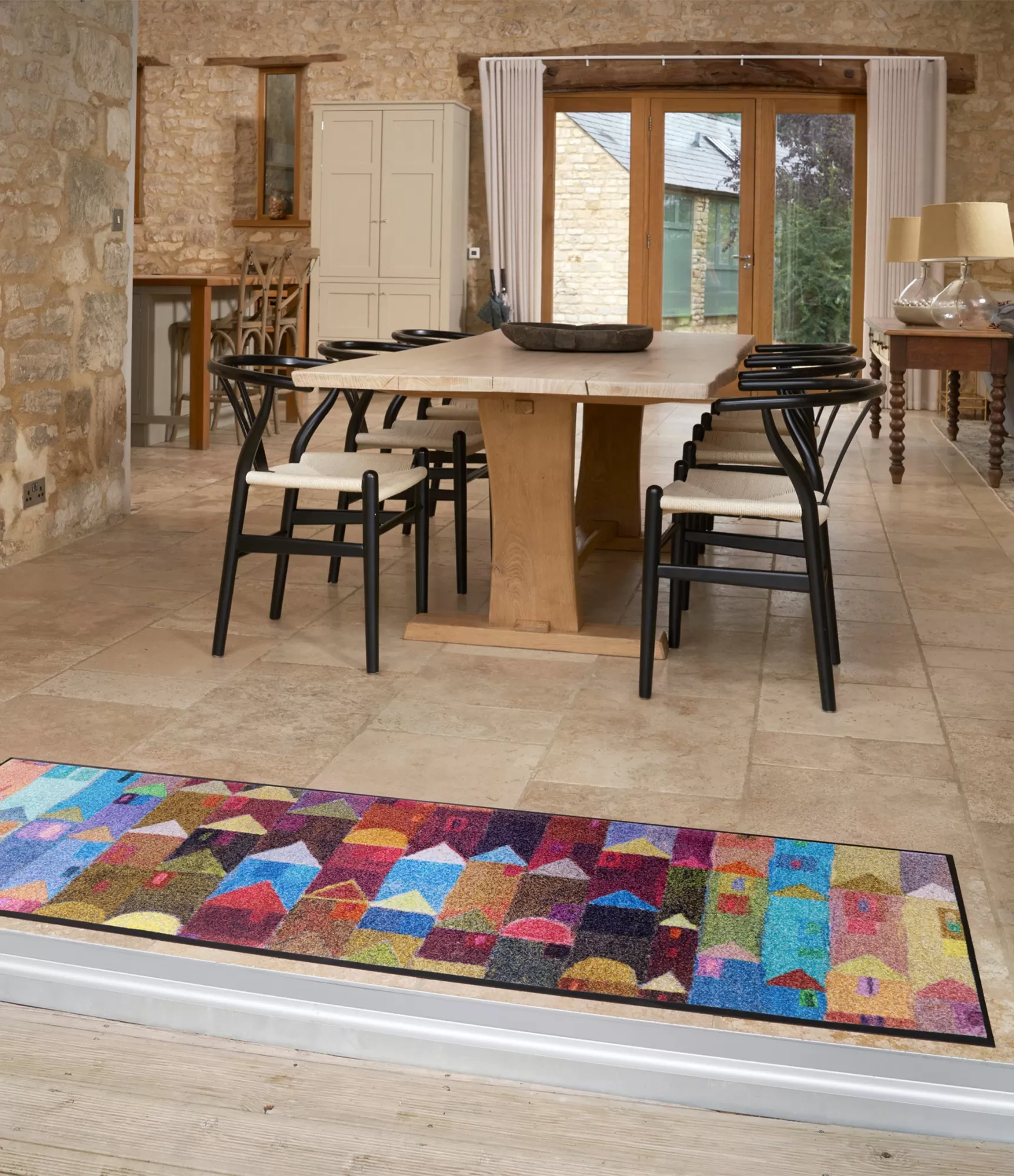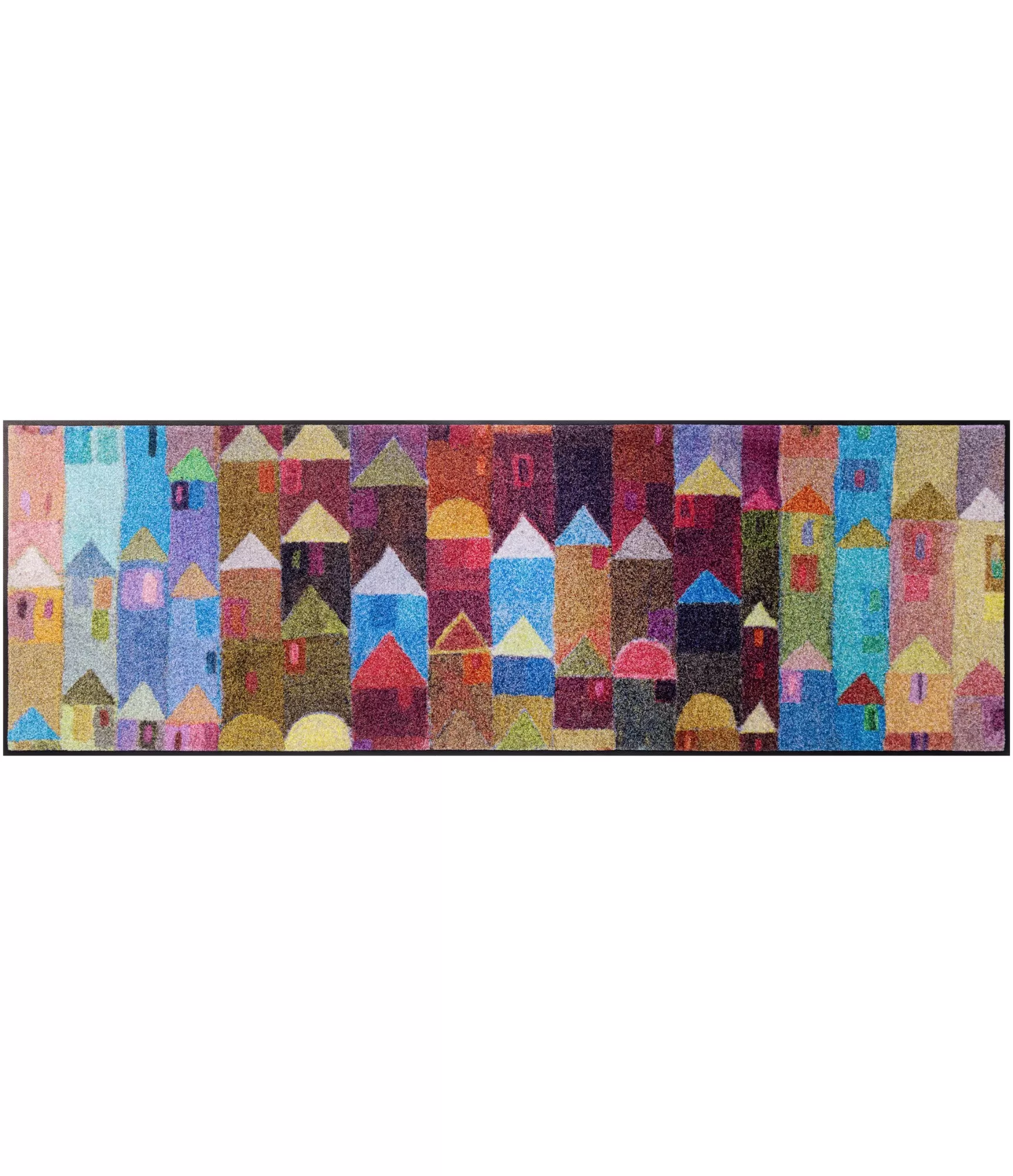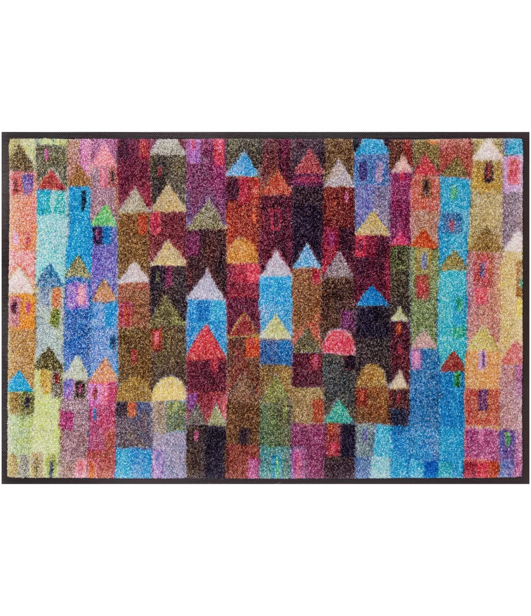 Plaunamas durų kilimėlis "Manhattan" išsiskiria spalvingu ir dinamišku dizainu, primenančiu stilizuotą miesto panoramą. Šis sprendimas pasižymi gausia spalvų palete – čia susilieja ryškūs mėlyni, raudoni, geltoni, žali ir kiti tonai, kurie sukuria gyvą, energingą ir šiuolaikišką įspūdį. Dėl šio išraiškingumo gaminys tampa ne tik praktiška, bet ir dekoratyvia interjero detale, kuri gali visiškai pakeisti įėjimo zonos nuotaiką.