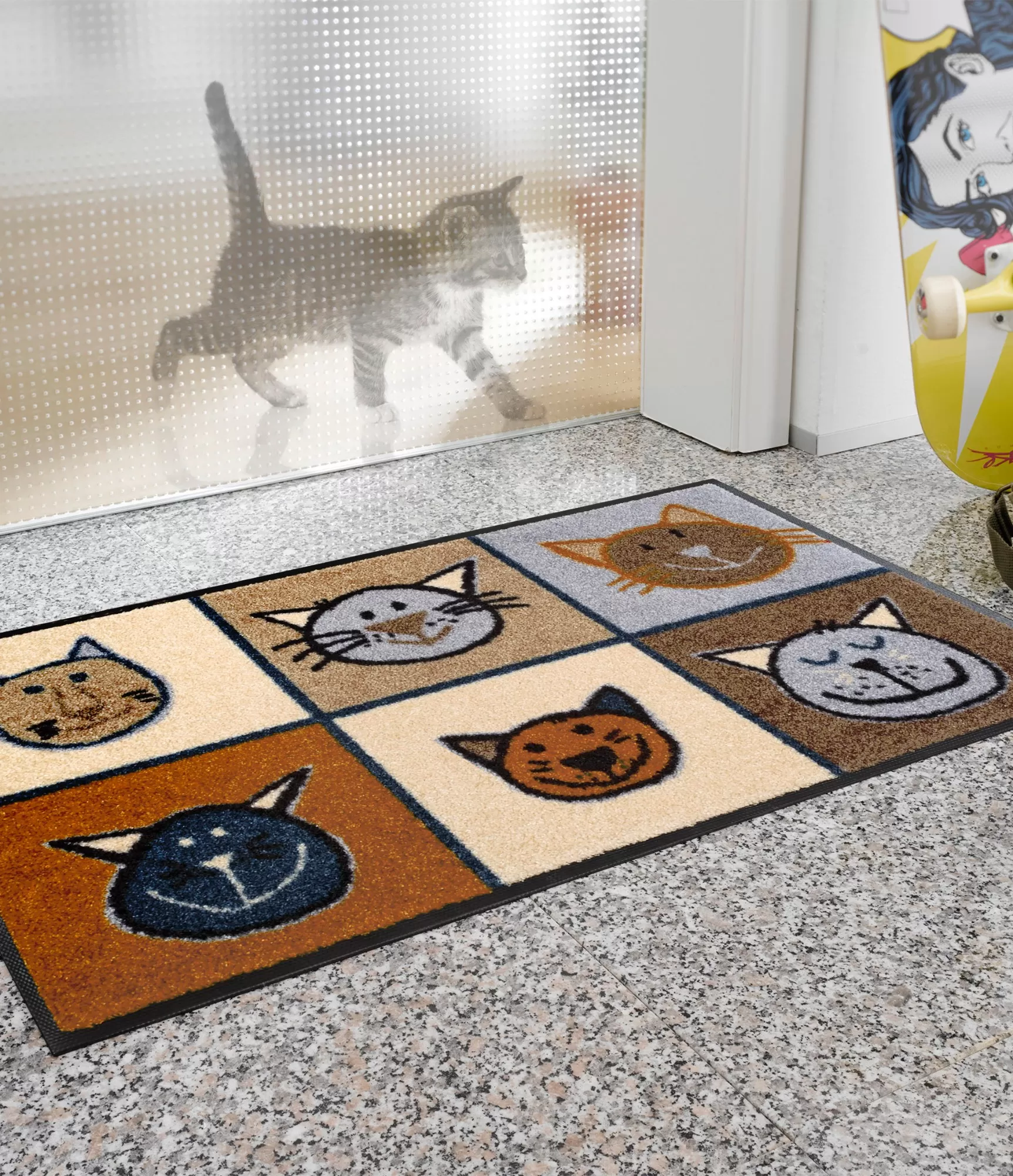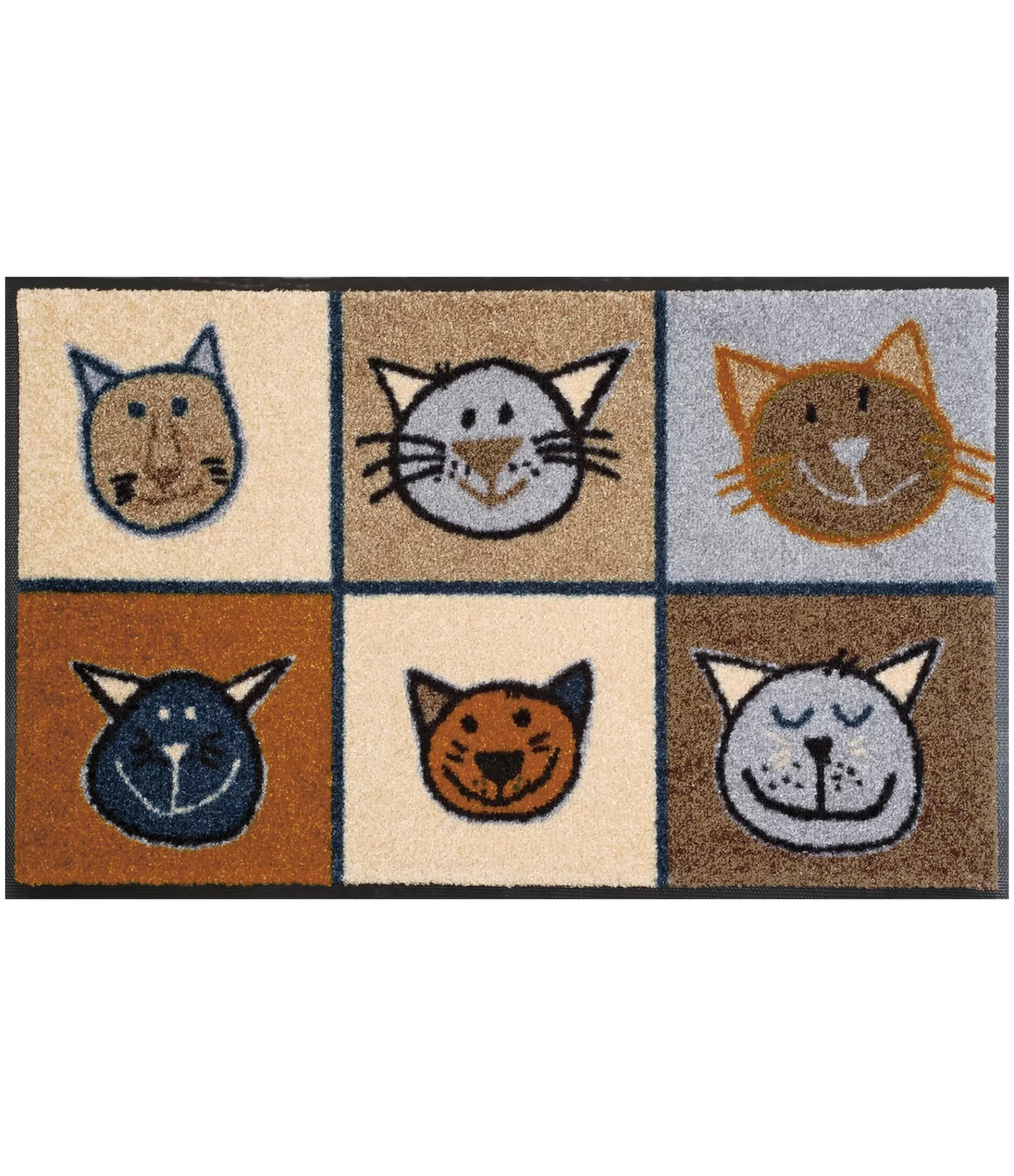 Plaunamas durų kilimėlis "Miau Miau" išsiskiria linksmu ir šiltu dizainu, kuriame vaizduojami skirtingų formų ir išraiškų kačių veidai. Šis sprendimas sukuria jaukumo ir žaismingumo pojūtį, o švelnūs smėlio, rudos, pilkos ir juodos spalvų deriniai leidžia lengvai priderinti prie įvairių interjerų. Kiekvienas elementas atrodo subtiliai, tačiau kartu suteikia šiam dizainui išskirtinumo ir charakterio.