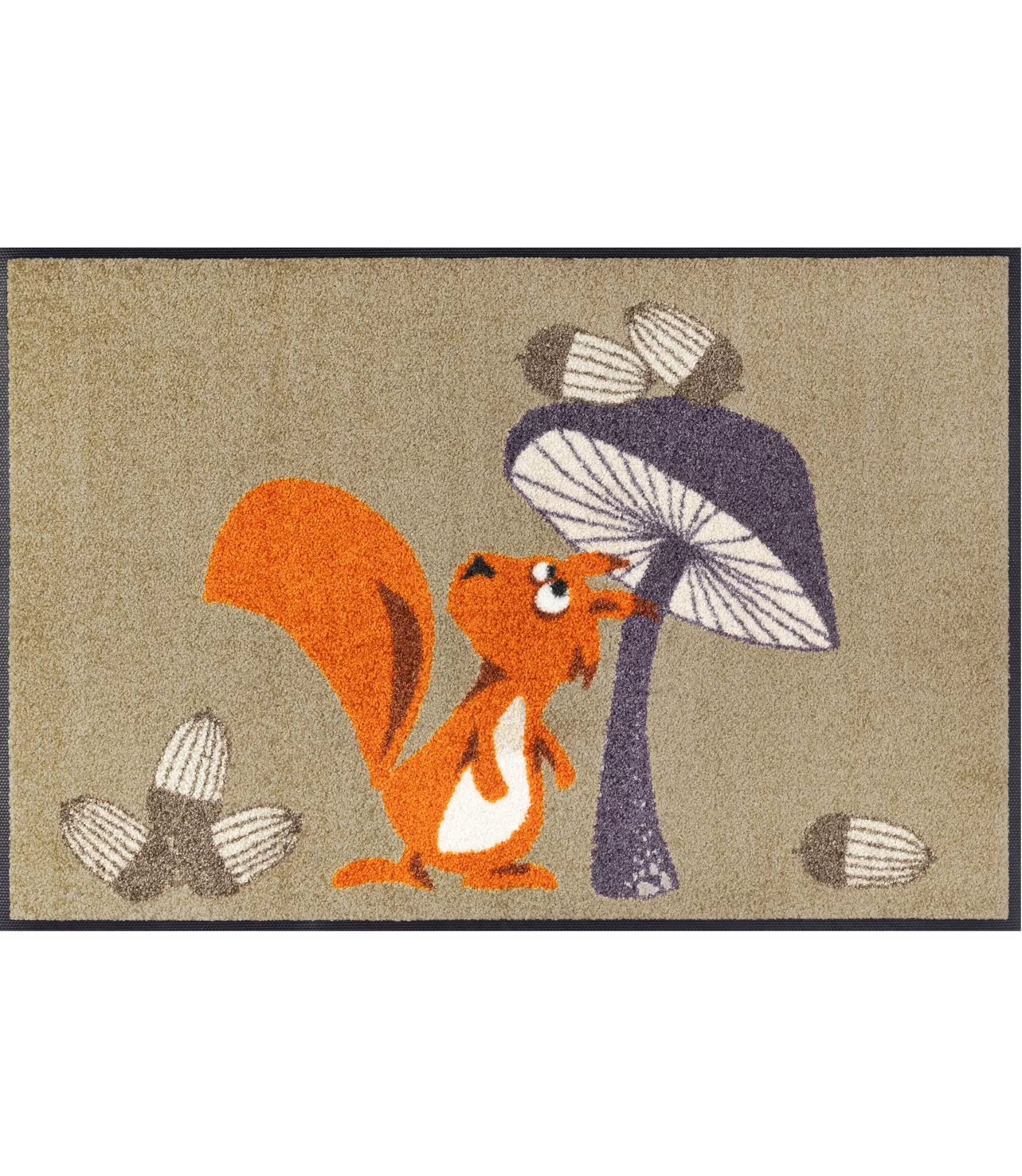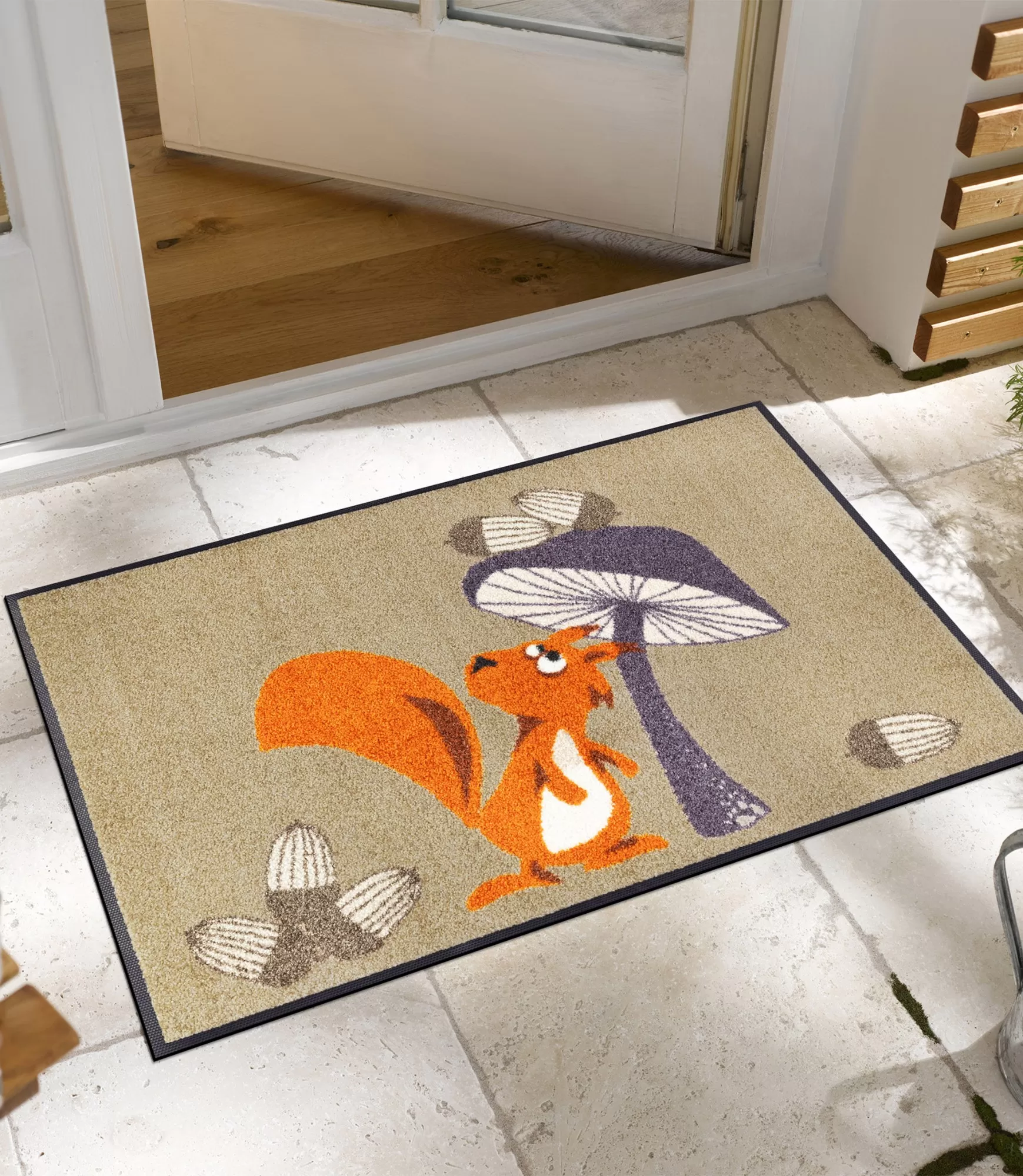 Durų kilimėlis Odette iš karto patraukia dėmesį savo žaismingu ir šiltu dizainu. Linksma voverė, derinama su stilizuotais gamtos motyvais, sukuria jaukią ir lengvai atpažįstamą nuotaiką. Švelni smėlio spalvos bazė harmoningai dera su ryškesniais akcentais, todėl gaminys tampa subtiliu, bet išskirtiniu interjero elementu. Toks pasirinkimas puikiai tiks tiek prieškambaryje, tiek kitose namų erdvėse, kur norisi daugiau gyvybės ir jaukumo.