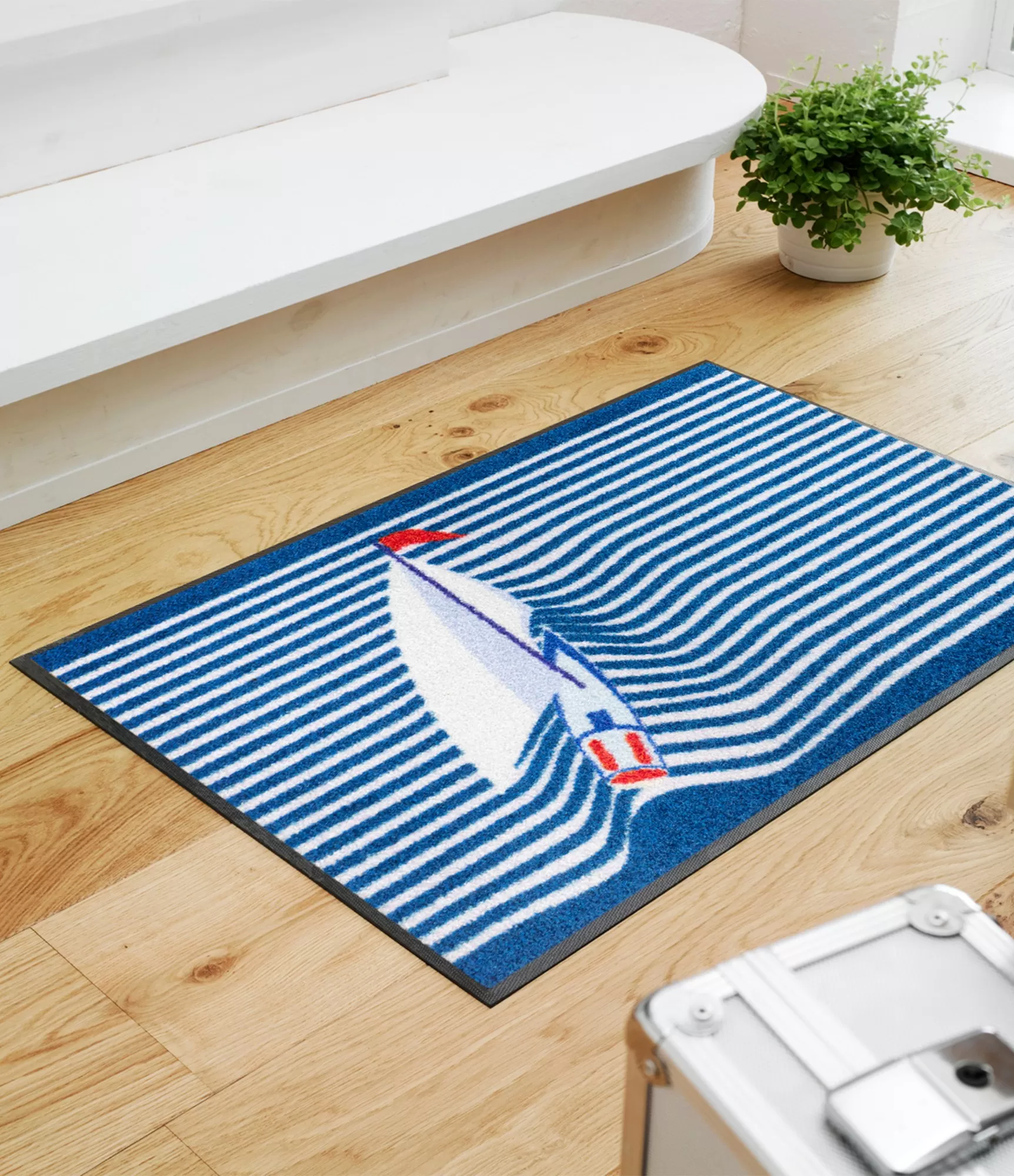 Plaunamas durų kilimėlis Sailing Boat išsiskiria gaiviu, jūros įkvėptu dizainu. Mėlynos ir baltos spalvų derinys su subtiliai banguojančiomis linijomis primena jūros horizontą, o nedidelė burinė valtis suteikia lengvumo ir kelionių nuotaikos. Tai puikus pasirinkimas tiems, kurie mėgsta švarų, gaivų ir ramybę kuriantį interjerą.