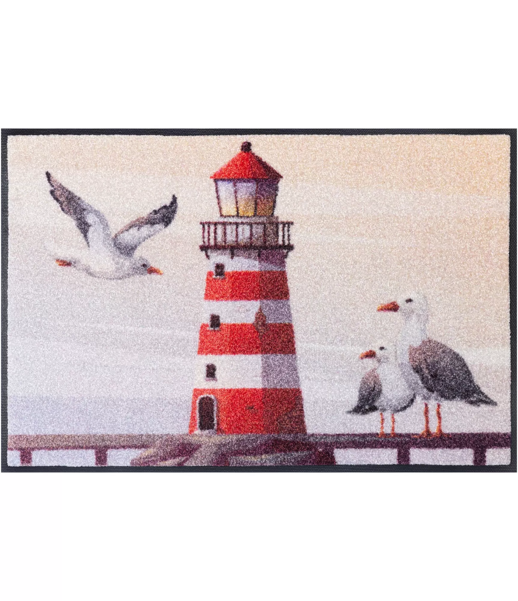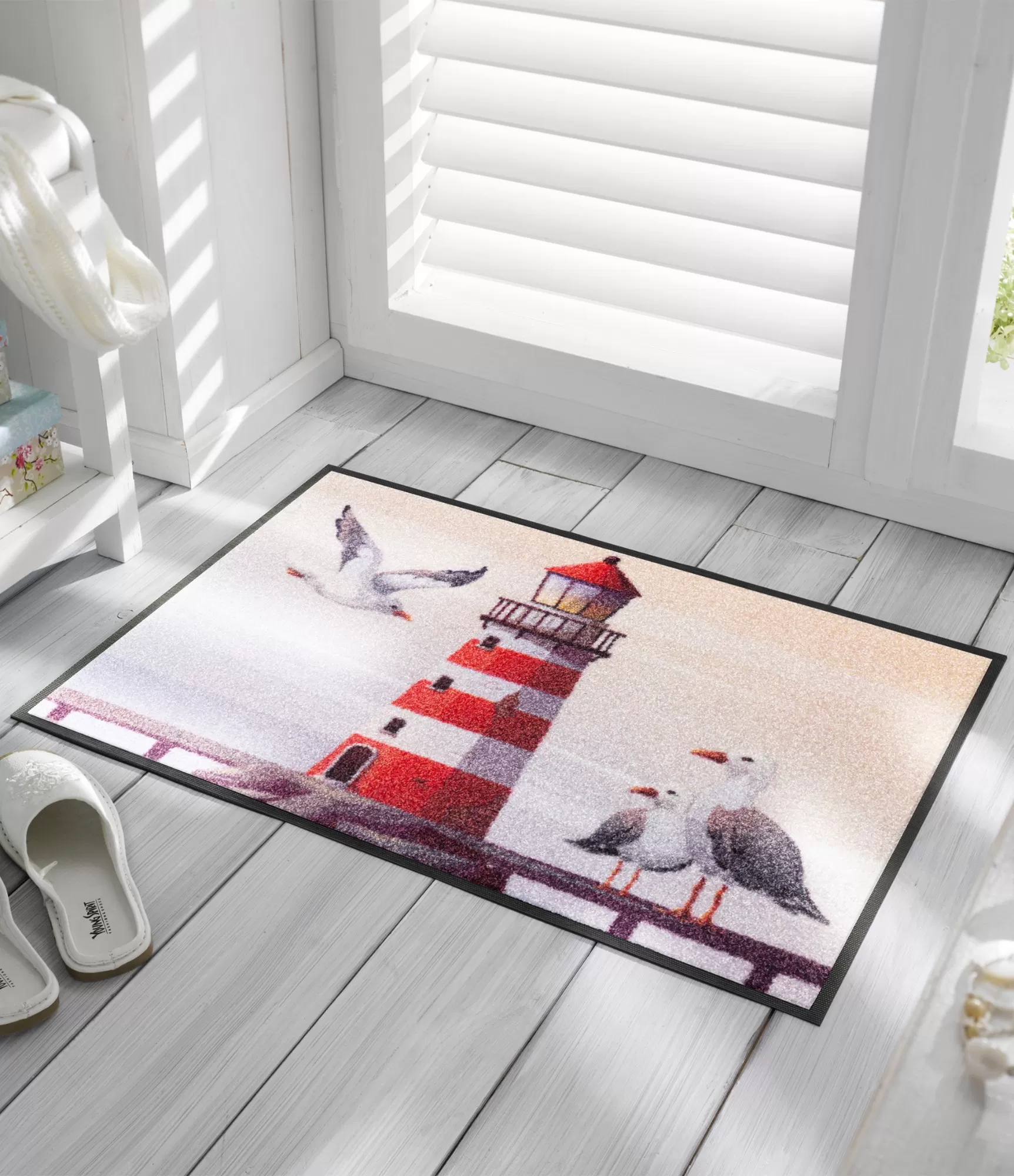 Durų kilimėlis „Shoreside“ išsiskiria lengvu pajūrio motyvu – švyturys ir kirai sukuria ramų, šviesų įspūdį. Šis dizainas suteikia įėjimo erdvei jaukumo ir vizualinio lengvumo, bet neperkrauna interjero. Tai praktiškas pasirinkimas, kai norisi aiškaus, tvarkingo vaizdo su išskirtiniu akcentu.