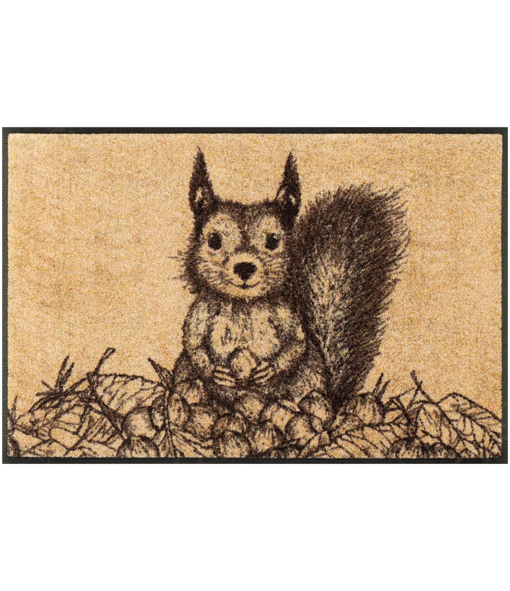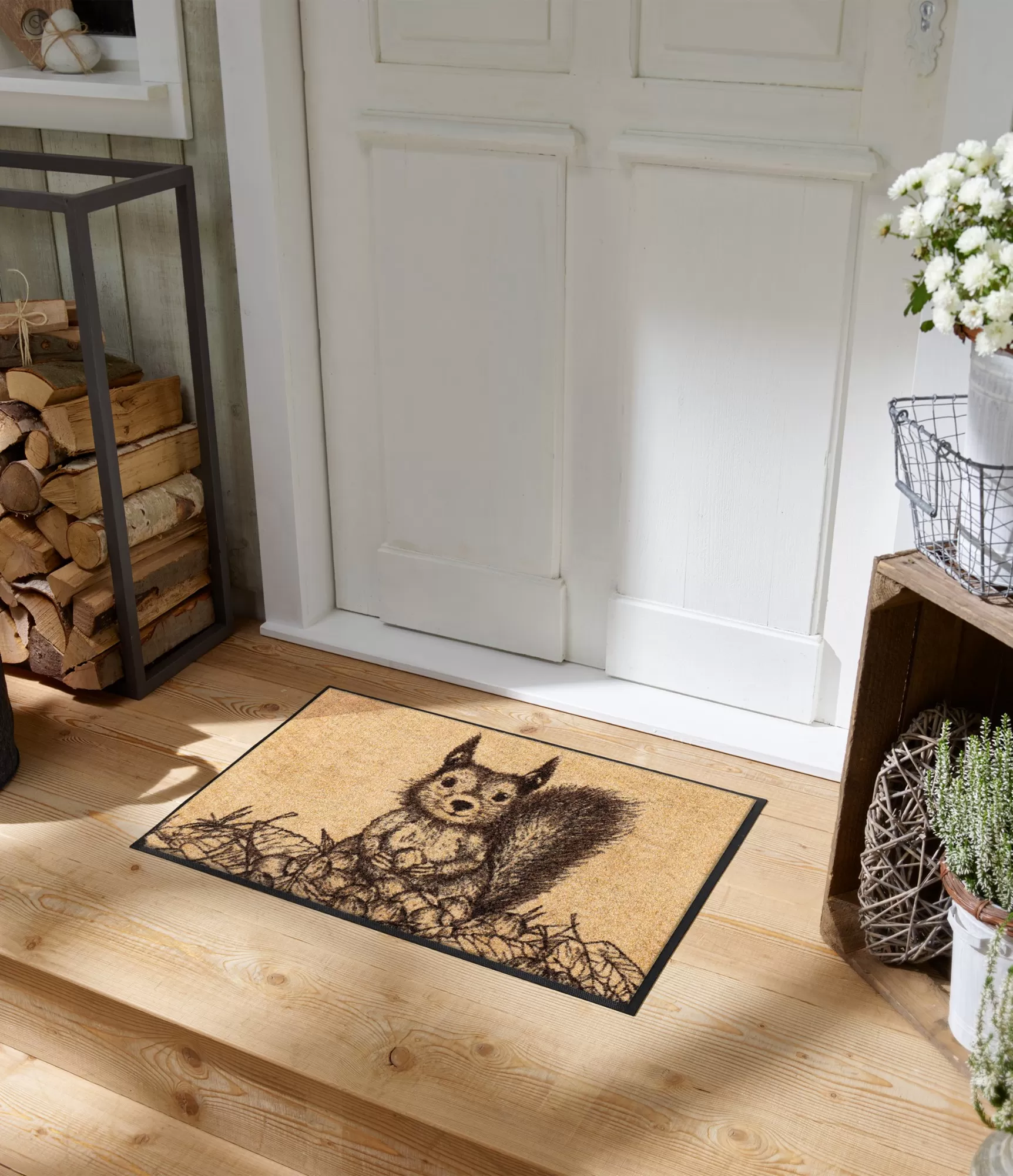Durų kilimėlis „Squirry“ išsiskiria šiltu, natūraliu dizainu, kuriame pavaizduota miela voverė tarp rudeniškų lapų ir gilių. Švelnūs žemės tonai ir subtilus piešinio stilius sukuria jaukią, ramią nuotaiką, kuri puikiai tinka namų įėjimo erdvei. Šis dizainas suteikia šilumos pojūtį ir lengvai įsilieja tiek į klasikinį, tiek į natūralaus stiliaus interjerą.