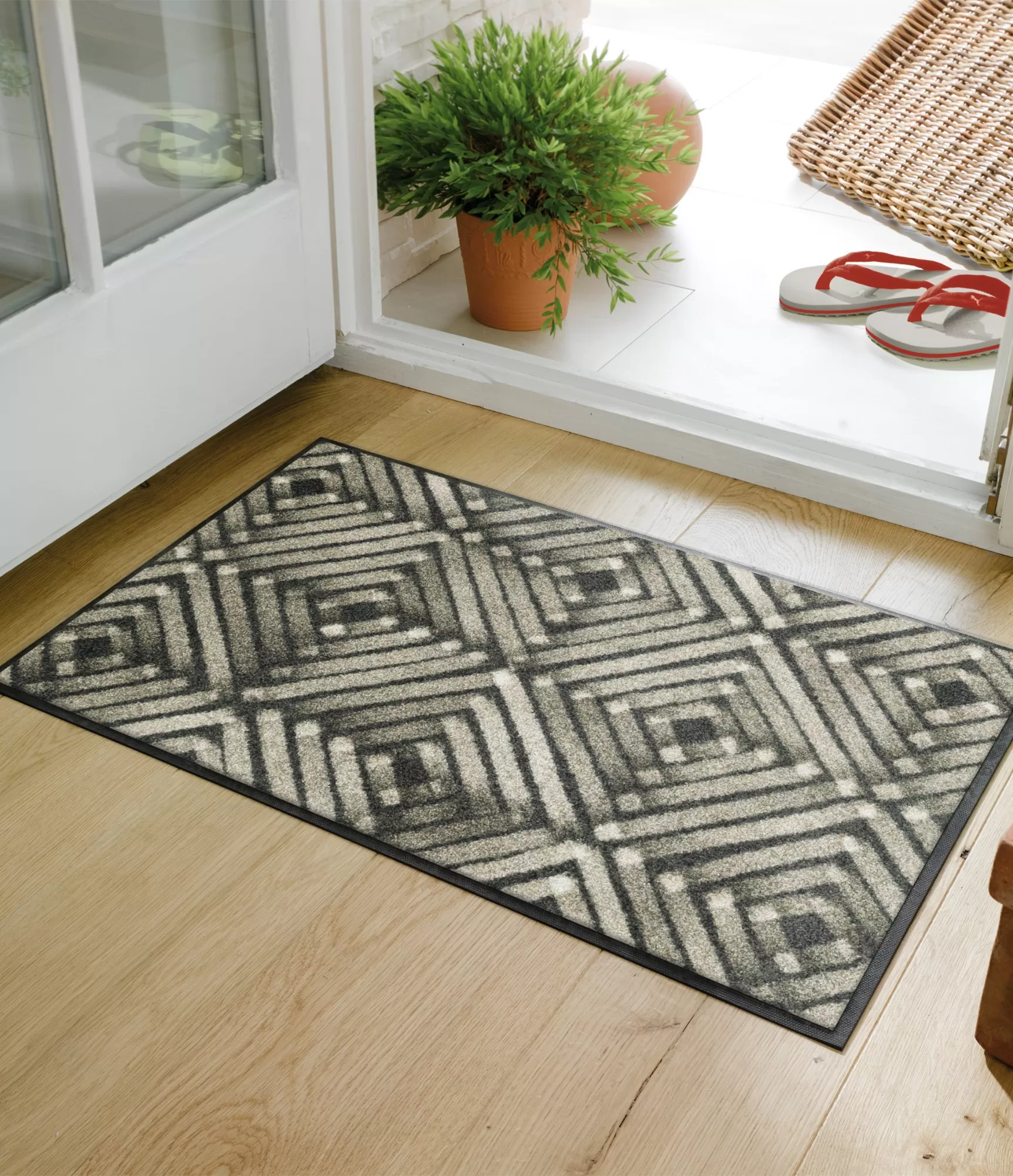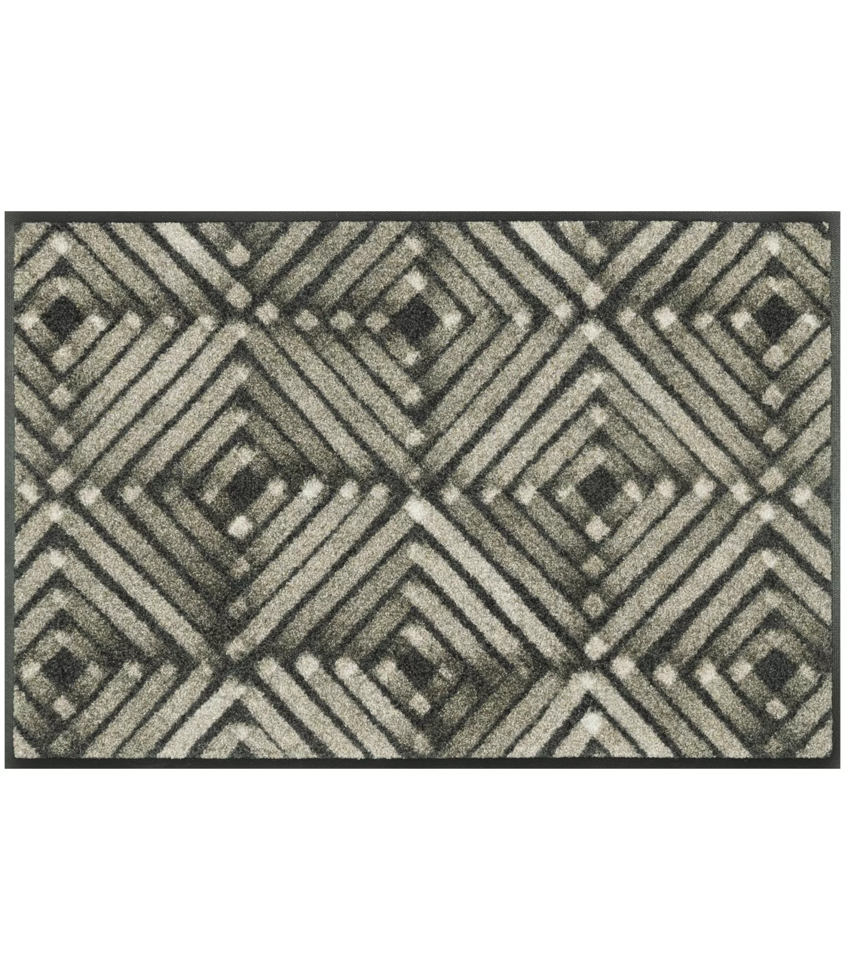 Praktiškas durų kilimėlis „Timberlink“ išsiskiria ryškiu, grafišku rombų raštu, kuris suteikia erdvei struktūros ir vizualinio ritmo. Juodos, pilkos ir šviesios spalvos derinys kuria kontrastingą, tačiau lengvai priderinamą dizainą. Pasikartojantys geometriniai elementai suteikia kilimėliui modernumo, o šiek tiek „suminkštintas“ raštas išlaiko jaukumo pojūtį.