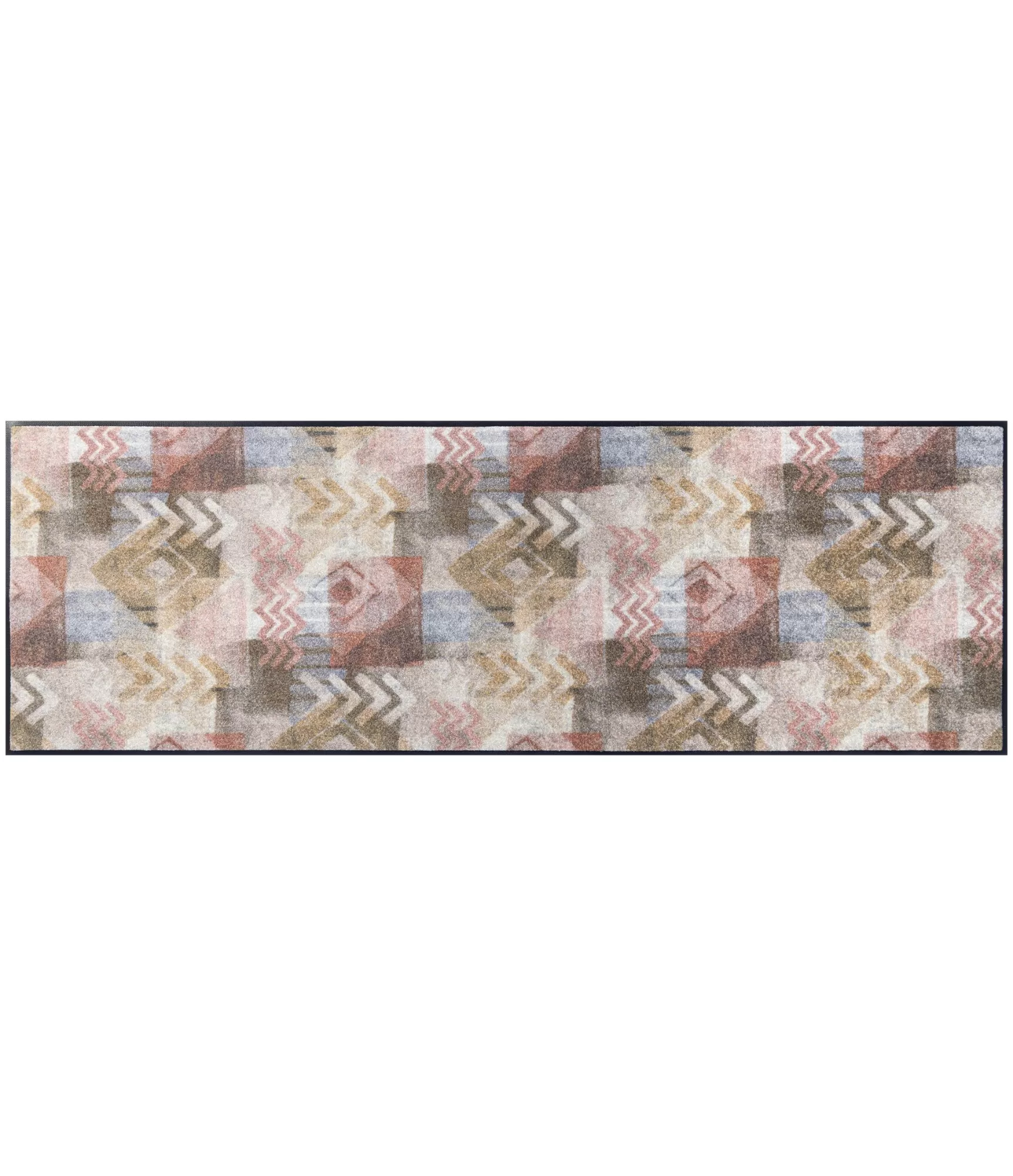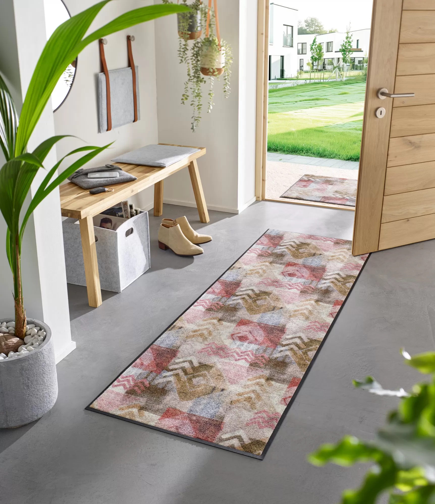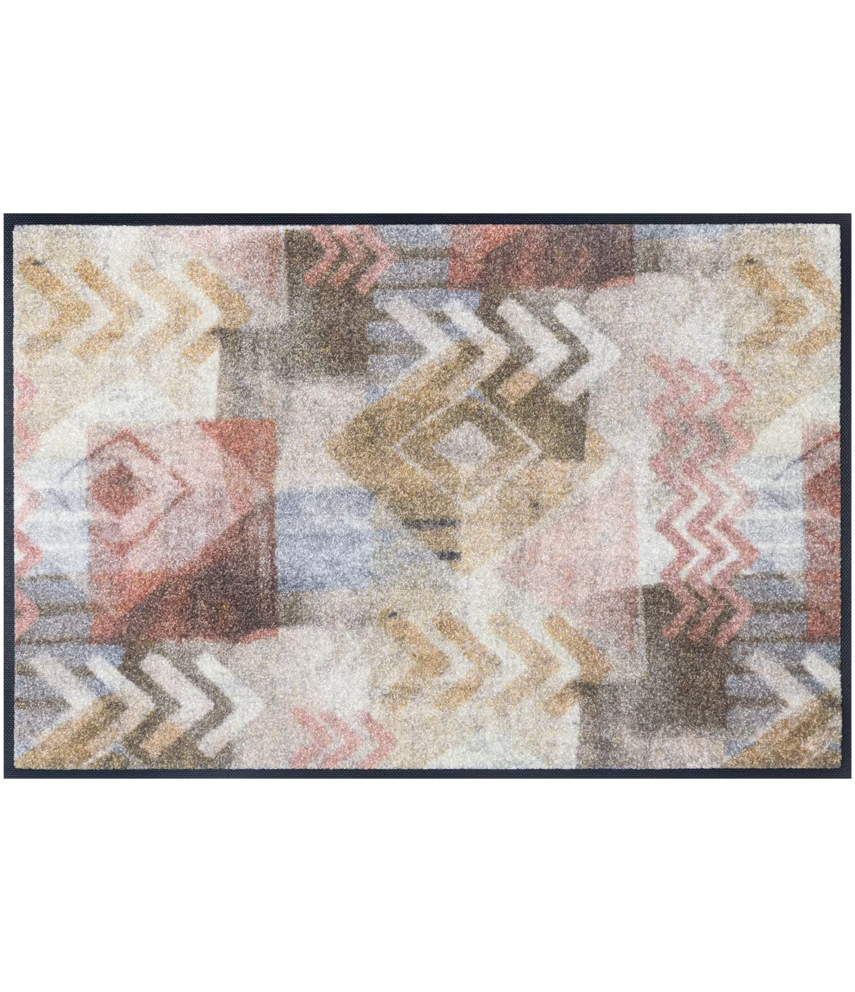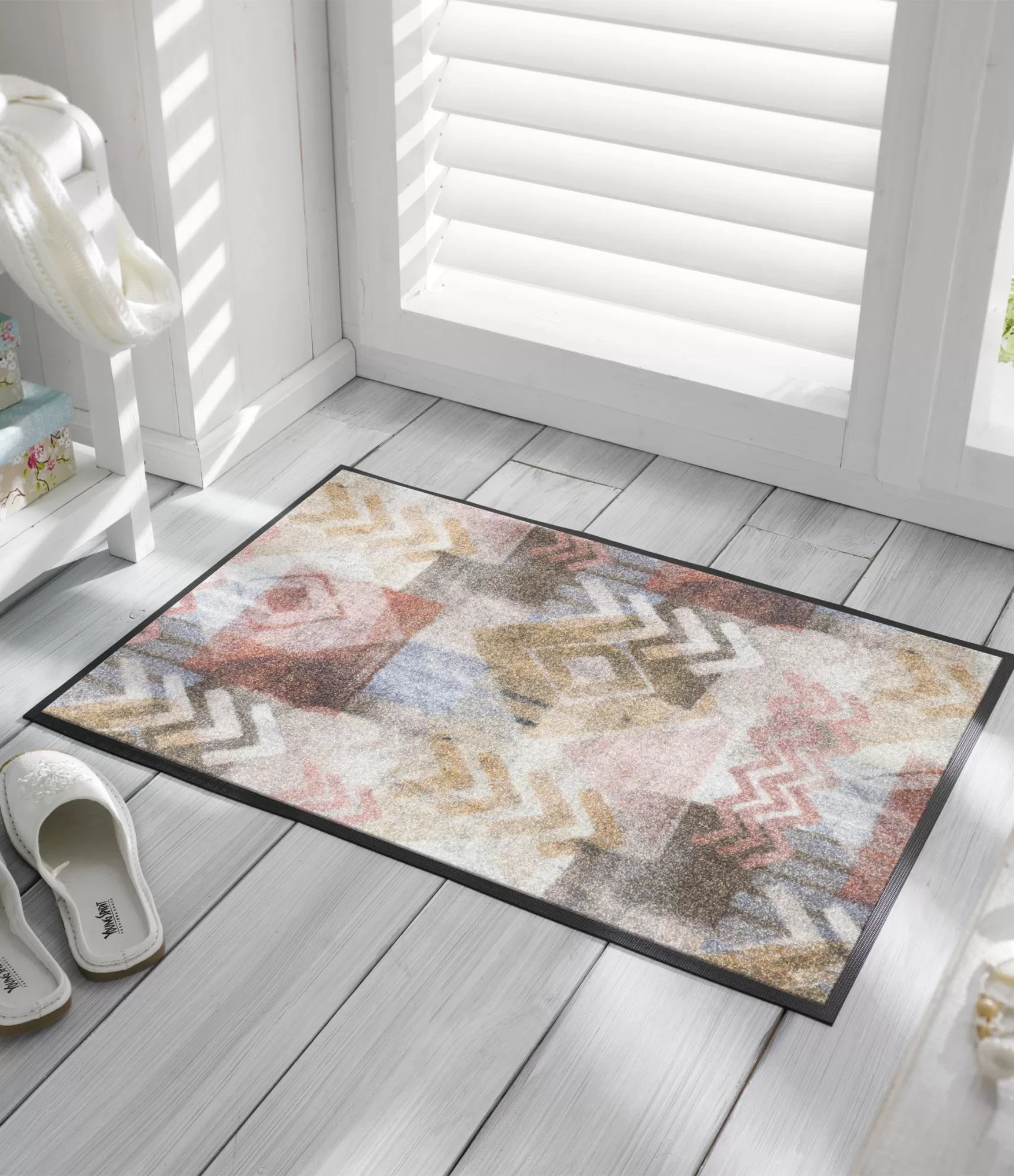Madingas durų kilimėlis "Timesign" išsiskiria šiuolaikišku geometriniu dizainu, kuriame dera subtilūs raštai ir švelni, natūrali spalvų paletė. Šis sprendimas pasižymi ramių smėlio, pilkų, rusvų ir prislopintų rausvų tonų deriniu, todėl lengvai įsilieja į įvairius interjerus. Dizainas atrodo moderniai, tačiau neperkrauna erdvės, todėl puikiai tinka tiek minimalistiniams, tiek jaukesniems namams.