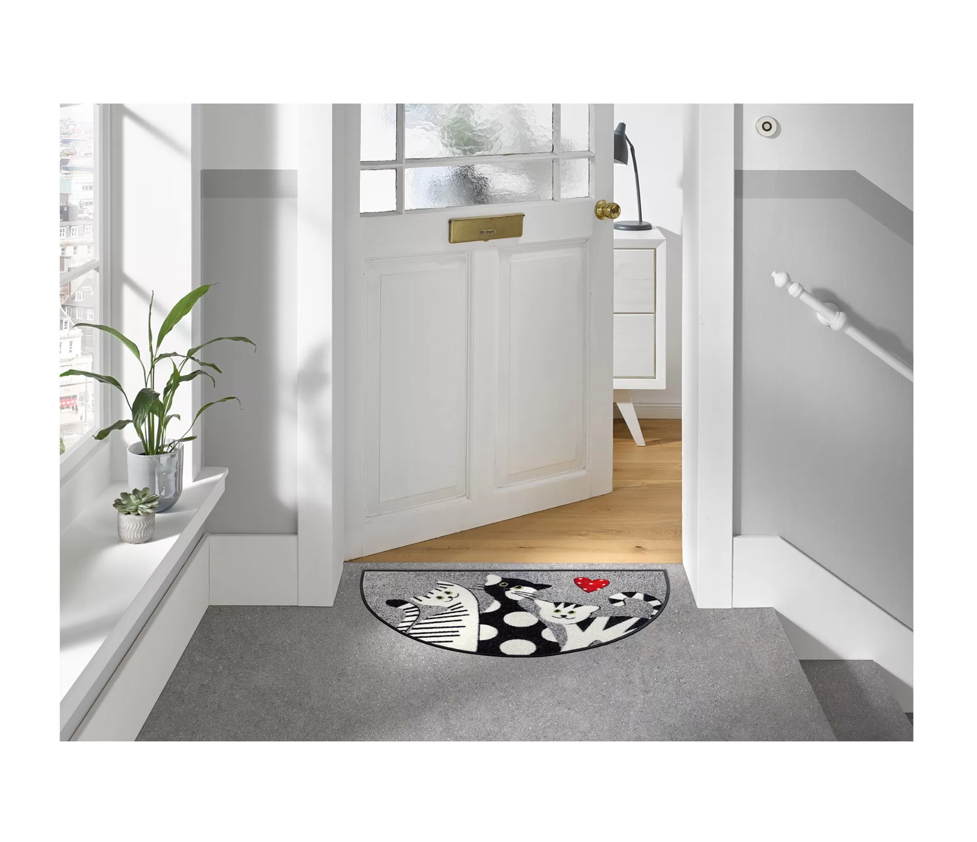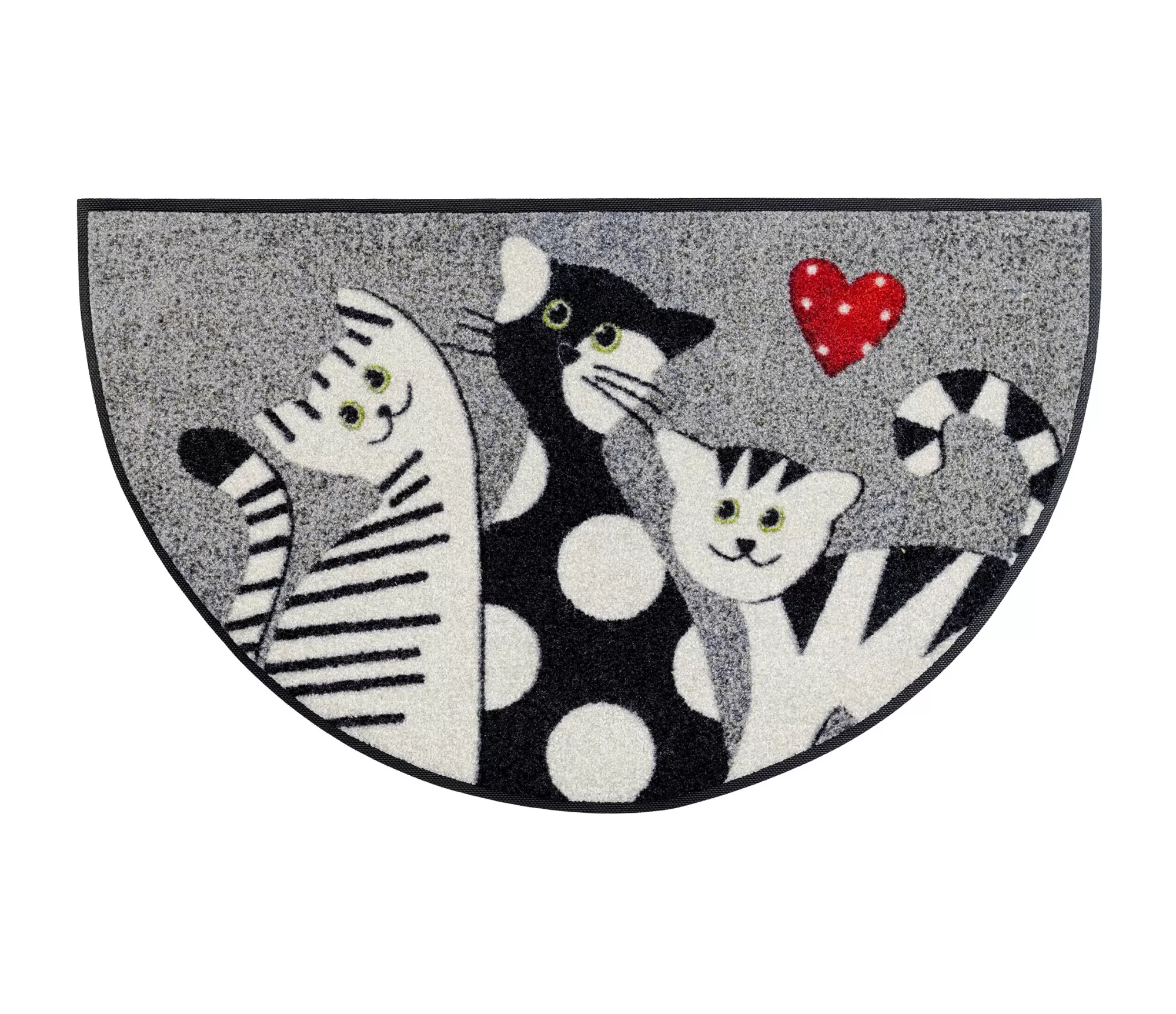 Durų kilimėlis Cat Trio Round išsiskiria ne tik savo linksmu kačių motyvu, bet ir netradicine pusapvale forma, kuri suteikia įėjimui daugiau charakterio. Subtilus pilkų atspalvių fonas lengvai dera įvairiuose interjeruose, o kontrastingi juodai balti piešiniai su ryškiu akcentu sukuria jaukią ir šiltą nuotaiką.