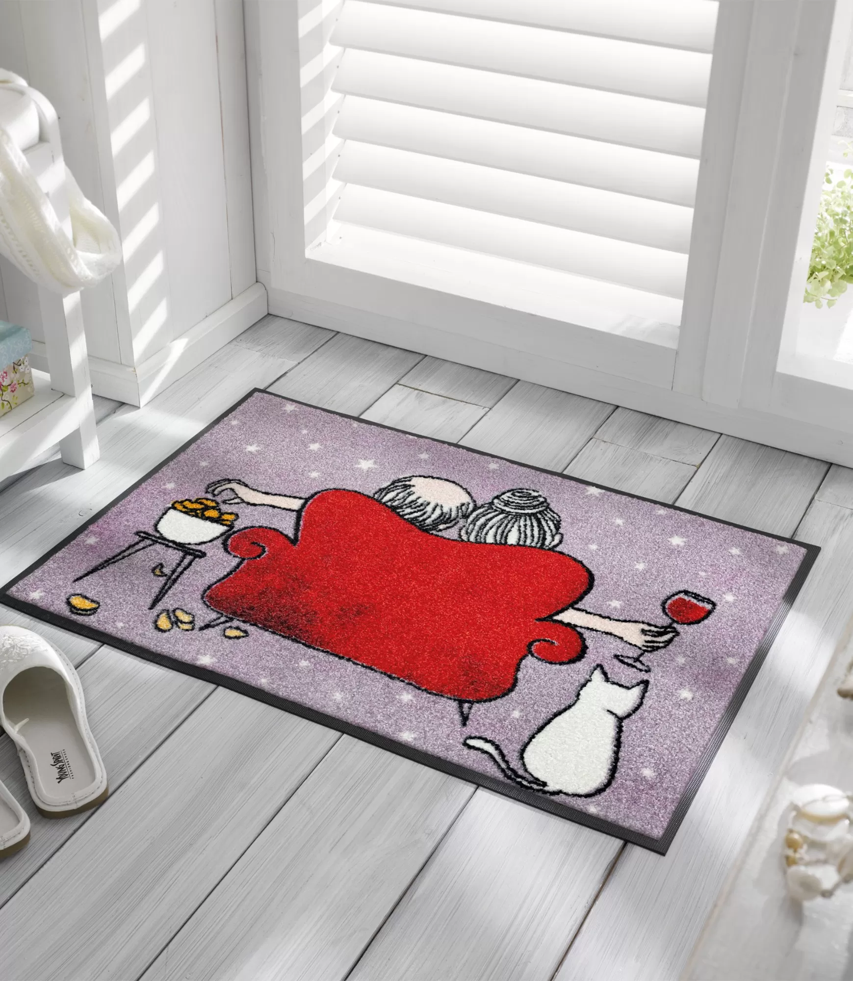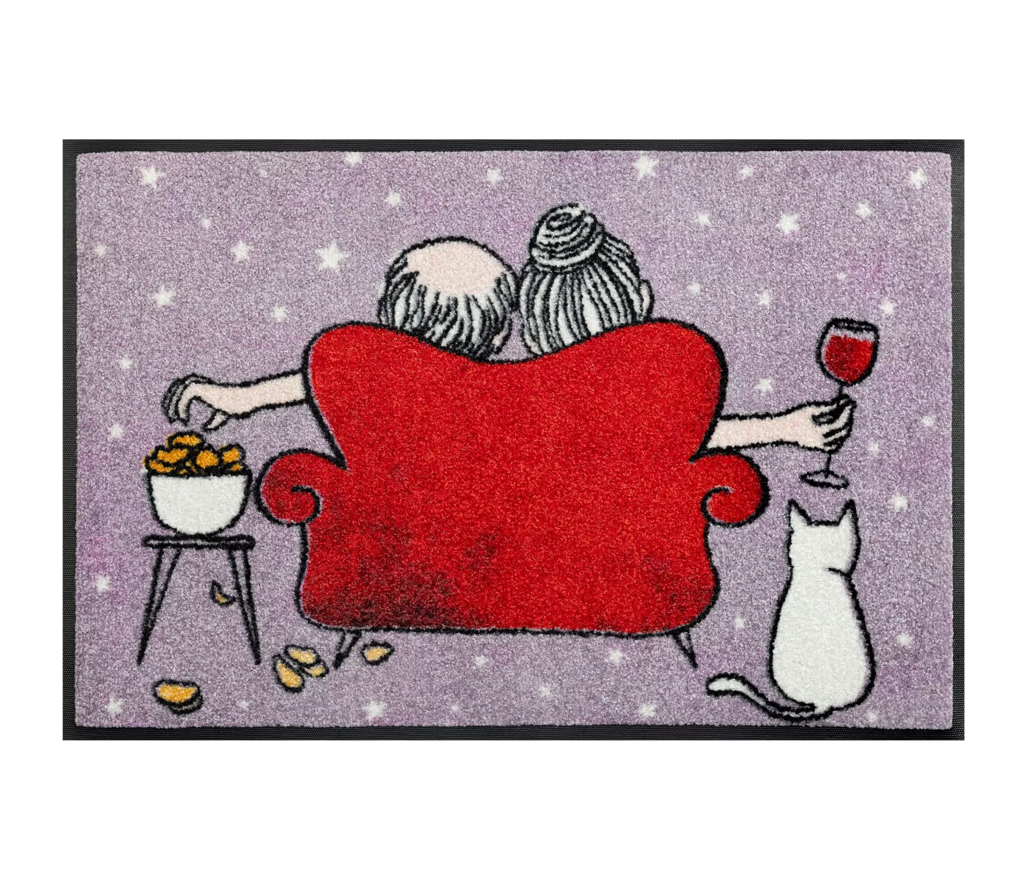 Durų kilimėlis Good Times išsiskiria šiltu ir šmaikščiu dizainu, kuris iš karto sukuria jaukumo jausmą. Pavaizduota scena – du žmonės patogiai įsitaisę ant ryškiai raudonos sofos, šalia jų augintinis, lengvas užkandis ir taurė vyno – perteikia atsipalaidavimo, artumo ir paprastų gyvenimo malonumų nuotaiką.