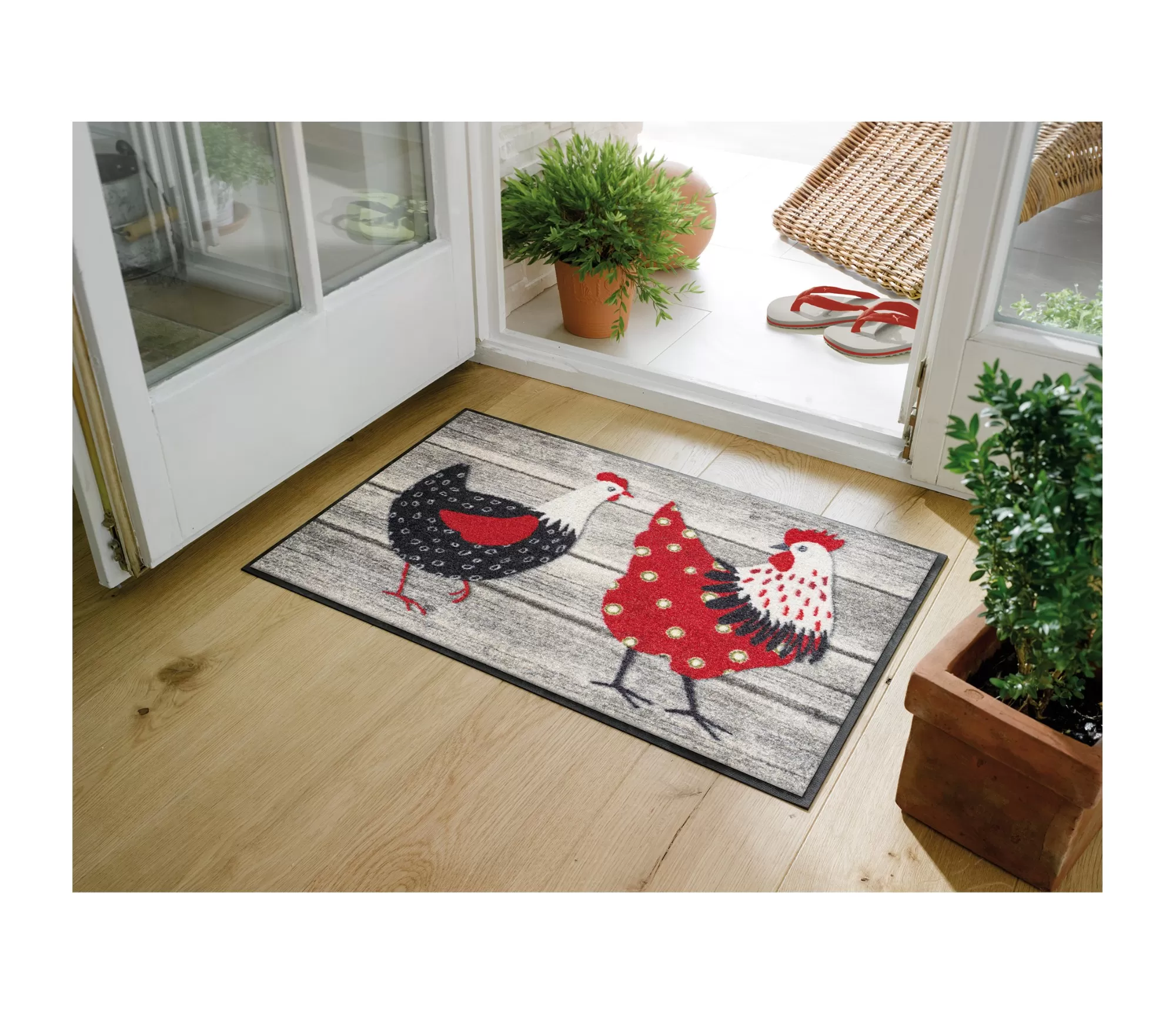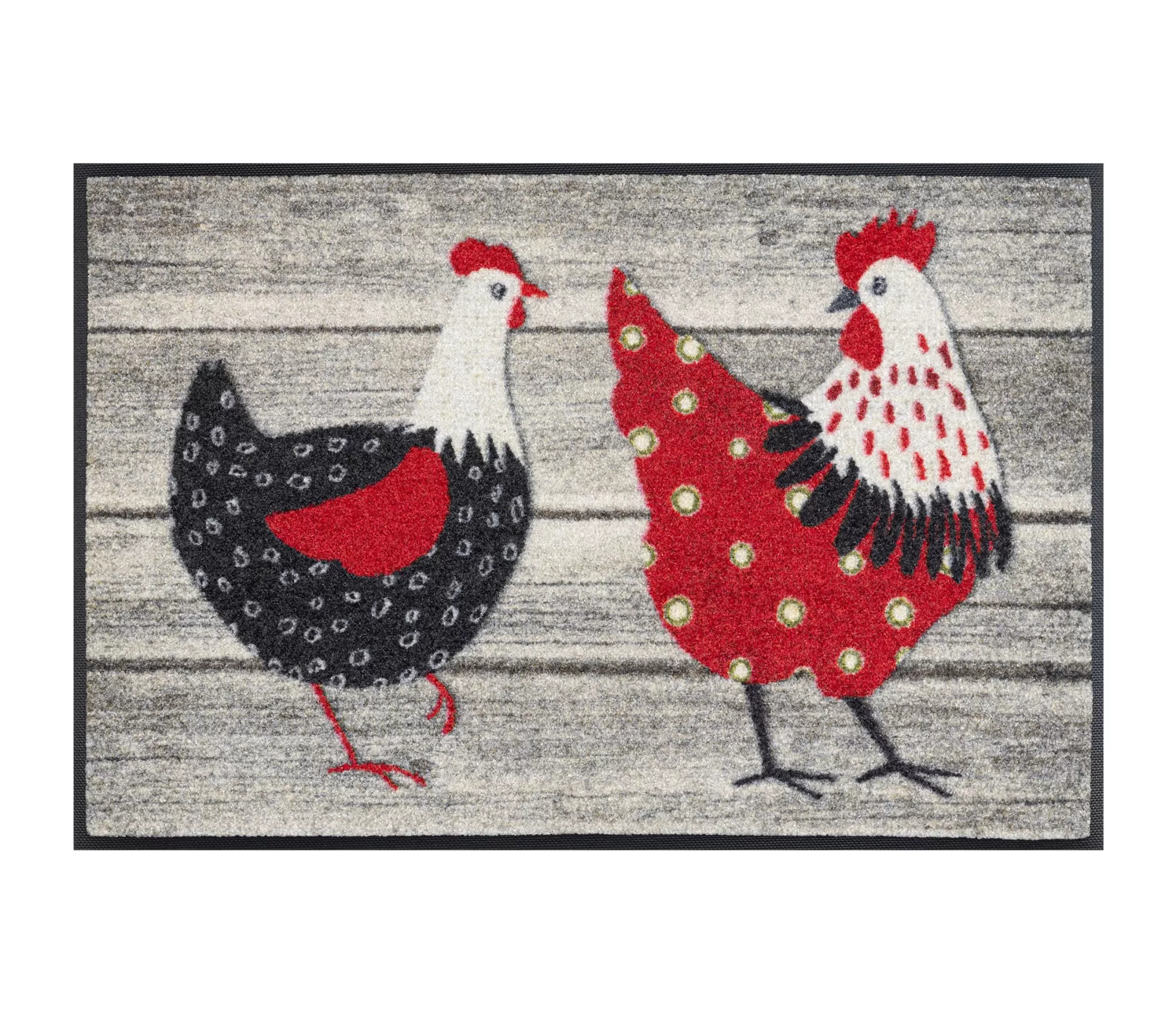 Durų kilimėlis Chicken Farm – tai žaismingas ir šiltas pasirinkimas, kuris įneša lengvo kaimiško žavesio į jūsų namų aplinką. Dvi išraiškingos vištos, pavaizduotos ant natūralių lentų fono, sukuria jaukumo ir paprastumo nuotaiką, primenančią lėtą gyvenimo ritmą ir artumą gamtai. Tai dizainas, kuris ne tik papuoš įėjimą, bet ir suteiks jam savitumo.