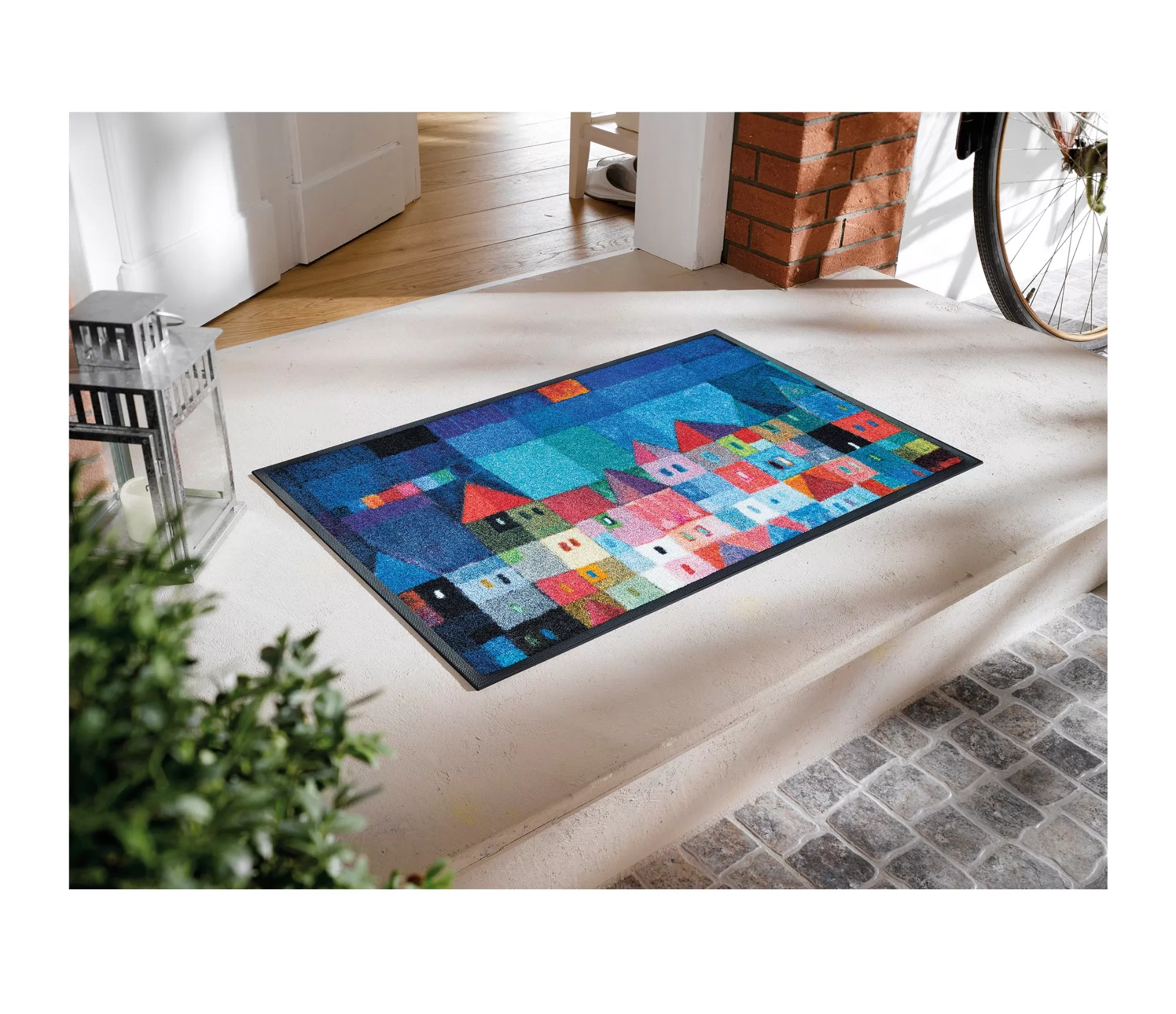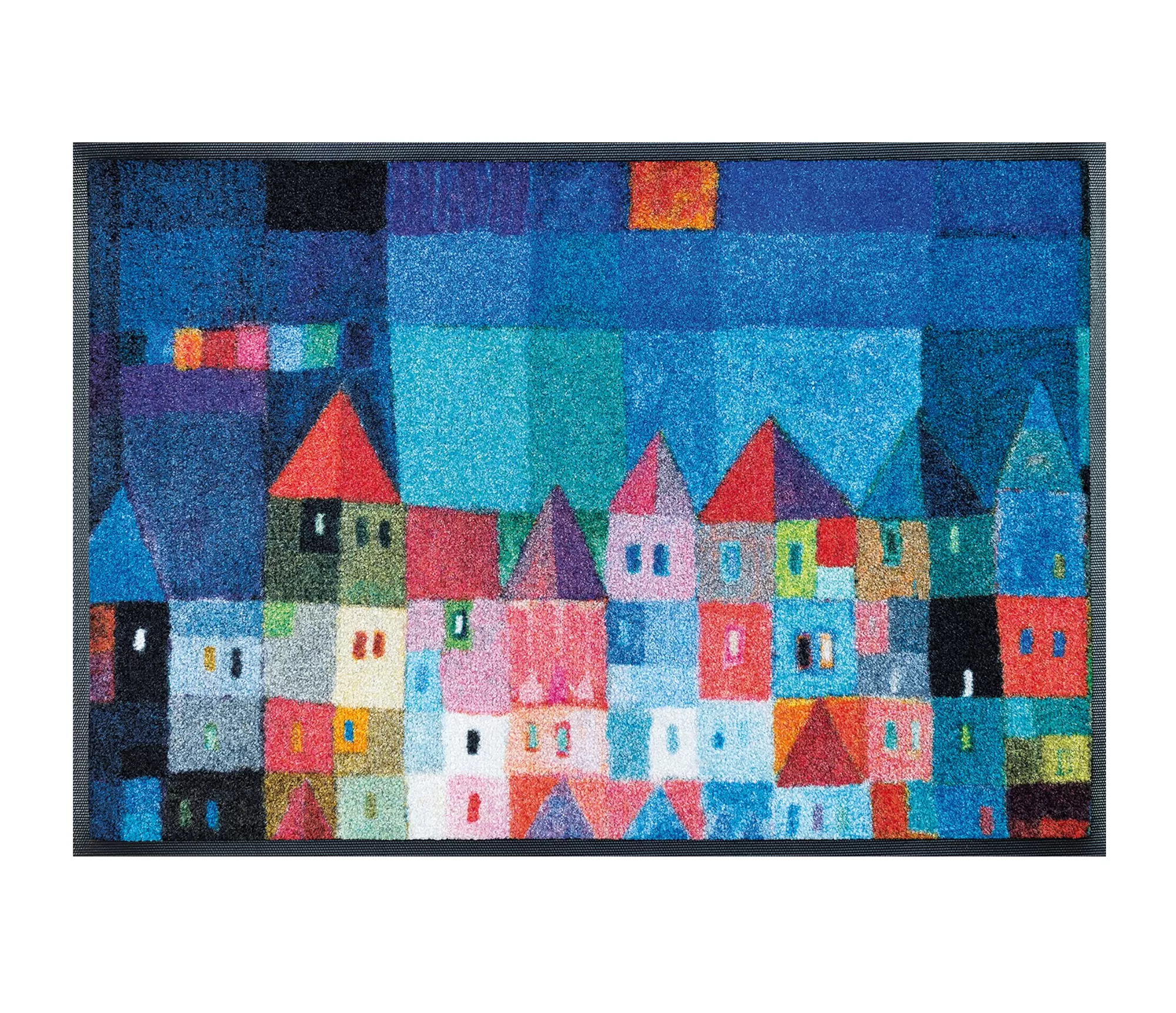 Durų kilimėlis Colourful Houses išsiskiria ryškiu, gyvybingu dizainu, kuriame susilieja spalvotų namelių kompozicija ir gilesni, sodrūs fonai. Skirtingų formų stogai, kontrastingos spalvos ir lengvas abstraktumas sukuria miesto peizažo interpretaciją, kuri atrodo moderniai ir iš karto patraukia dėmesį.