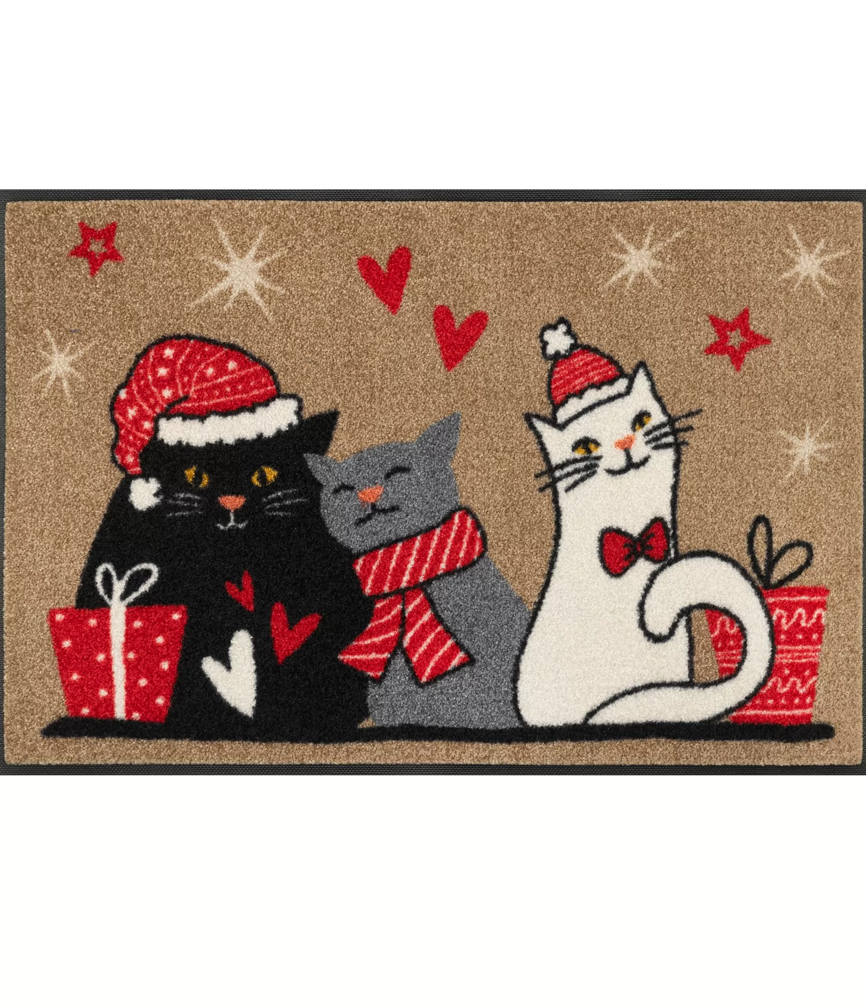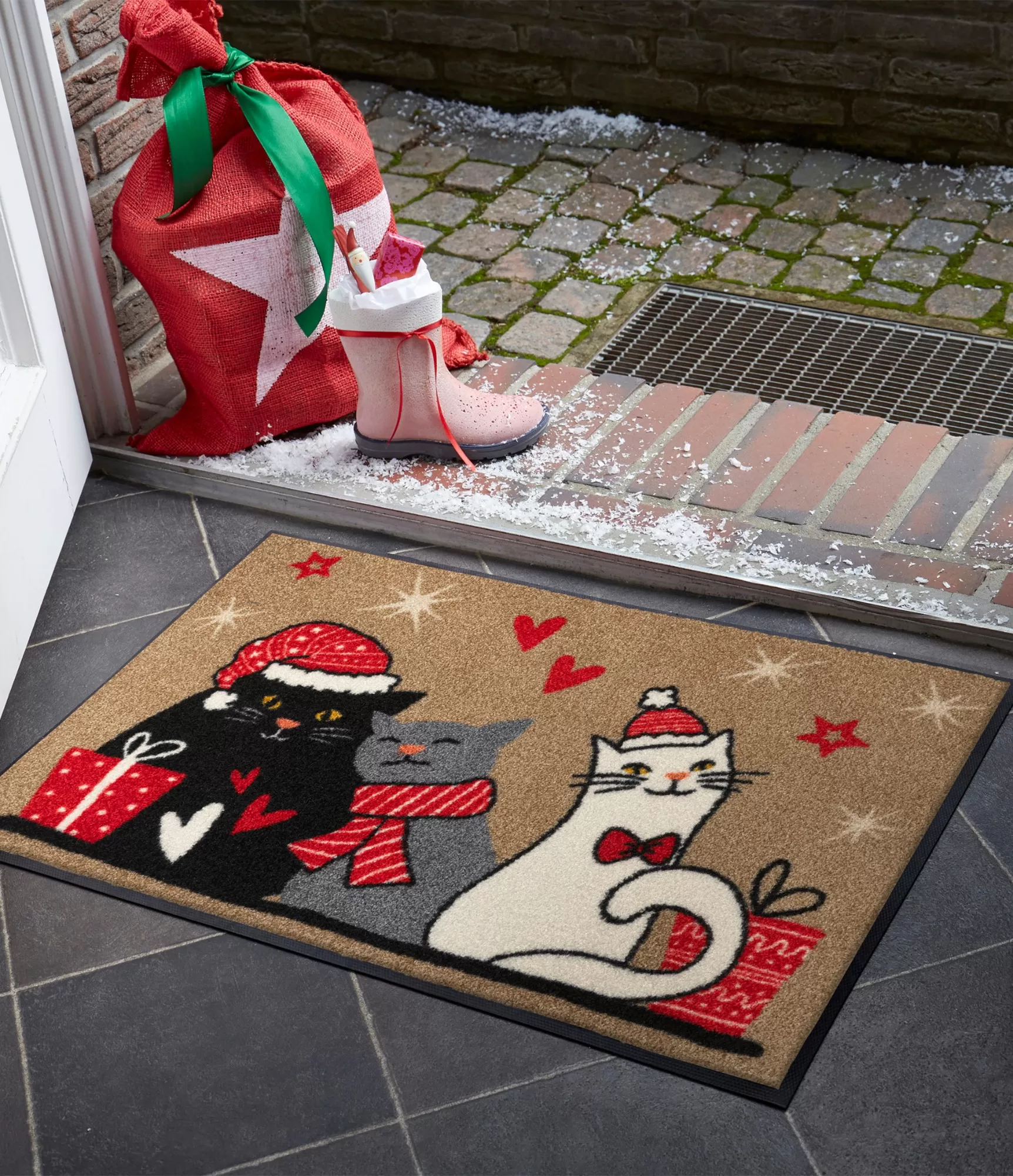 Durų kilimėlis Cuddle Time iš karto patraukia dėmesį žaismingu ir šiltu dizainu, kuriame susipina šventiniai motyvai ir mielos detalės. Katinų kompozicija su subtiliais raudonais akcentais atrodo gyvai, bet neperkrautai, todėl lengvai įsilieja į skirtingus namų stilius. Toks kilimėlis gerai dera tiek prie modernesnio, tiek prie jaukesnio, klasikinio interjero.