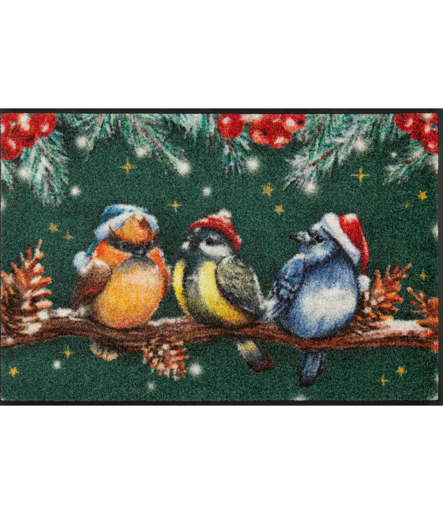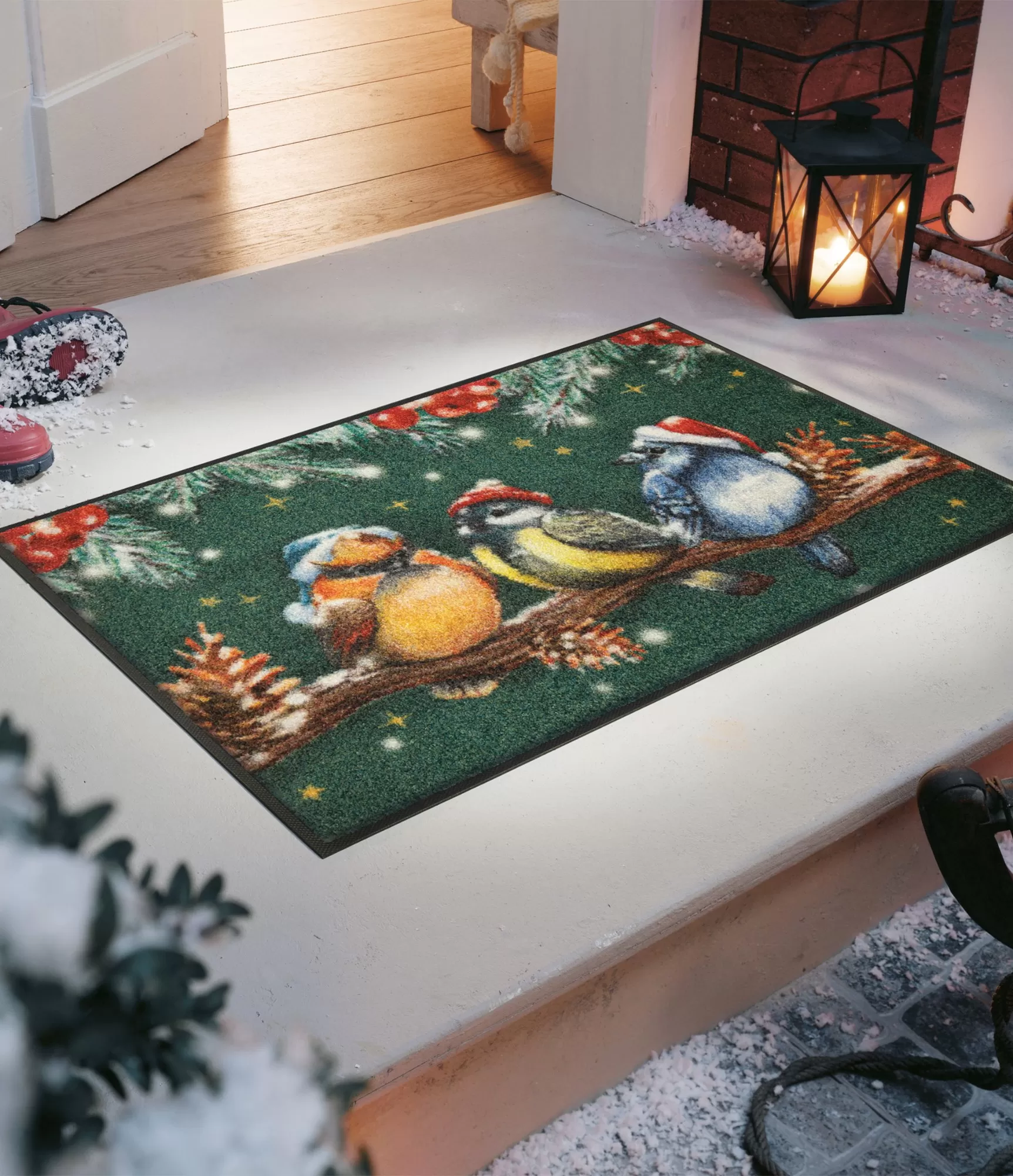Durų kilimėlis Magic Birds – tai gyvas, spalvingas sprendimas, kuris įneša judesio ir nuotaikos į namų erdvę. Ant šakos tupintys paukšteliai su subtiliais žieminiais akcentais kuria natūralų, lengvai atpažįstamą vaizdą, kuris atrodo šiltai ir jaukiai, bet tuo pačiu išlaiko stilingą balansą. Sodrus fonas ir smulkios detalės leidžia kilimėliui tapti pastebima interjero dalimi, tačiau jis neperkrauna erdvės. Toks kilimėlis puikiai tinka ne tik prie įėjimo durų – jis lengvai pritaikomas koridoriuje, virtuvėje, prie terasos ar kitose namų vietose, kur norisi daugiau spalvos, gyvybės ir jaukumo žiemos laikotarpiu.