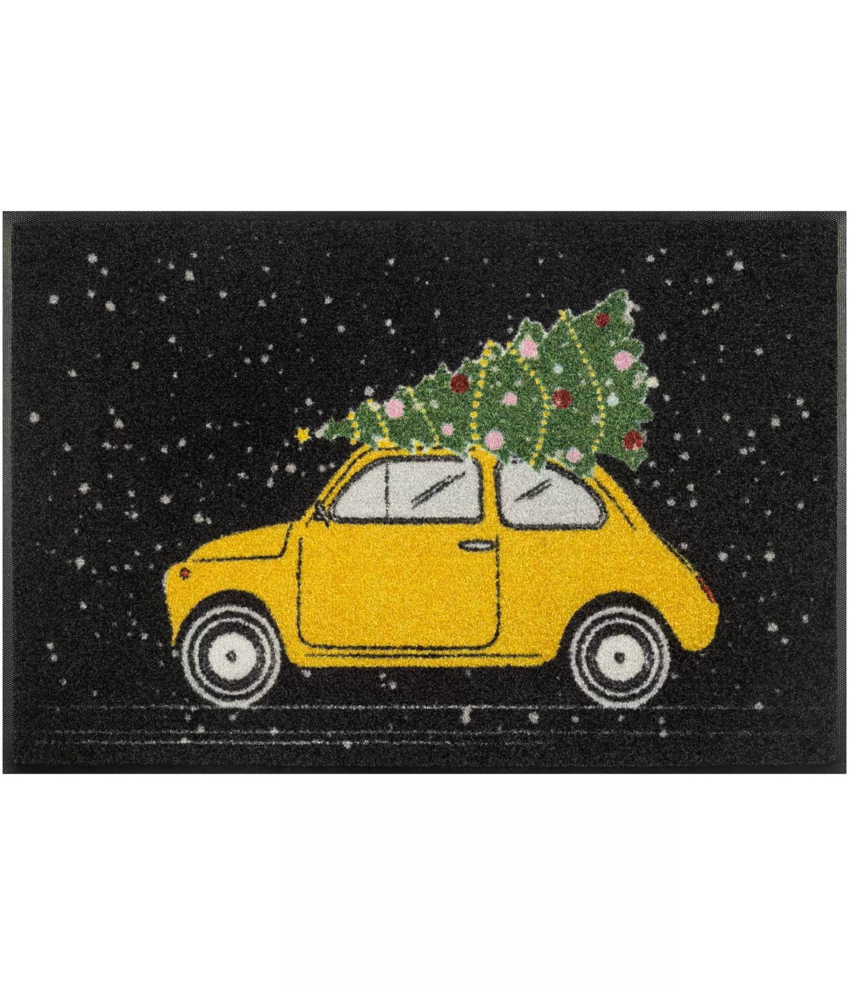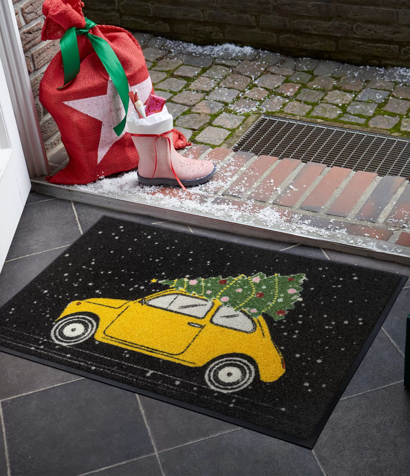 Durų kilimėlis On the way išsiskiria žaismingu ir lengvai atpažįstamu dizainu, kuris iš karto sukuria šventinę nuotaiką namuose. Ryškus geltonas automobilis su eglute ant stogo perteikia judesį ir pasiruošimą žiemos šventėms, o kontrastingas tamsus fonas su sniego efektu leidžia spalvoms atsiskleisti dar stipriau. Šis gaminys ne tik papildo įėjimo zoną, bet ir tampa vizualia detale, kuri prisideda prie bendros namų atmosferos kūrimo. Jis lengvai pritaikomas įvairiose erdvėse – nuo prieškambario iki virtuvės ar terasos, todėl padeda sukurti vientisą ir stilingą aplinką visame namų interjere.