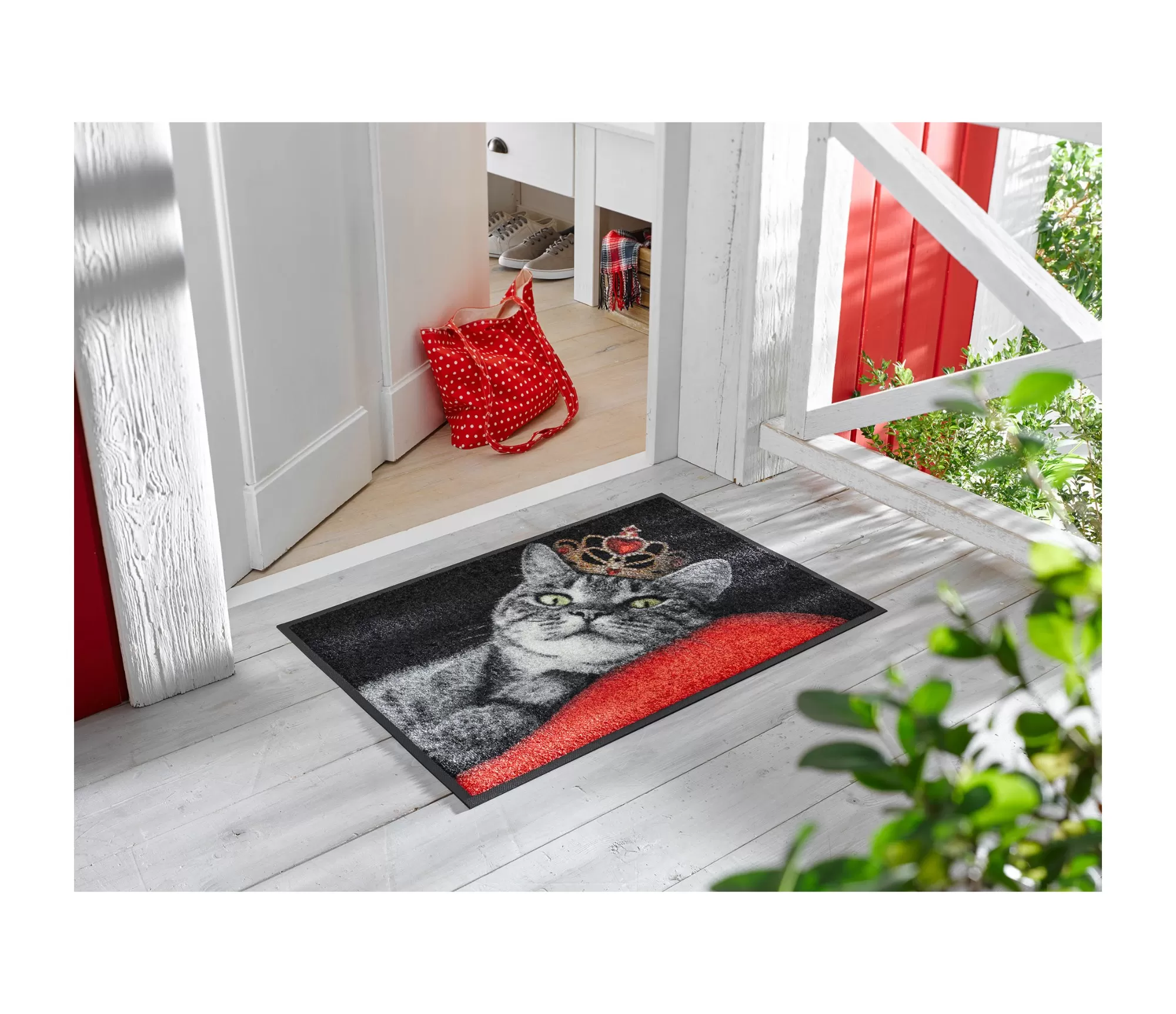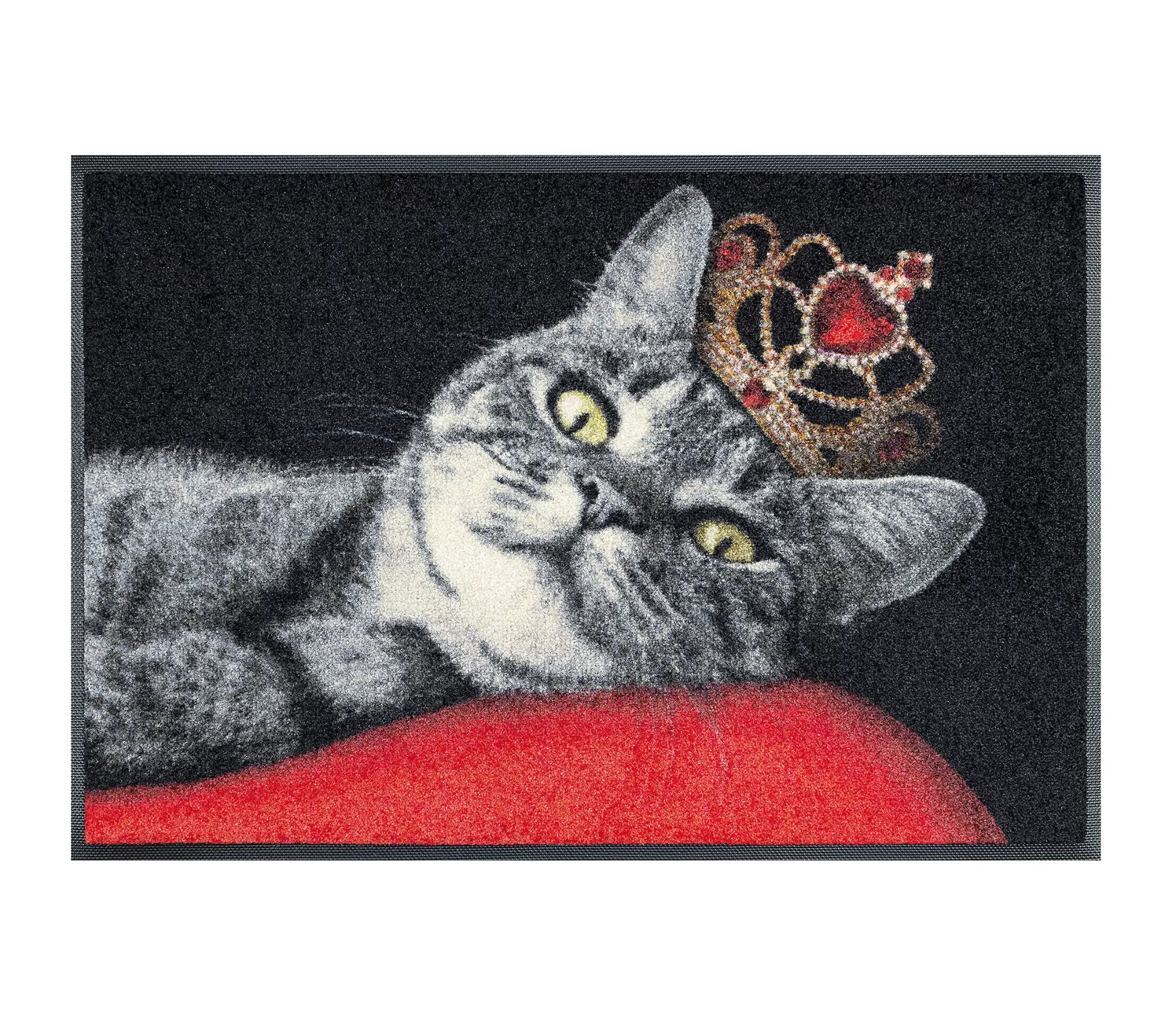Durų kilimėlis Royal Cat – tai ne tiesiog praktiškas daiktas, o tikras interjero personažas. Ant minkštos pagalvės patogiai įsitaisiusi katė su karūna sukuria lengvą ironiją ir elegancijos pojūtį vienu metu. Tai dizainas, kuris patraukia dėmesį ir suteikia įėjimui savitumo – tarsi subtili užuomina, kad šiuose namuose gyvena stilių vertinantys žmonės.