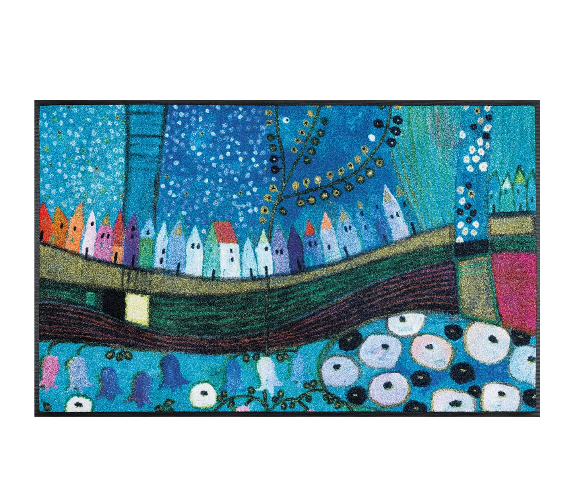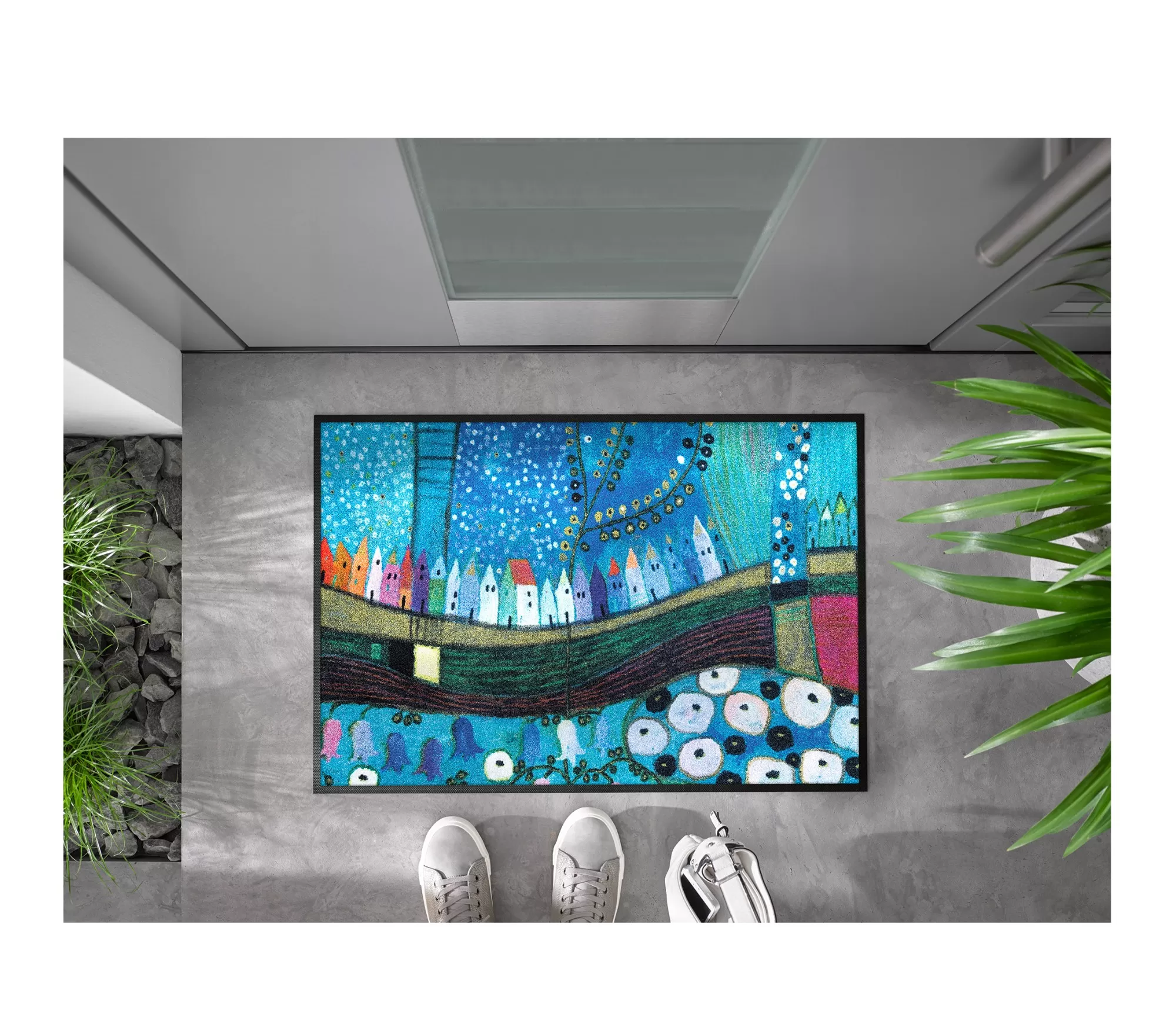 Durų kilimėlis Stadt in Blau išsiskiria sodria mėlynų atspalvių palete ir išraiškinga, menine kompozicija. Smulkūs namelių siluetai, išsidėstę tarsi banguojančiame horizonte, kuria dinamišką miesto vaizdą, papildytą subtiliais augaliniais motyvais ir lengvu dekoratyviniu ritmu.