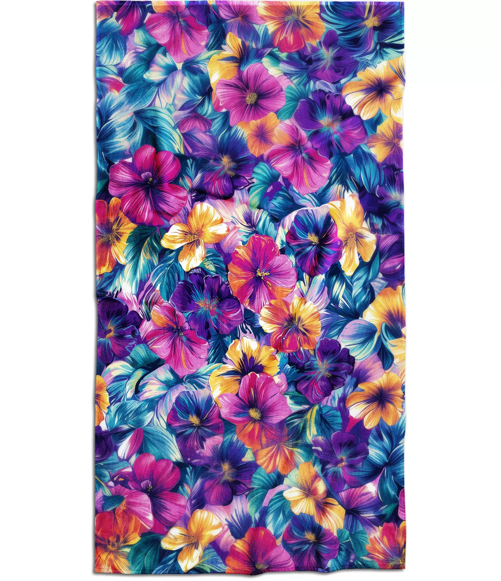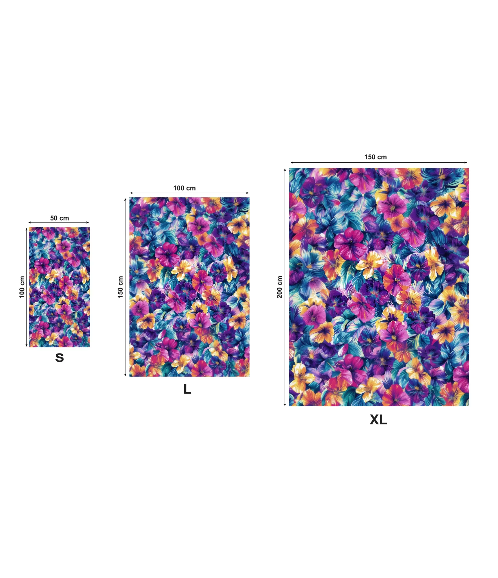 Šis ryškus, energija pulsuojantis rankšluostis atrodo tarsi įsiliejęs iš atogrąžų sodo – ne vien dėl spalvų, bet ir dėl to, kaip jos sklinda per visą paviršių. Gėlių žiedai čia susilieja į vieną begalinę vasaros simfoniją: rožiniai, violetiniai, oranžiniai, geltoni žiedlapiai kontrastuoja su sodriai žaliais ir melsvais lapais. Tai ne šiaip gėlės – jos sprogsta, šviečia, kuria šventę akims. Kiekvienas žiedas – tarsi atskira istorija, šokanti saulėje. Kiekviena spalva – priminimas apie karštas dienas, pilnas kvapų ir lengvo vėjo. Ši pusė pagaminta iš lygaus, blizgaus poliesterio, todėl visos spalvos išlieka neblunkančios, ryškios, skirtos džiuginti. Kita pusė – balta, minkšta, pagaminta iš 100 % medvilnės, skirta komfortiškam šluostymuisi ir kūno palepinimui po maudynių.