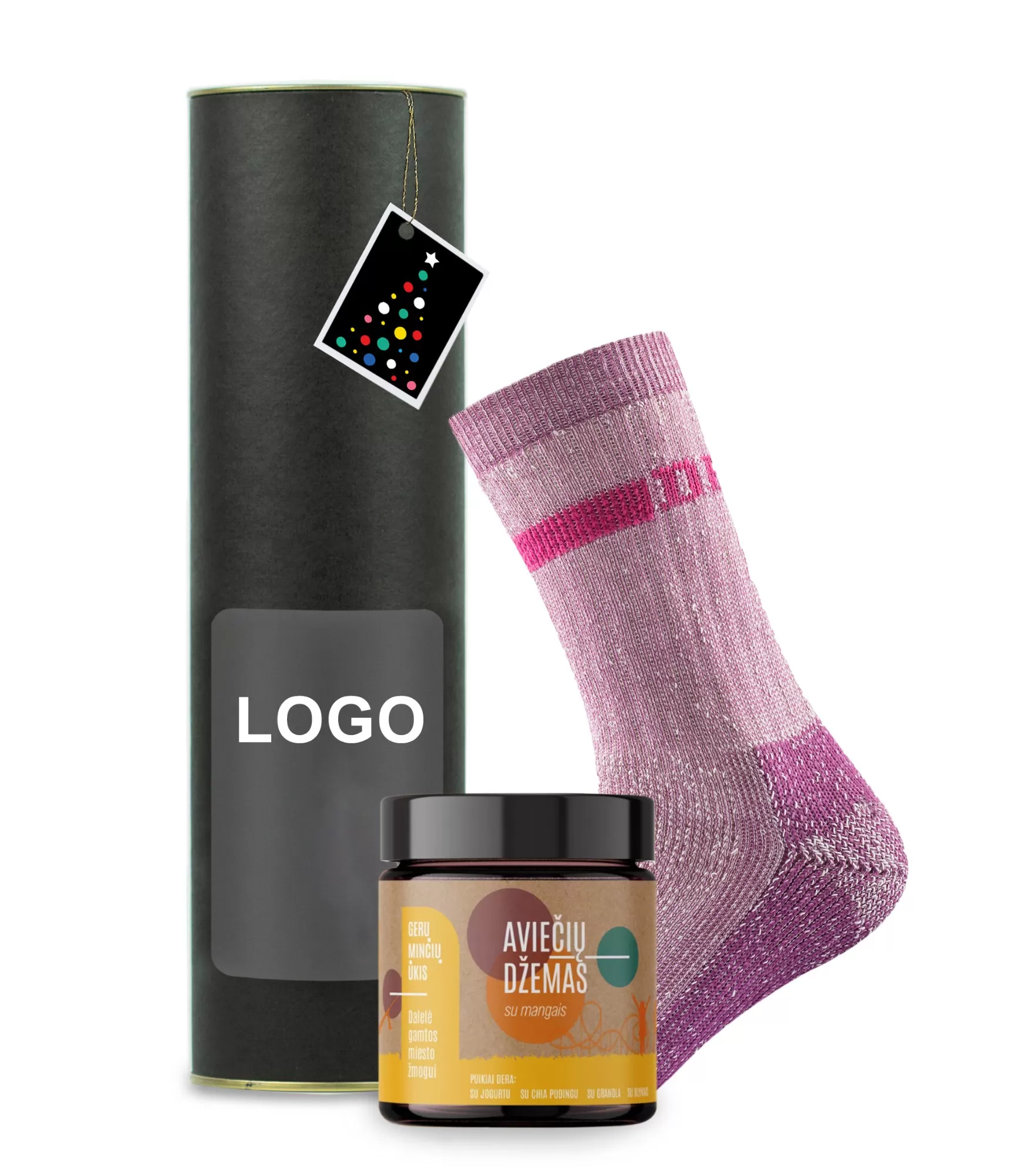 Jei reikalinga jauki ir originali verslo dovana Kalėdų proga - tai idealus pasirinkimas - šiltos vilnonės kojinės ir rankų darbo aviečių džemas su mango. Visa tai su meile supakuota į Kalėdinę pakuotę.