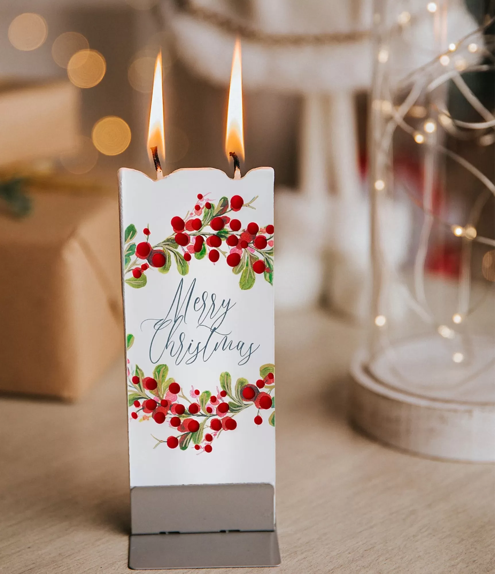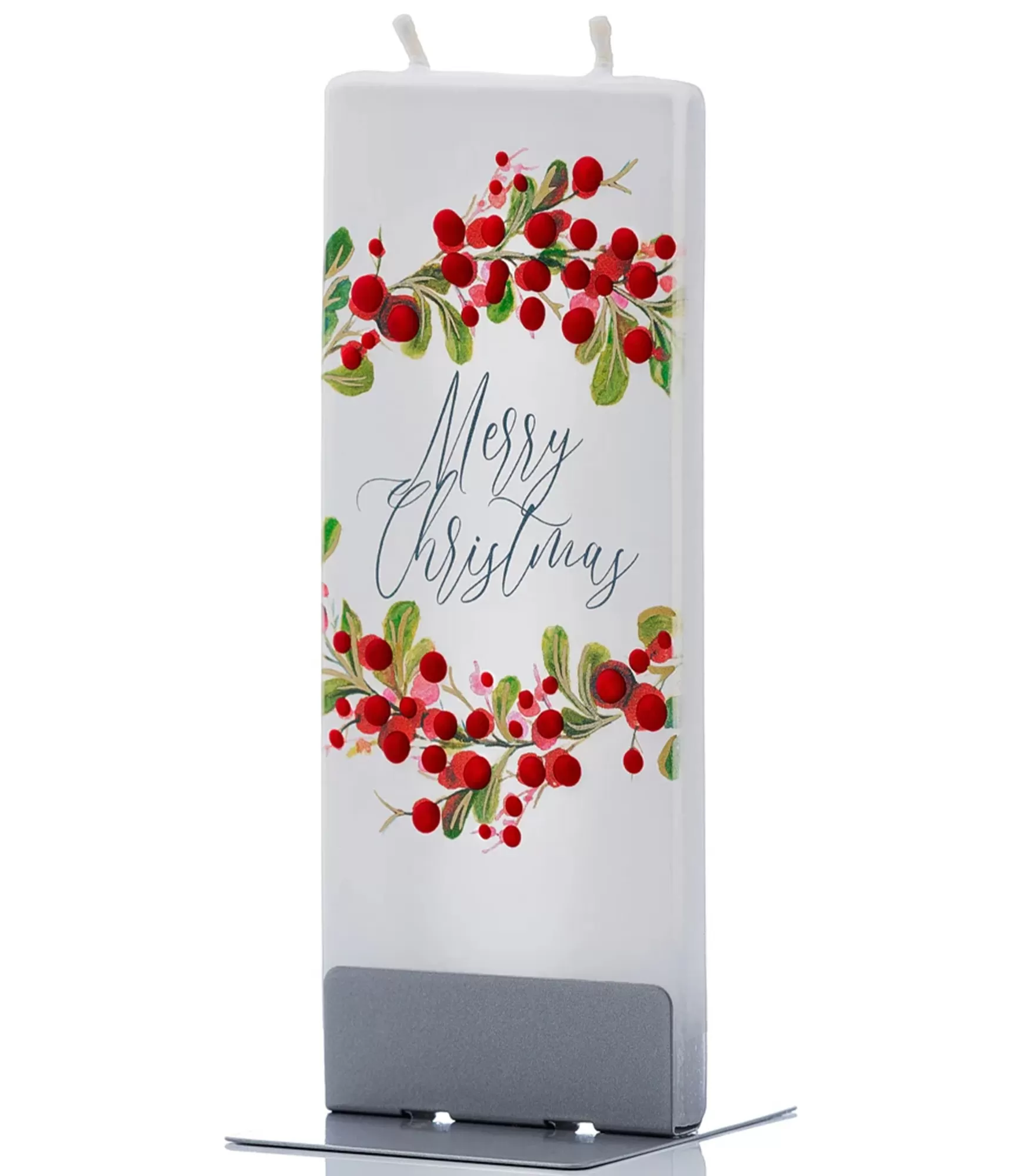 Plokščia rankų darbo žvakė "Merry Christmas D20046" – tai universalus ir elegantiškas šventinio džiaugsmo simbolis. Šviesus dizainas, papuoštas subtiliu uogų vainiku ir grakščiu užrašu, įkūnija tradicinę Kalėdų estetiką, kuri lengvai randa vietą bet kuriame interjere. Gaminys džiugina ne tik savo iliustracija, bet ir kokybišku, itin švariu degimu.
