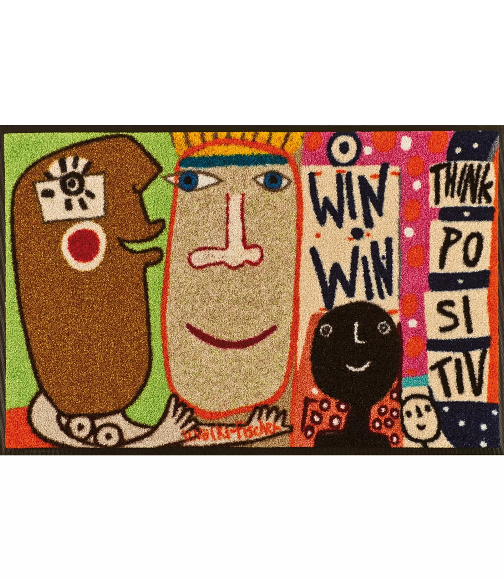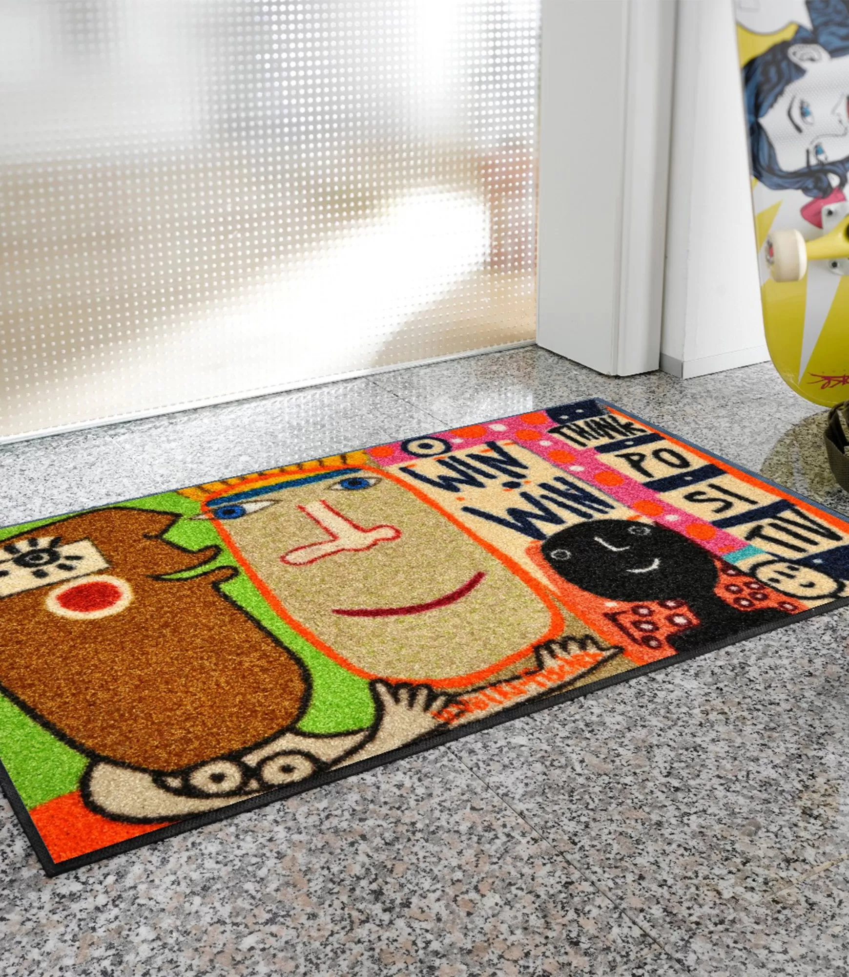 Durų kilimėlis „Think Positiv“ iš karto patraukia dėmesį savo ryškiu, meniniu dizainu, kuris primena šiuolaikinės iliustracijos ir gatvės meno derinį. Drąsios spalvos, išraiškingi veidai ir žaismingi užrašai kuria energingą, pozityvią nuotaiką, kuri pasitinka vos pravėrus duris.