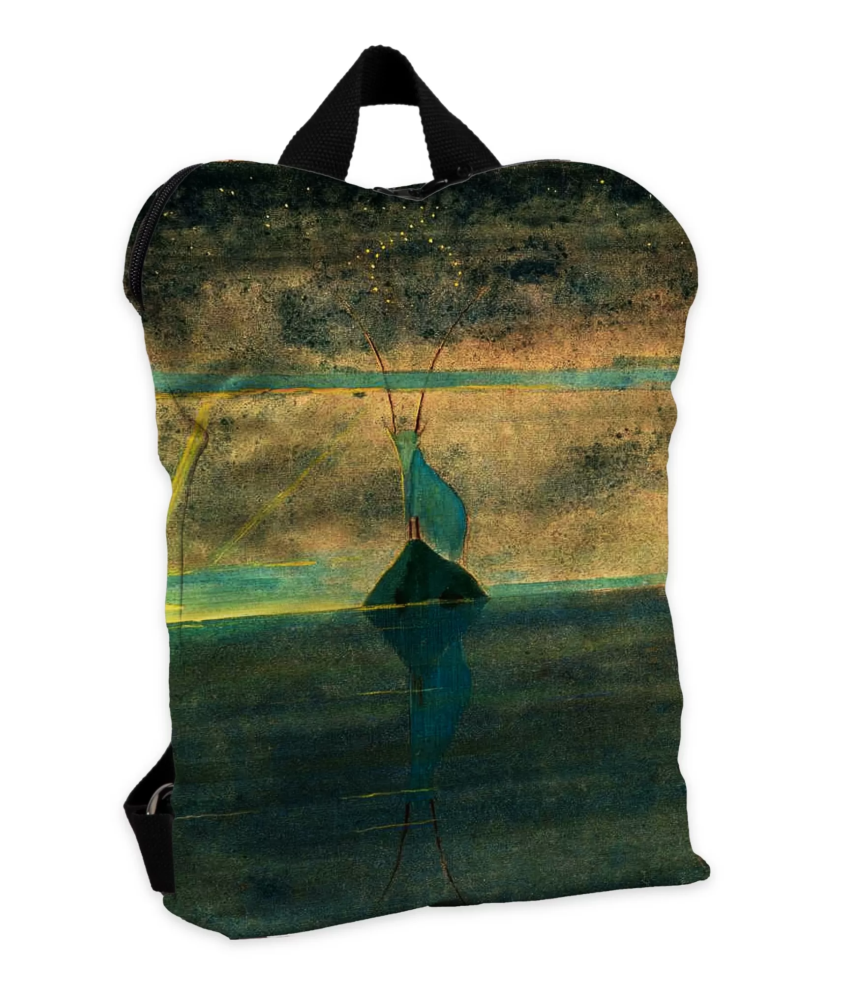 Kai kuprinė tampa daugiau nei tik daiktu – kai ji pradeda kalbėti apie vidinę jėgą, kantrybę ir tylų ryžtą – tuomet ji virsta asmeniniu simboliu. Būtent tokia yra ši moteriška kuprinė su M. K. Čiurlionio paveikslo „Saulė eina Ožiaragio ženklu“ motyvu. Tai ne tik aksesuaras – tai istorija, kurią nešioji ant pečių. Čiurlionio kūrinys alsuoja susikaupimu, vidine šviesa ir savitvarda. Jame Ožiaragio ženklas – tylus ir stiprus – įsikūnija kaip dvasinis kelias, kuris veda per išbandymus link šviesos. Paveikslo spalvos – žemės tonai su aukso blyksniais – perteikia stabilią, bet ne monotonišką nuotaiką. Tarsi žiūrėtum į tylų kalną, kylantį į dangų – tokį, kurio viršūnė pasiekiama tik kantriai lipant.