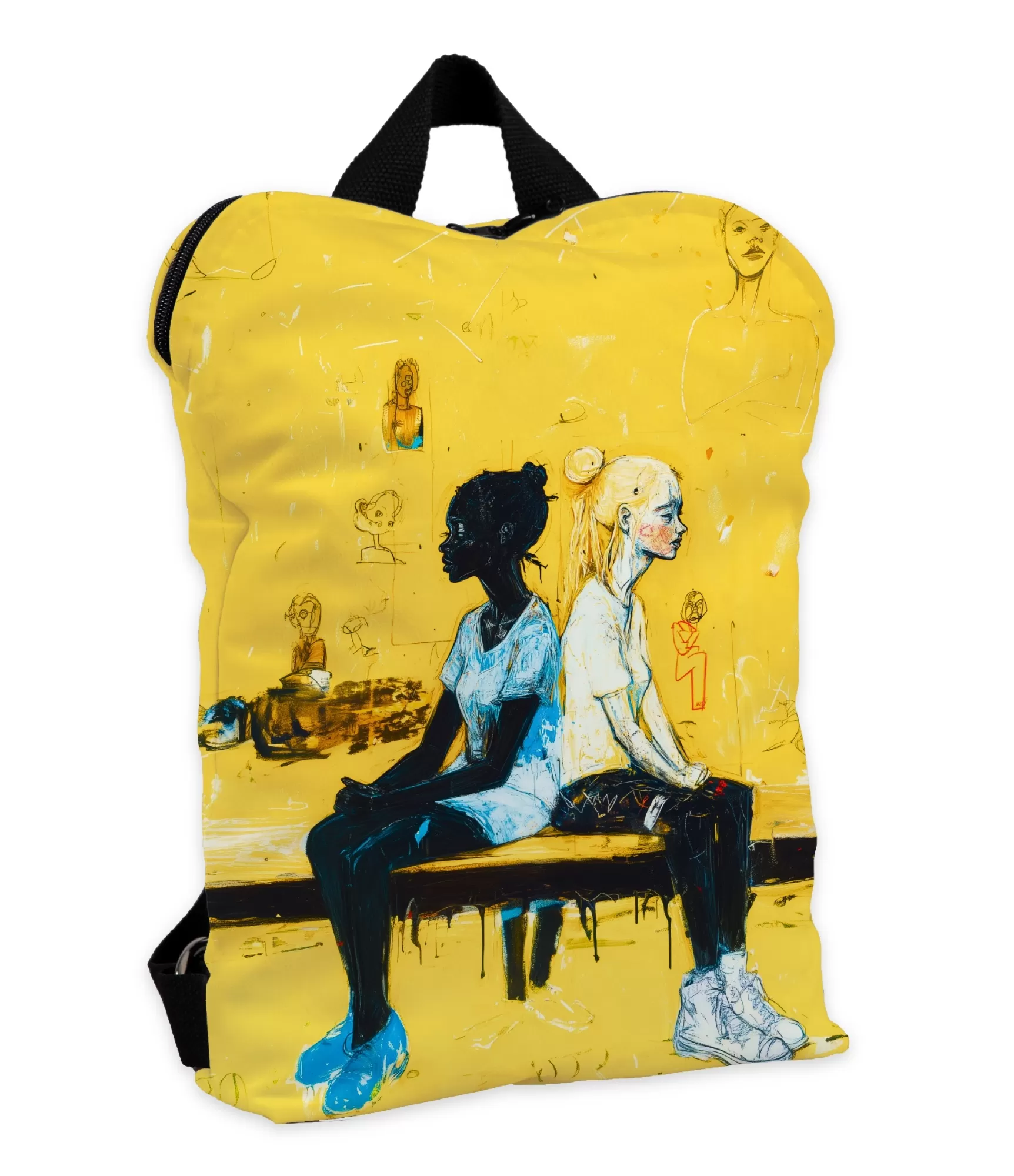 Ši unikali moteriška kuprinė išsiskiria ne tik ryškiu geltonu fonu, bet ir itin stipriu meniniu akcentu. Pagrindinis dizaino motyvas – dvi kontrastingos merginos, sėdinčios nugara viena į kitą. Viena jų – tamsaus gymio su mėlynais batais, kita – šviesiaplaukė, su baltu marškinėliu ir sportiniu bateliu. Jų siluetai nupiešti ekspresyviu, ekspresionizmo stilių primenančiu potėpiu, o aplink – eskizai ir piešiniai, tarytum primenantys kūrybinį dienoraštį ar dailės studijos sieną.