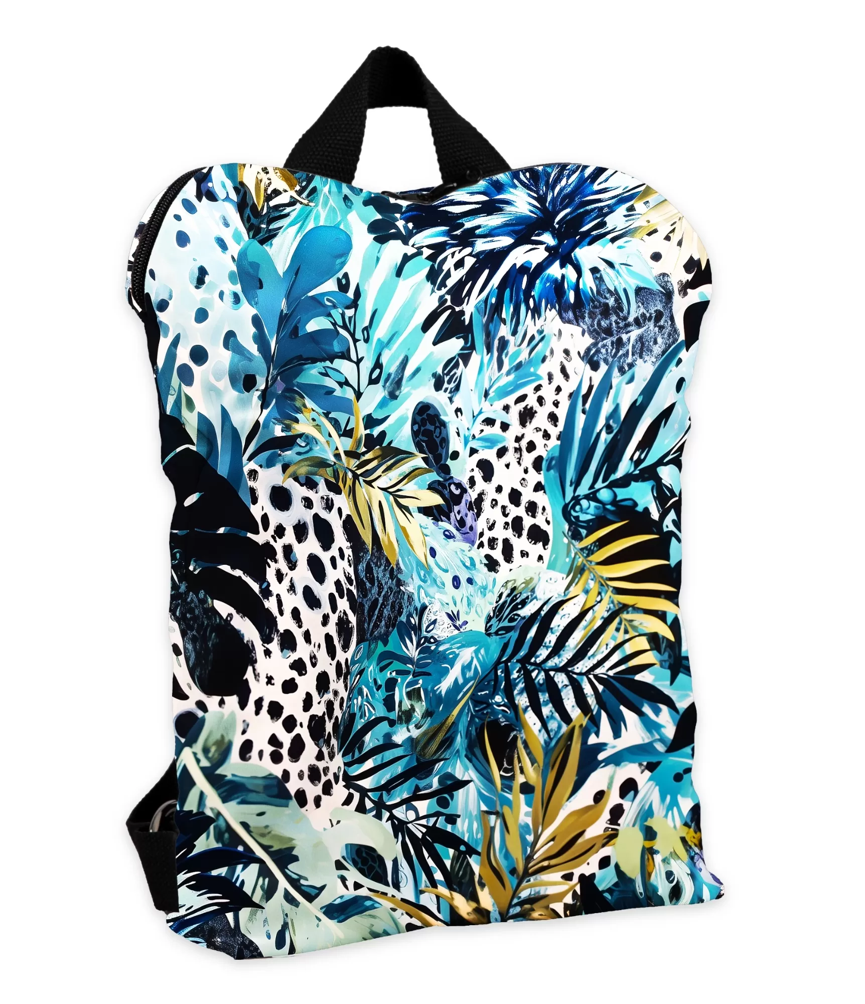Ši moteriška kuprinė – tai spalvų ir formų šventė, įkvėpta tropinių džiunglių motyvų. Pagrindinis kuprinės dizainas alsuoja sodriu spalvų pliūpsniu: ryškiai mėlyna, jūros žalia, juoda ir geltona susilieja į spalvingą, ekspresyvų raštą, kuriame susipina lapų siluetai, gyvūnų raštai ir taškeliai, primenantys gepardo kailį. Dizainas – tarsi gyvas paveikslas, kviečiantis į vasarišką kelionę po laukinę gamtą.