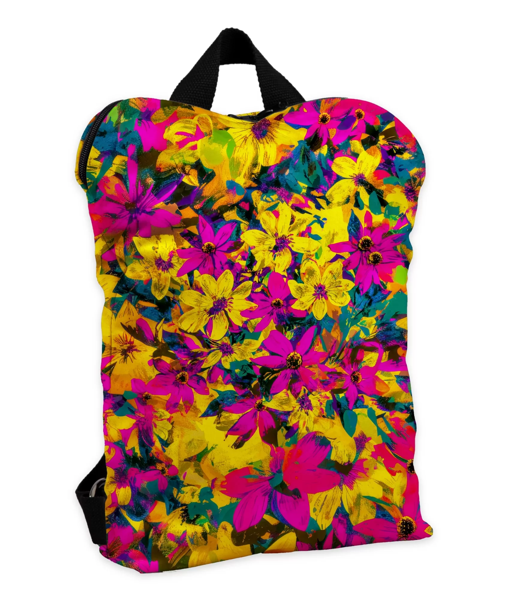 Ši kuprinė – tai ne gėlės, tai jų šokis. Ne tylus, ne romantiškas, o audringas, pilnas gyvenimo džiaugsmo ir vasariškos laisvės. Ryškiai geltonas fonas skleidžia šviesą lyg saulė vidurdienį, o ant jos – fuksinės, violetinės, mėlynos ir žalios gėlės įsiveržia į dieną be leidimo. Visa kompozicija primena ekspresyvią drobę, tapytą platų judesį turinčiais potėpiais. Tai kuprinė moteriai, kuri pasitinka pasaulį su energija ir spalvomis.