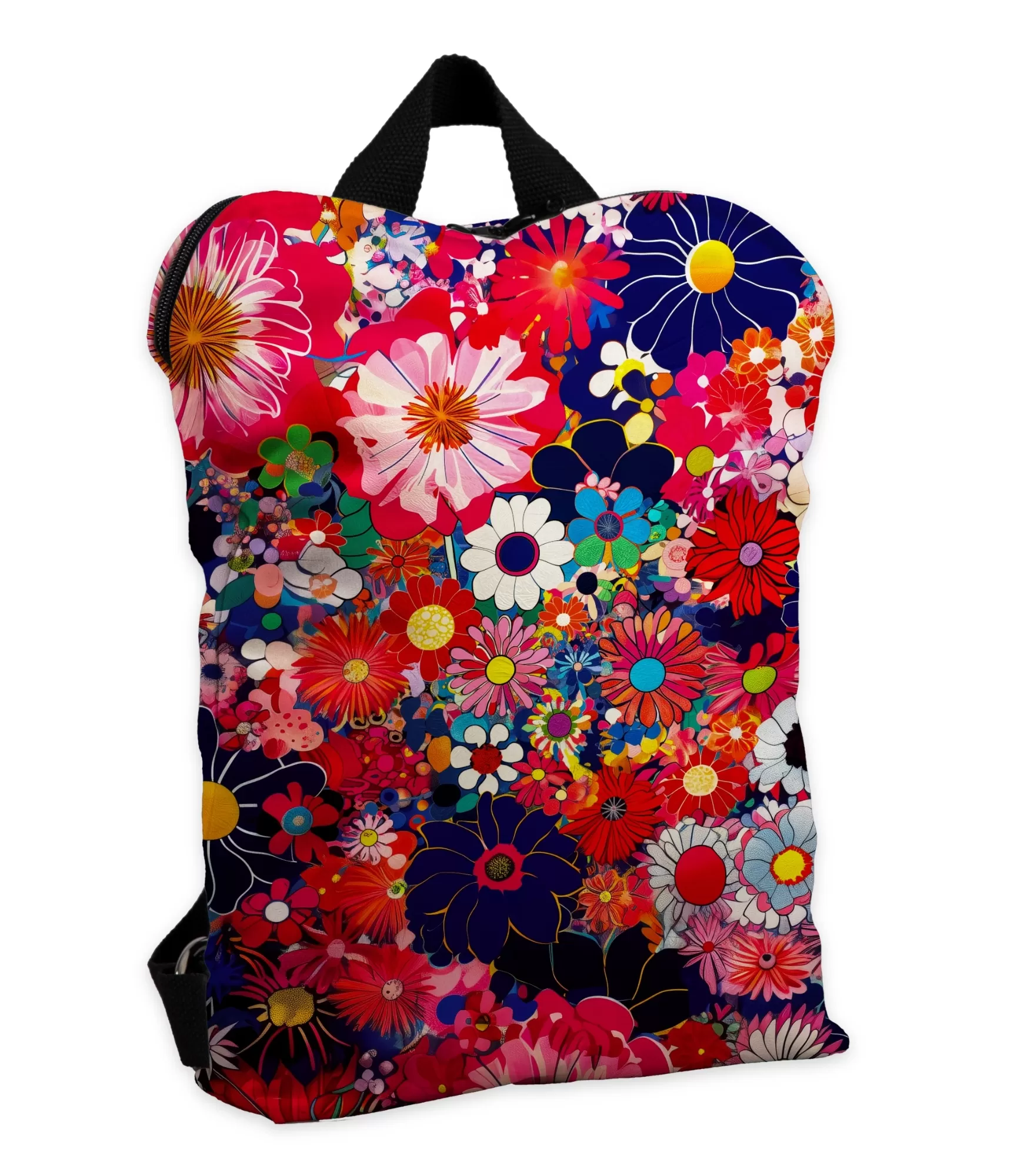 Ši kuprinė atrodo tarsi pavasario sprogimas spalvose – kiekviena detalė pulsuoja gyvenimu. Ant šviesaus, tačiau sodraus fono išryškėja gausybė gėlių, lyg tapytų drąsiais, plačiais potėpiais. Melsvos, rožinės, geltonos ir raudonos žiedų dėmės kuria savotišką šokį – jos nesistengia būti simetriškos ar ramios, jos gyvena savo ritmu. Gėlės atrodo lyg nukritusios nuo dailininko paletės, dar šiltos, dar gyvos. Būtent šis kūrybinis chaosas ir žavi – kuprinė tampa ne tik praktišku aksesuaru, bet ir nuotaikos manifestu. Ji tarsi pasako, kad šis rytas bus tavo, kad diena priklauso tau, kad nieko neverta slopinti – nei spalvų, nei emocijų. Ir kai ją nešioji, imi pastebėti: žmonės atsisuka, nusišypso, lyg ir jų dieną paliestų tavo asmeninis spalvų debesis.