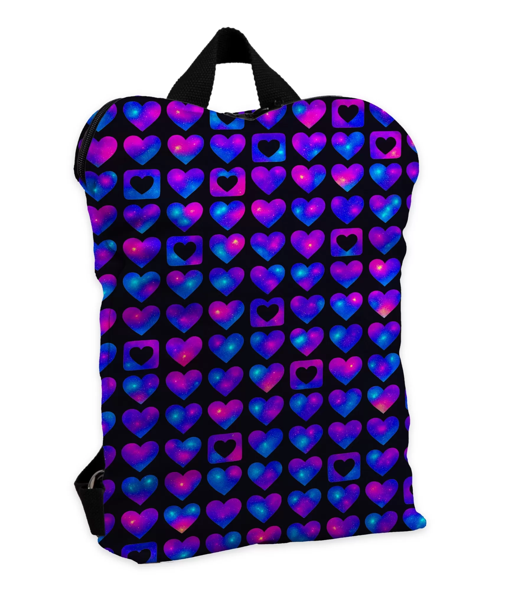 Rožinės, mėlynos ir violetinės spalvos pulsuoja lyg širdies plakimas šioje kuprinėje – ji tarsi sukurta tiems, kurie mėgsta ryškumą ir emociją. Tamsus fonas kontrastuoja su įvairiaspalvėmis širdelėmis, kur kiekviena jų – tarsi maža galaktika, spindinti savitu švytėjimu. Įrėmintos širdelės kvadratėliuose suteikia dizainui netikėtumo ir modernumo, o visa kompozicija sukuria optiškai žaismingą efektą, kuris traukia akį. Ši kuprinė – ne tik daiktų nešimo priemonė, bet ir asmenybės išraiška.