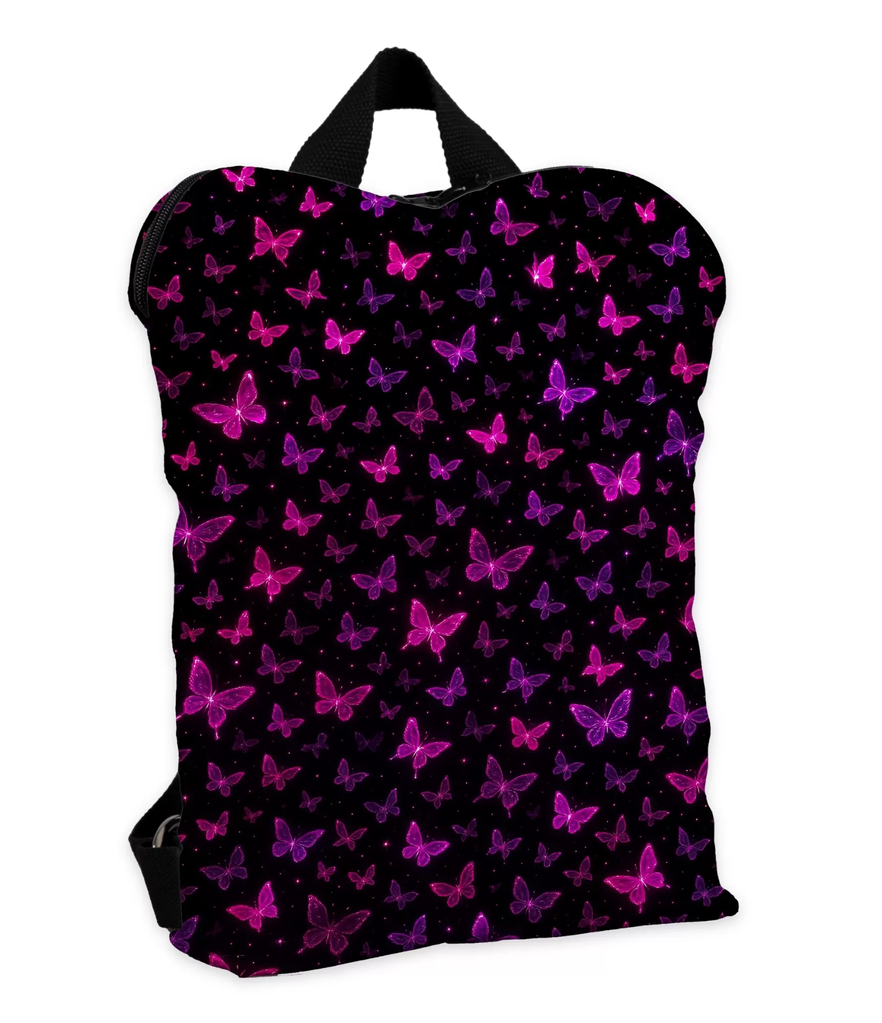 Ši kuprinė sužavi iš pirmo žvilgsnio – sodriai juodame fone lyg danguje sužimba šimtai violetinių, fuksinių ir purpurinių drugelių. Kiekvienas jų švyti lyg maža žvaigždė, išsiskleidusi nakties ore. Šis dizainas neša savyje lengvumo, laisvės ir šiek tiek magijos jausmą – tai lyg vizualinė poezija, kurią norisi nešioti kasdien. Drugeliai sklando lyg sapne, kur kiekvienas jų tarsi mažas pasakojimas apie grožį, trapumą ir švytėjimą net tamsiausiame fone. Juodame pagrinde susilieja gilus fonas ir ryškus dizainas – tai ideali kuprinė, ieškančiai ne kasdienybės, bet išraiškos.