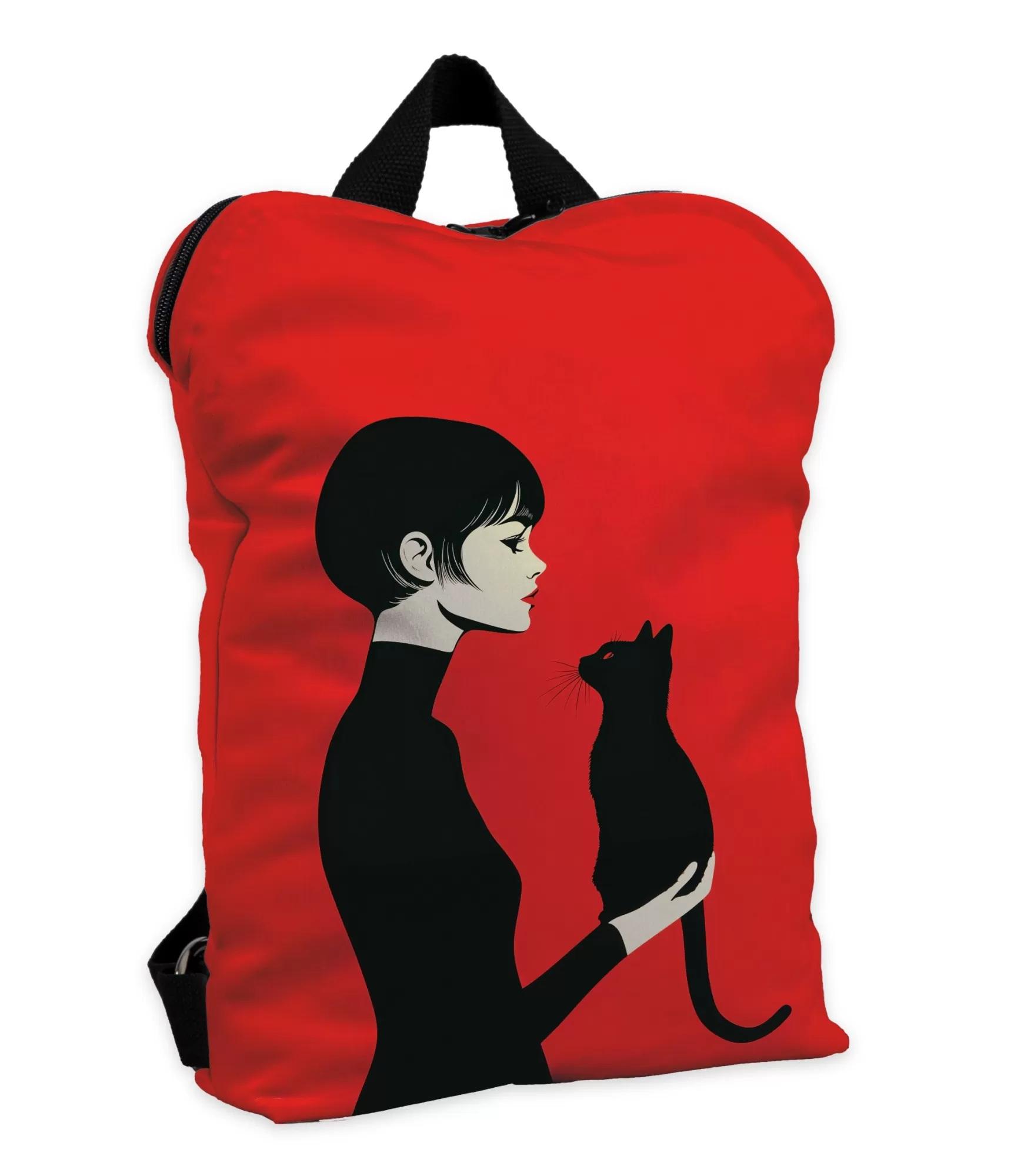 Ši moteriška kuprinė nepaliks abejingų – intensyvi raudona spalva, kontrastuojanti su minimalistiniu juodos spalvos siluetu, paverčia ją tikru dizaino pareiškimu. Priekinėje pusėje pavaizduota jauna moteris, kurios žvilgsnis susitinka su juodu katinu – abu sustingę akimirkoje, pilnoje tylos, artumo ir netikėtos paslapties. Tai ne tik aksesuaras, bet ir nedidelis meno kūrinys, skirtas toms, kurios nebijo išsiskirti.