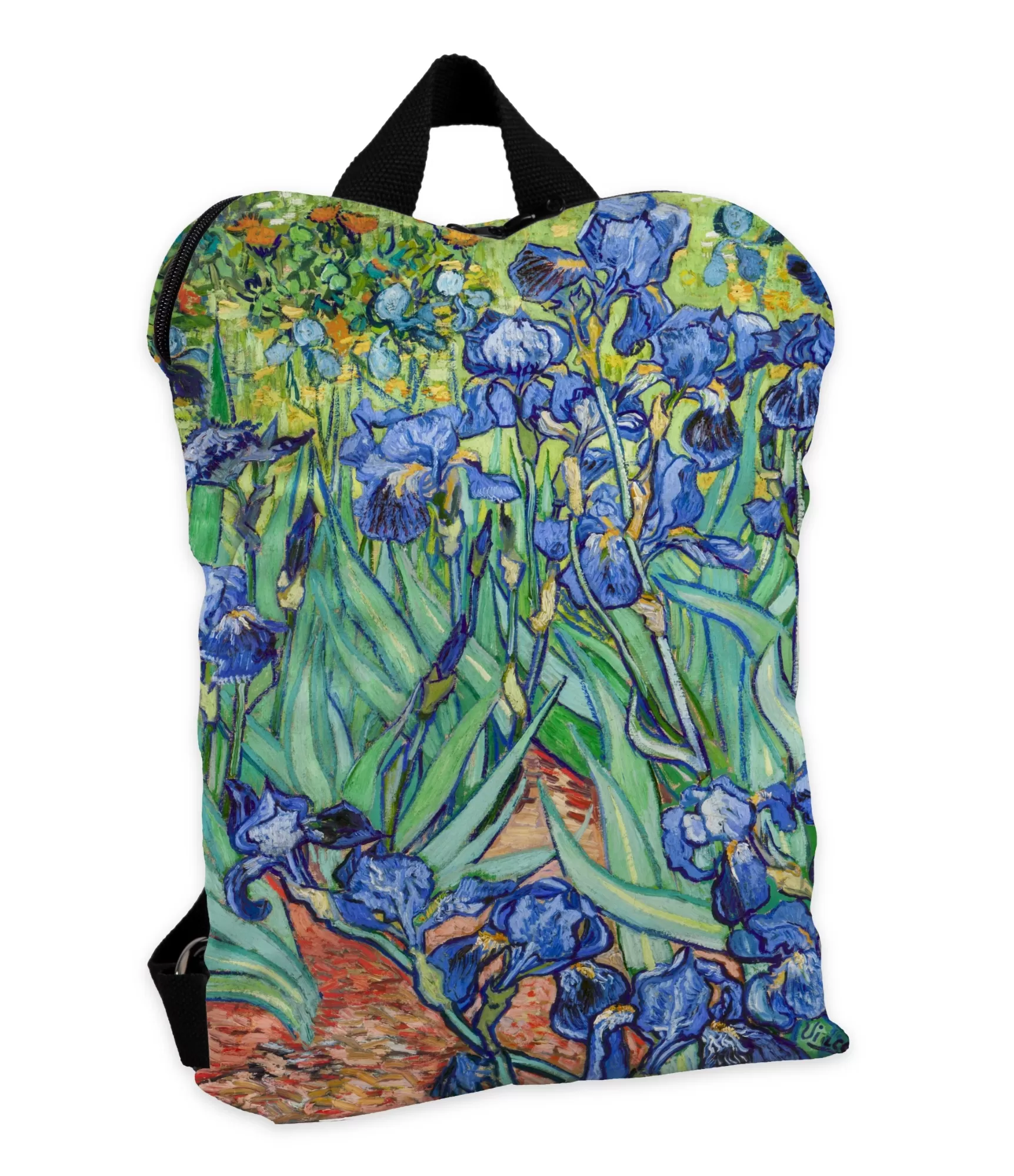 Ši kuprinė nėra tik aksesuaras – tai išraiškinga meno forma, kurią gali nešiotis ant pečių. Vincent van Gogh „Irisai“, nutapyti 1889 metais, čia įgauna naują gyvenimą. Sodrus violetinių žiedų sūkurys žalioje fone perteikia kūrybinę laisvę, gyvybingumą ir vidinę stiprybę. Tai vaizdas, kuris kalba garsiau nei žodžiai – drąsus, ekspresyvus, kupinas jausmo.