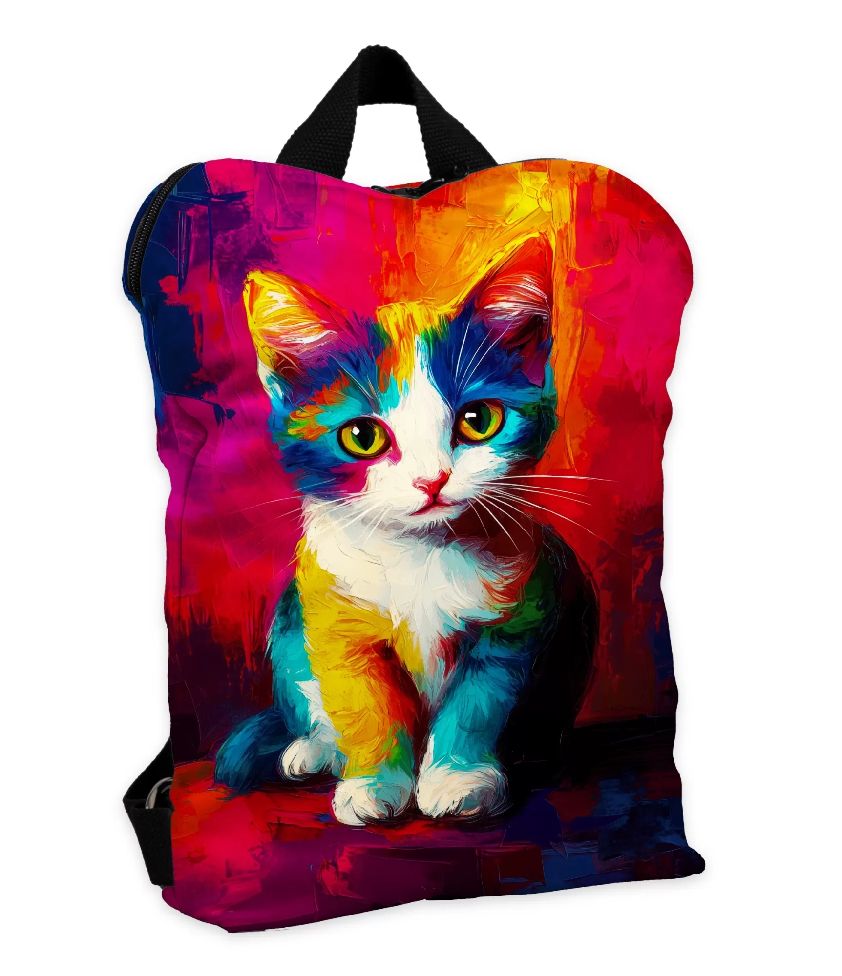 Ši kuprinė – tai ne tik aksesuaras, o drąsus spalvų šūksnis kasdienybėje. Joje – žaismingai nupieštas katinas, primenantis meno galerijos eksponatą: su ryškiomis geltonomis, mėlynomis, rožinėmis ir žaliomis spalvomis, kurios tarsi liejasi ant drobės, gyvybingai perteikdamos judesį ir emociją. Katinas žvelgia tiesiai į tave – smalsiai, pasitikinčiai ir truputį išdykėliškai. Jis tampa ne tik dizaino akcentu, bet ir nuotaikos kūrėju.